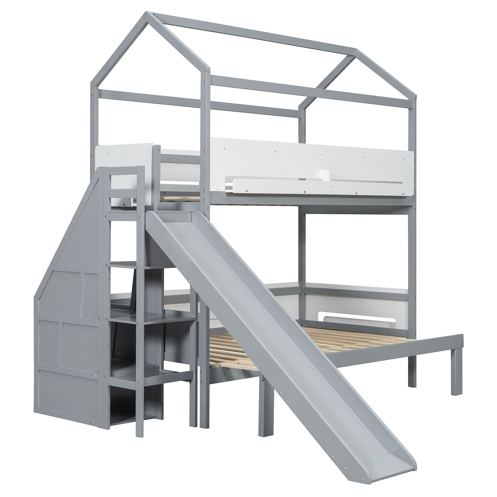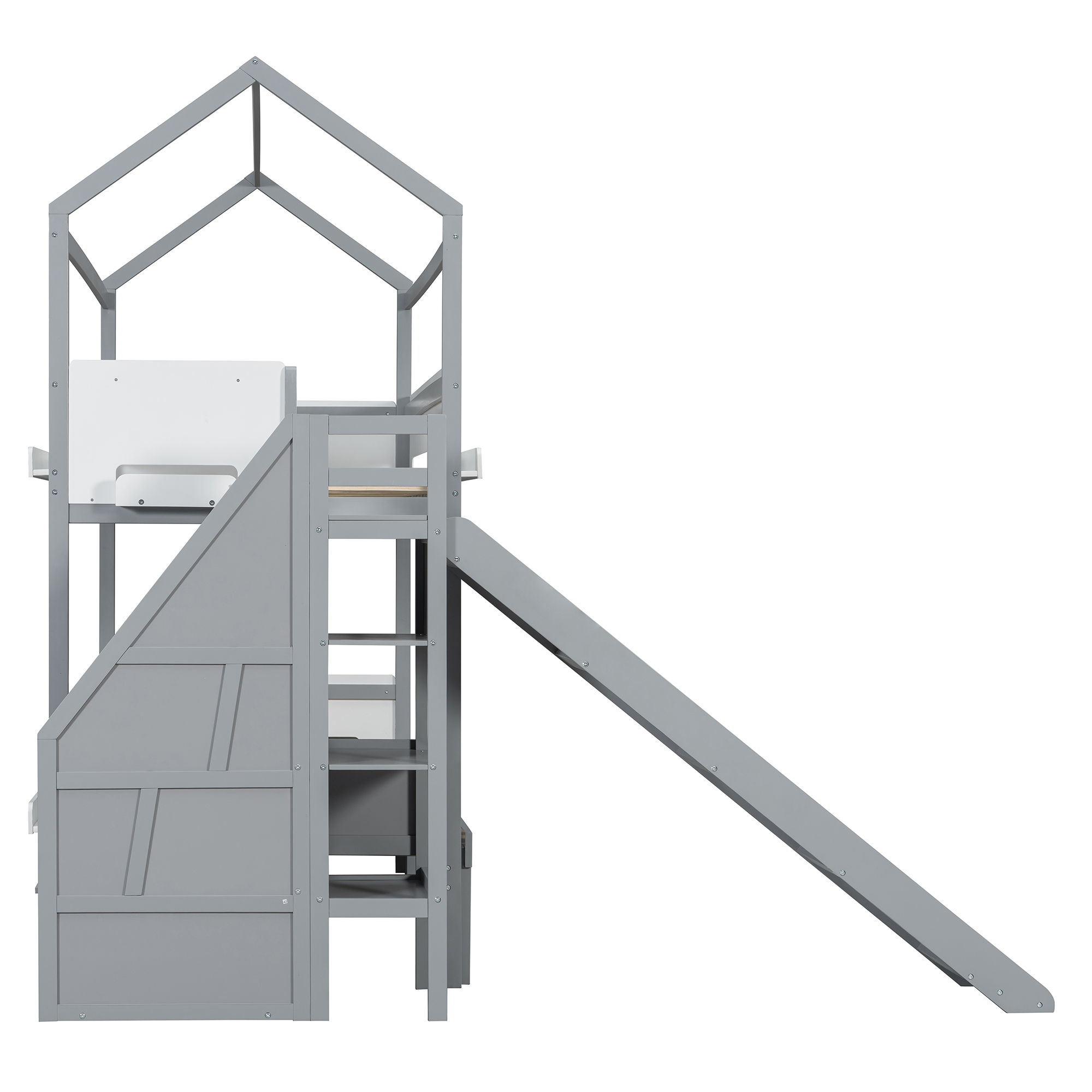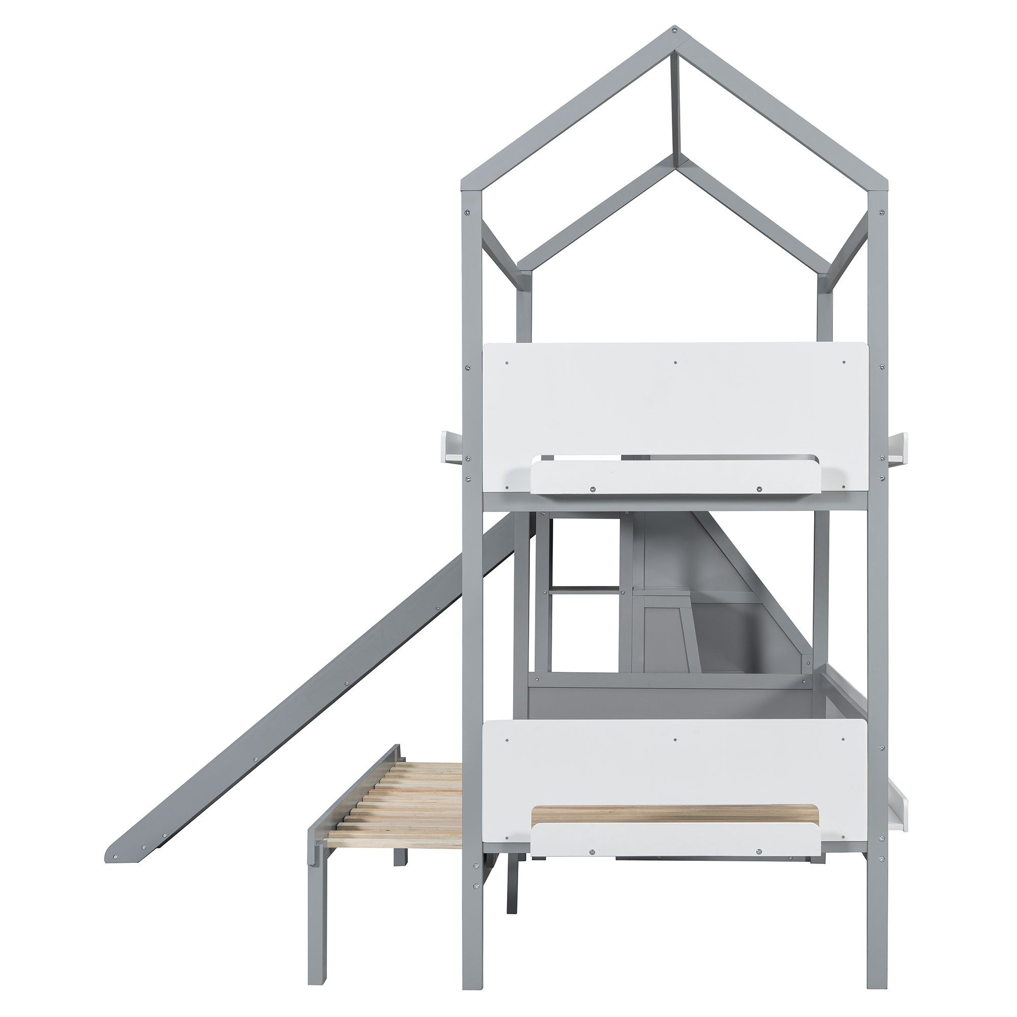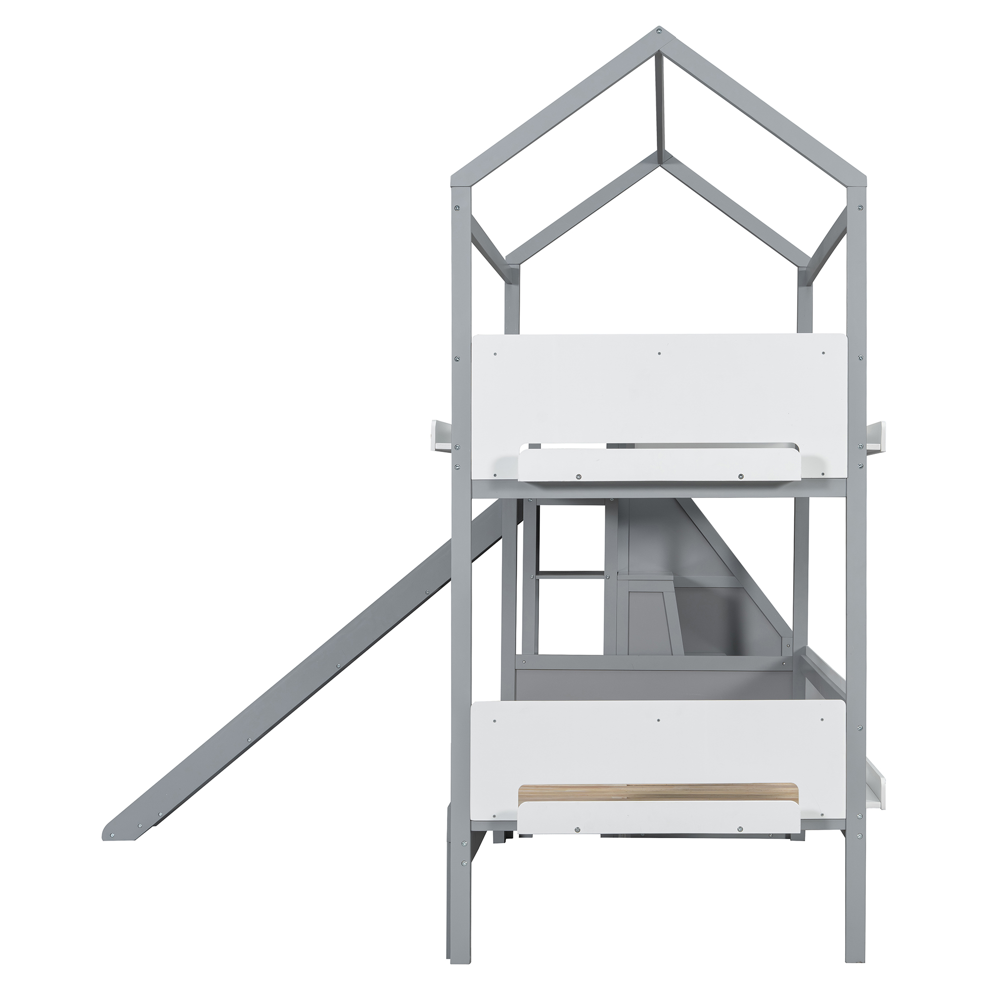 House-Shaped Wooden Bunk Bed with Slide & Storage Staircase
