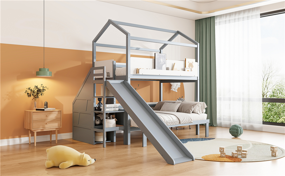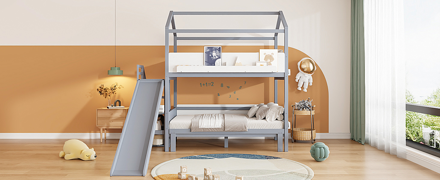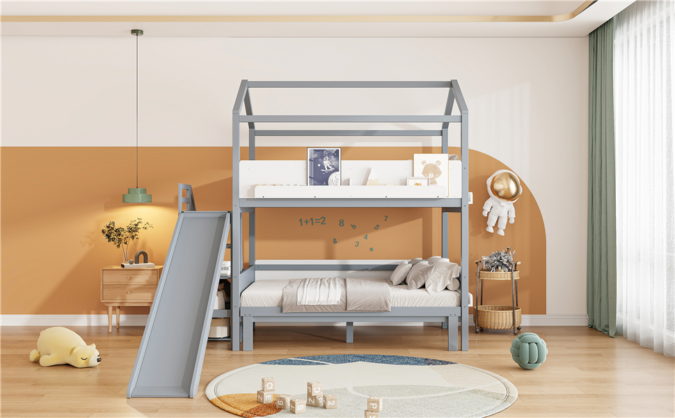 Bring both function and fun into your child’s bedroom with this thoughtfully designed wooden bunk bed. Crafted with a unique house-inspired frame, it not only provides a comfortable sleeping solution but also sparks creativity and imagination. The upper bunk offers a cozy twin-size space, while the lower bed can be adjusted from twin to full size, adapting effortlessly as your child grows.