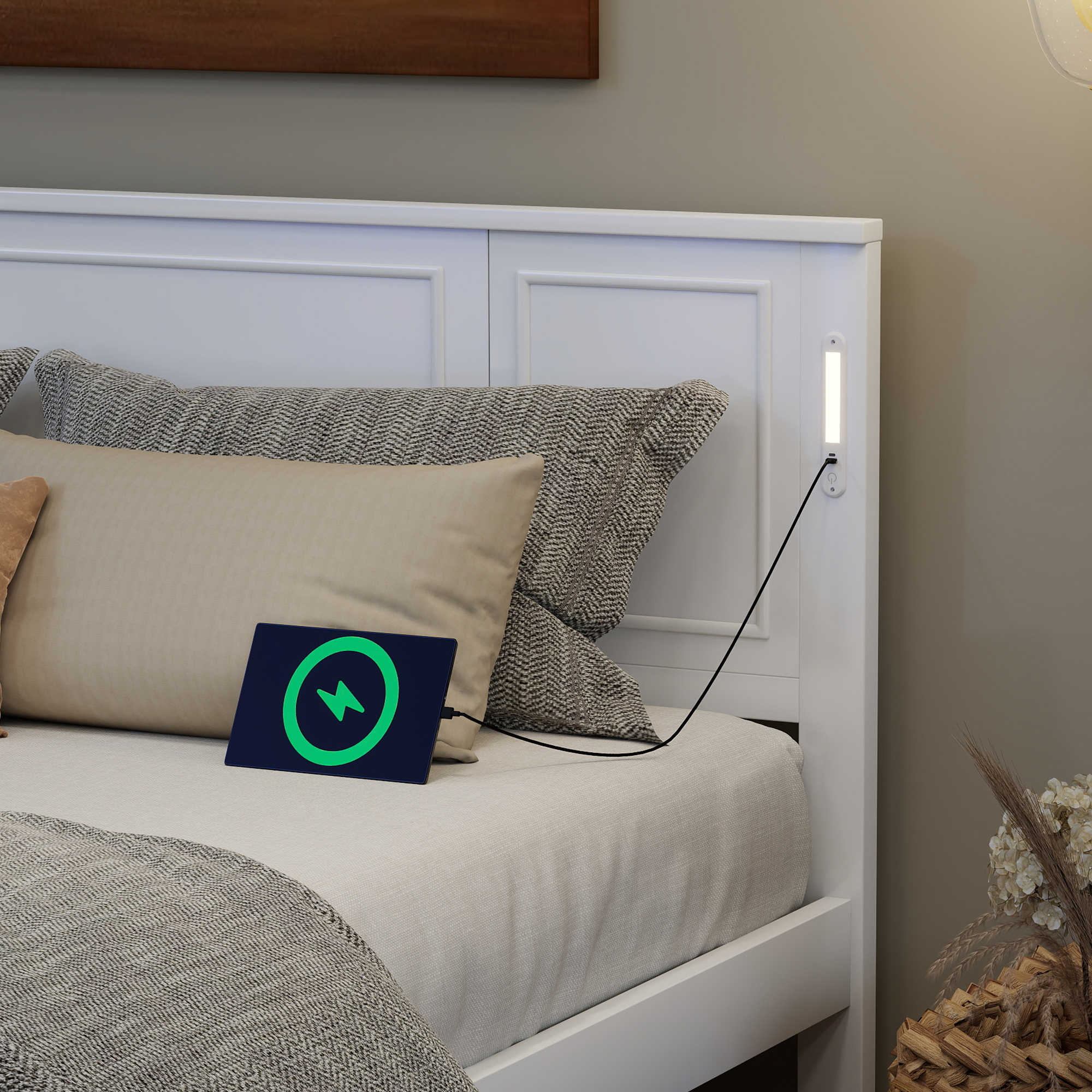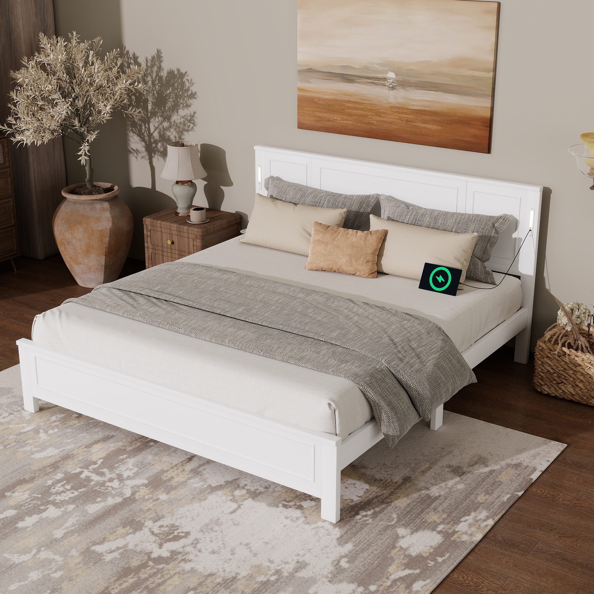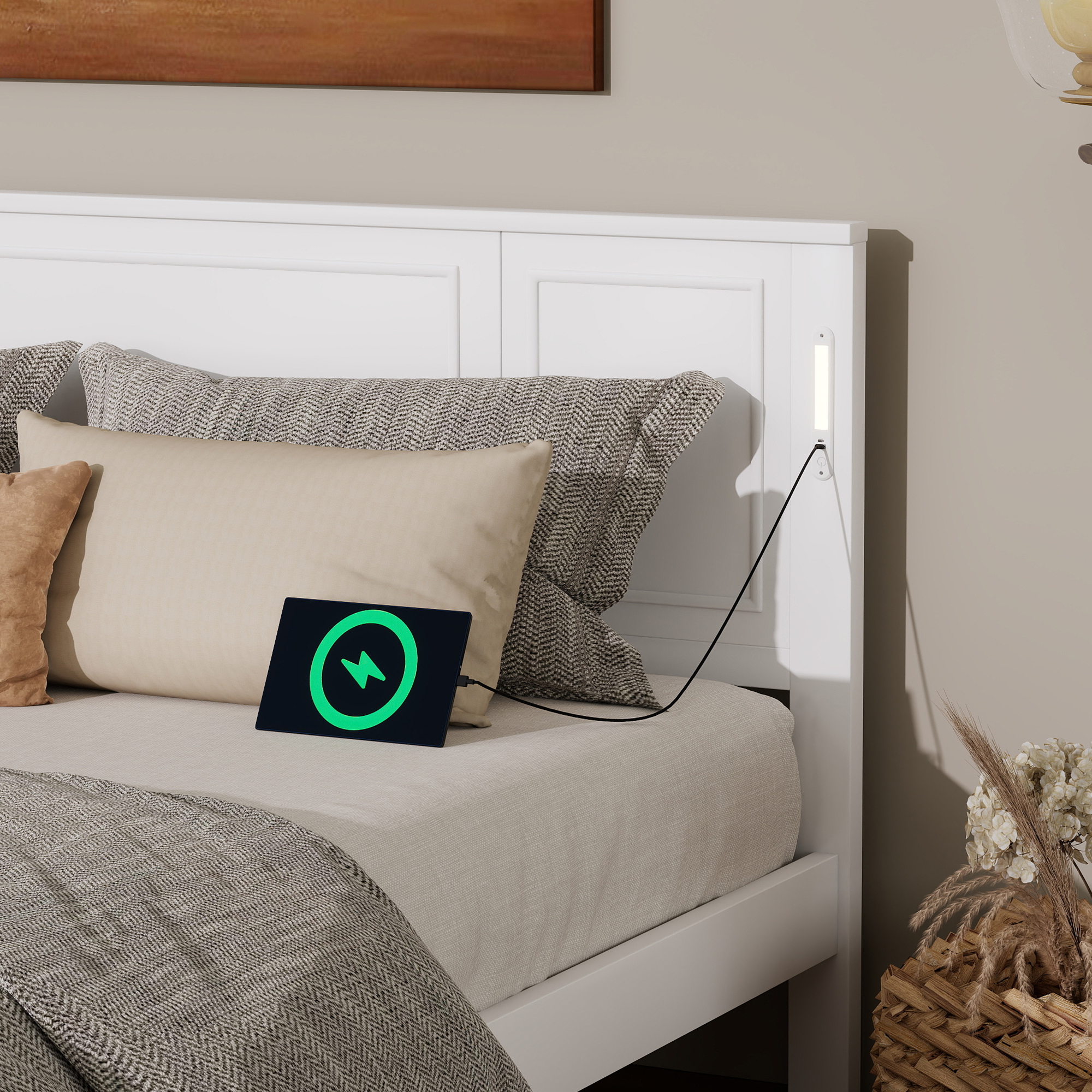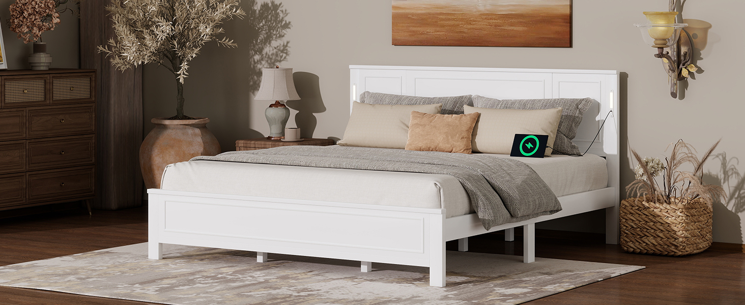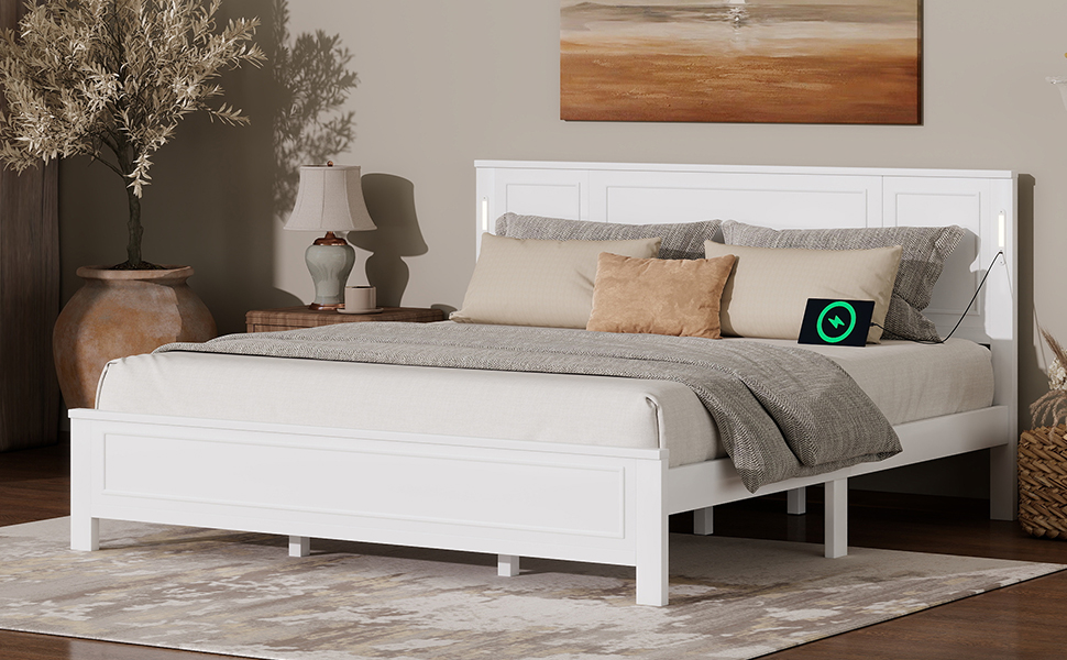 - [USB Charging Station & LED Light] The elegantly designed headboard features an innovative built-in function bar that seamlessly combines smart LED lights of adjustable brightness controls with dual charging station (1 USB, 1 Type-C port) on each side of the headboard for cozy and convenient reading and device charging, keeping the area organized and clutter-free.