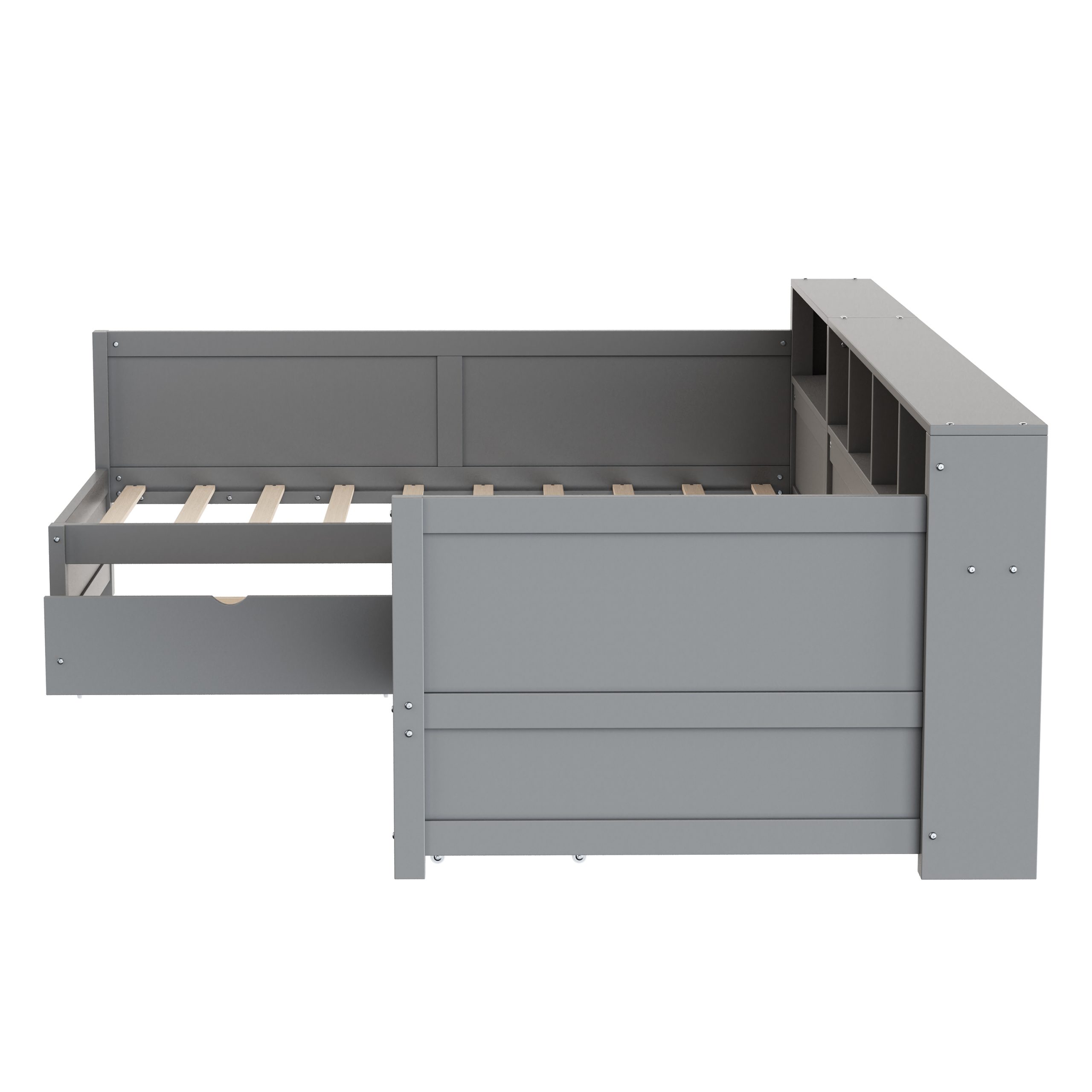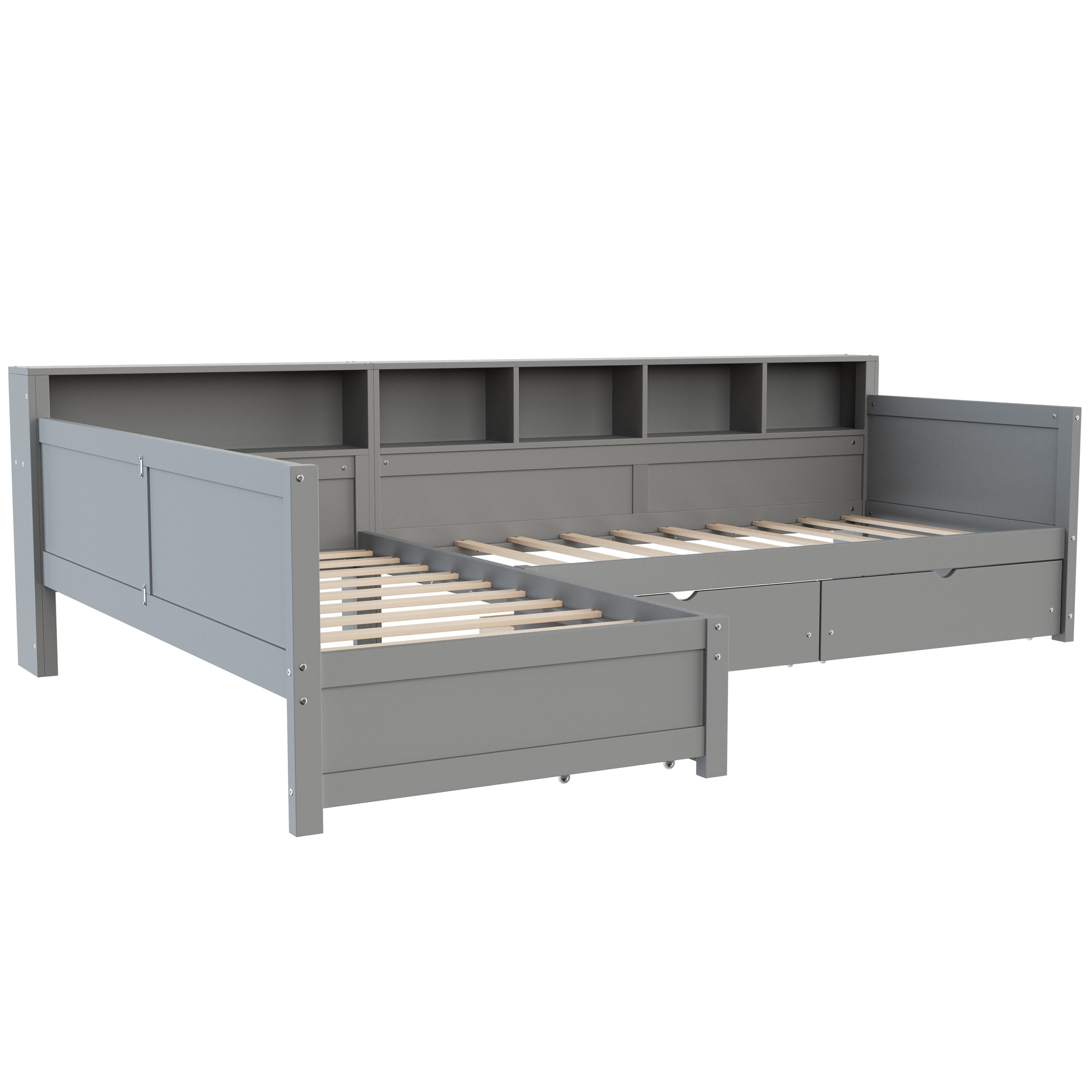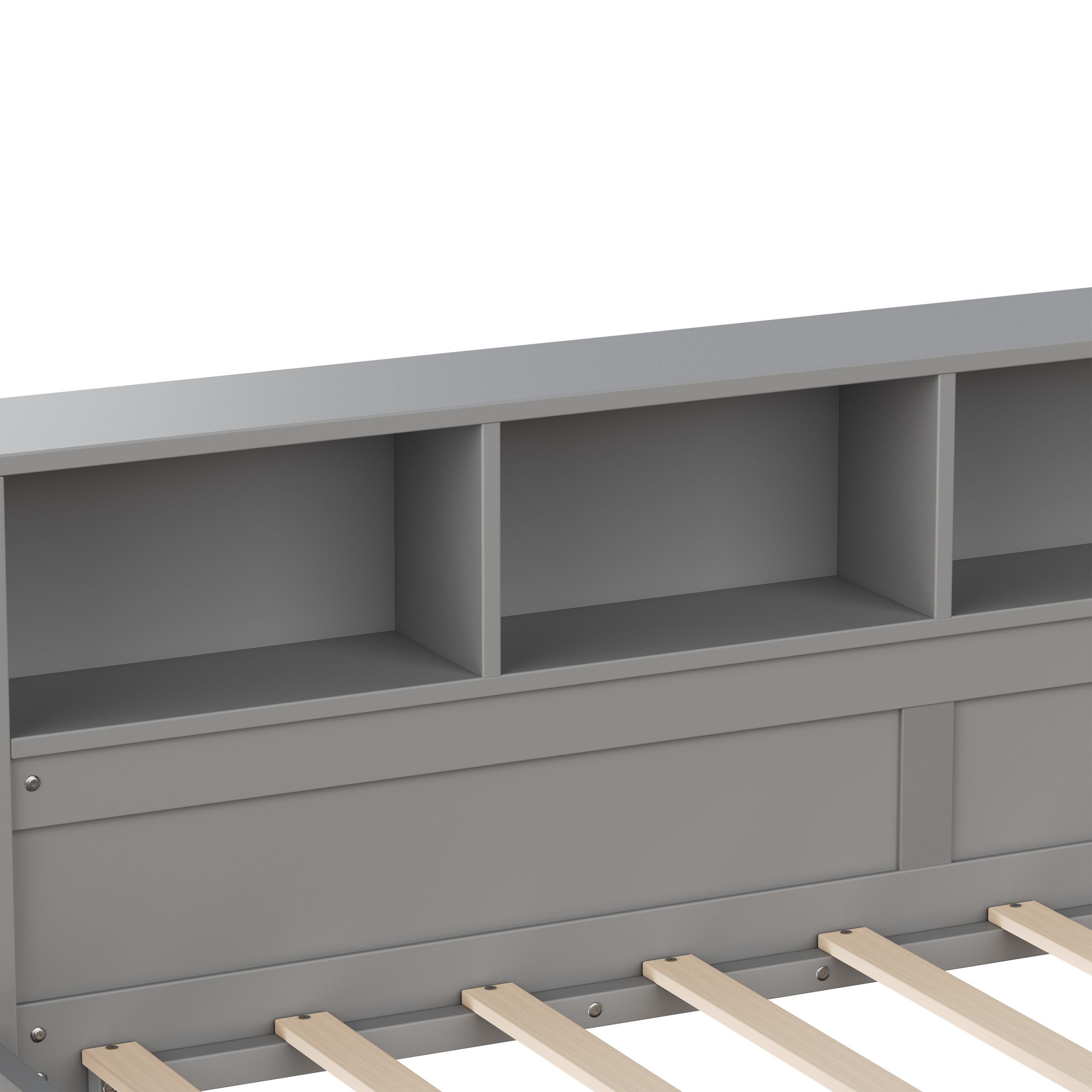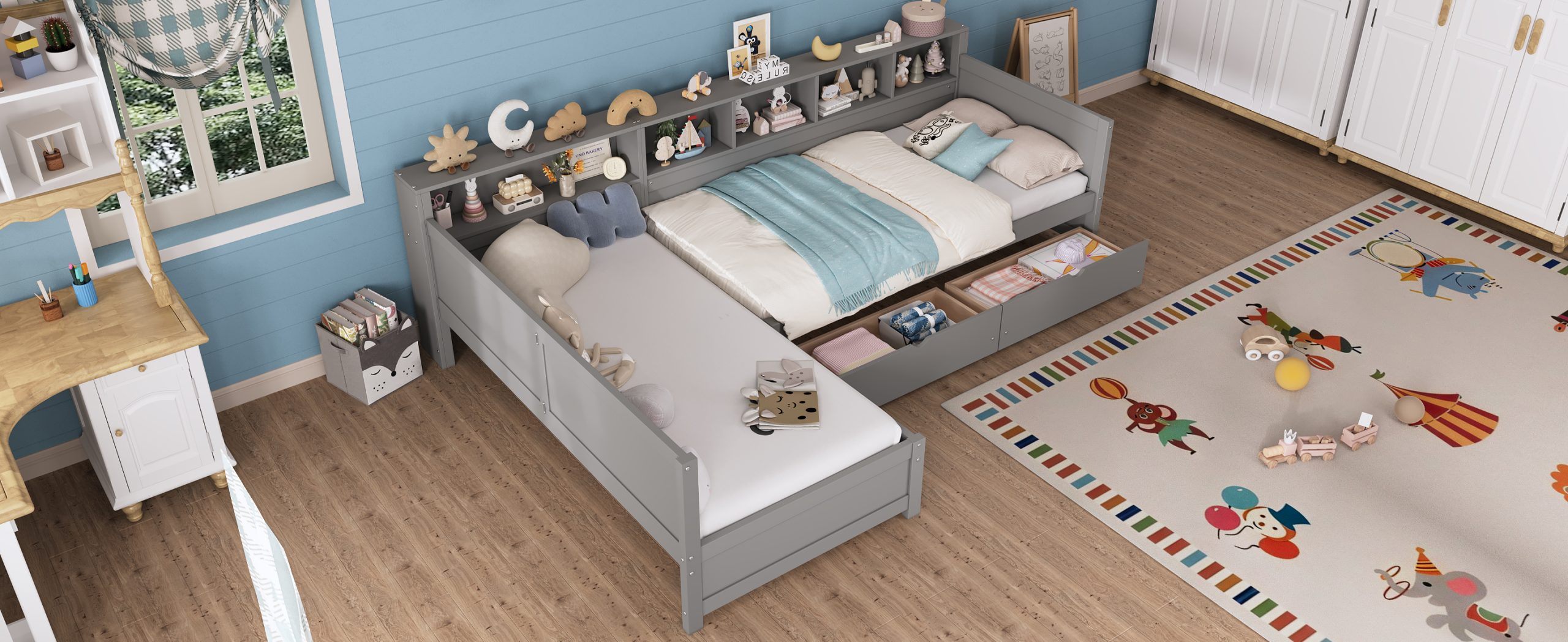 - [Twin Size Bed Frame with Bookshelf] This daybed features an integrated bookshelf that adds generous storage to your space. The shelf is divided into 5 sections, including 4 equal-sized compartments plus 1 extended compartment, giving you flexible room for items of different shapes and heights. Whether it’s books, decor, or daily essentials, everything can be neatly organized and easy to access, making your room feel both functional and visually balanced.