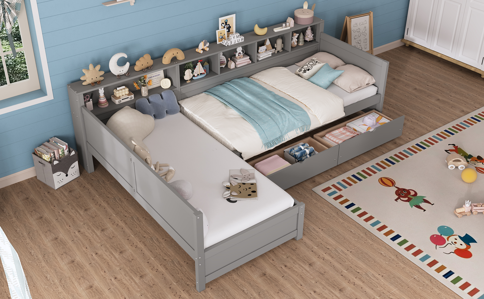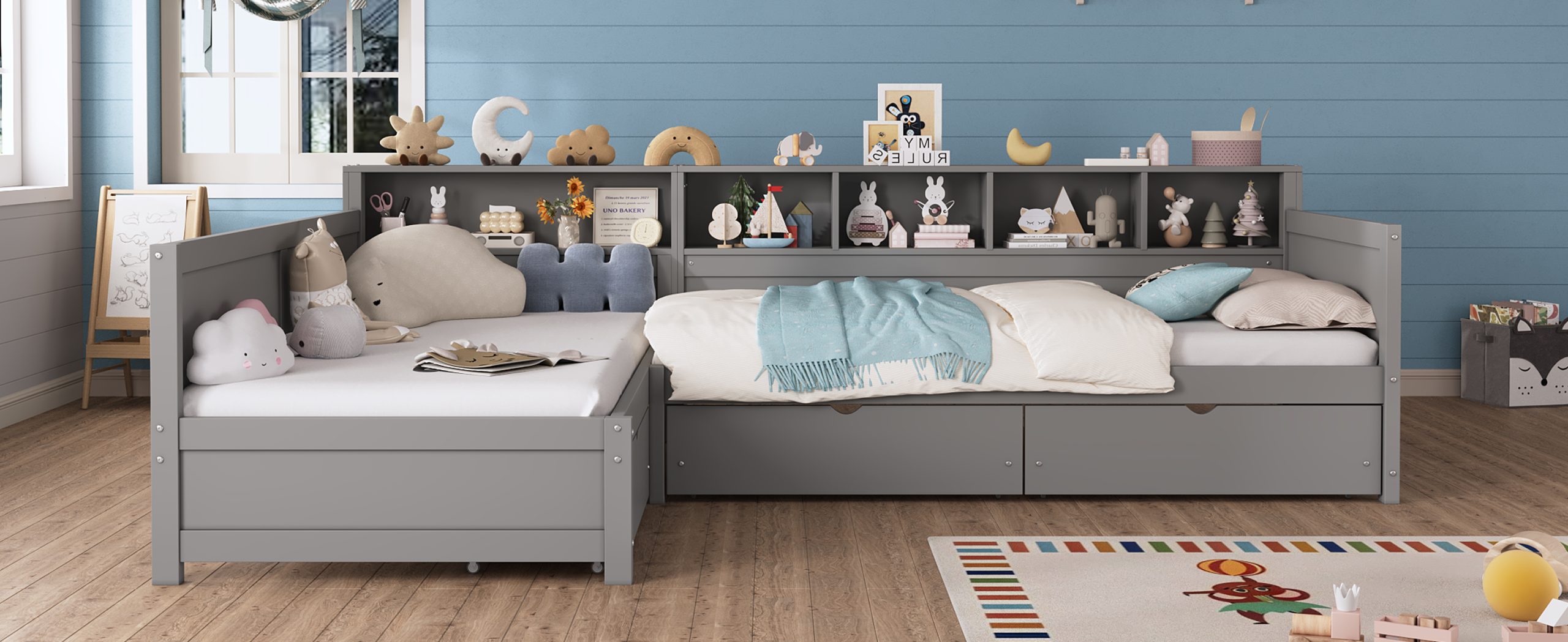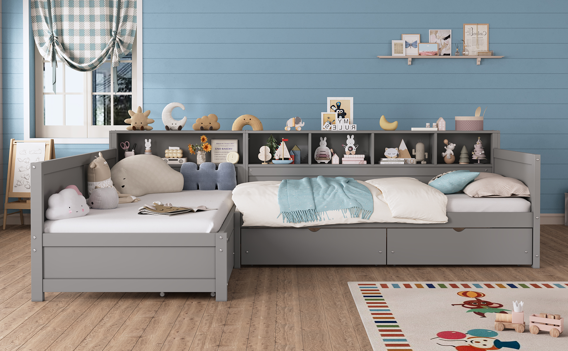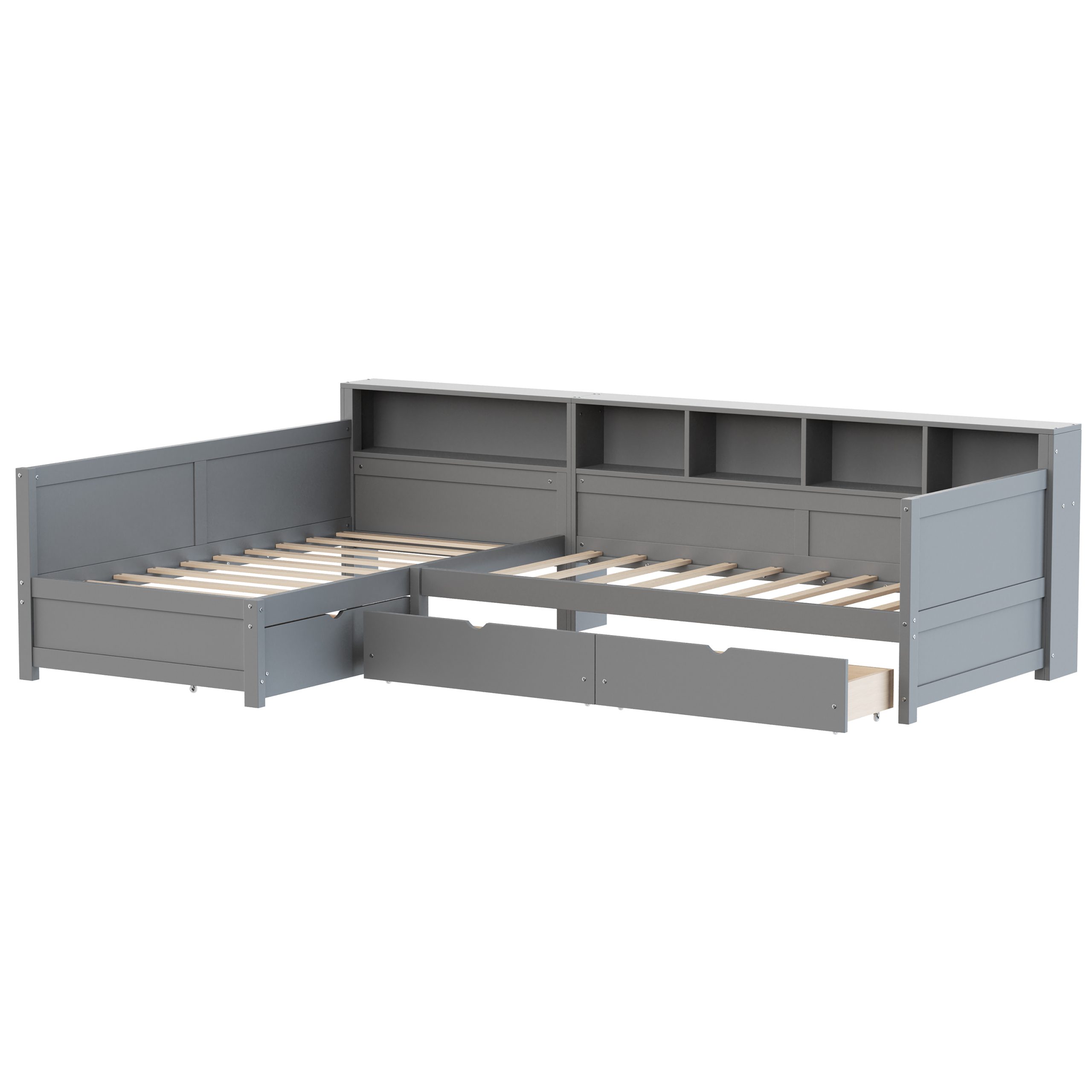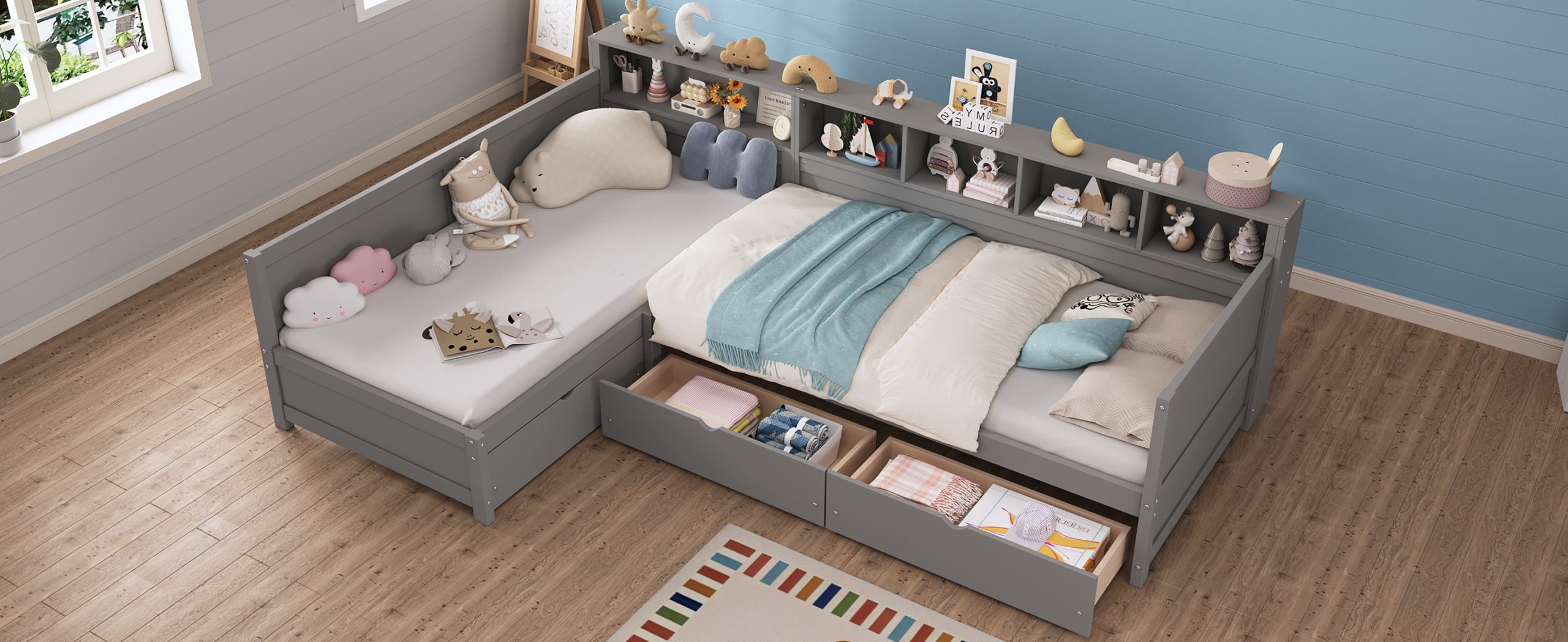 - [Twin Size Bed Frame with Bookshelf] This daybed features an integrated bookshelf that adds generous storage to your space. The shelf is divided into 5 sections, including 4 equal-sized compartments plus 1 extended compartment, giving you flexible room for items of different shapes and heights. Whether it’s books, decor, or daily essentials, everything can be neatly organized and easy to access, making your room feel both functional and visually balanced.