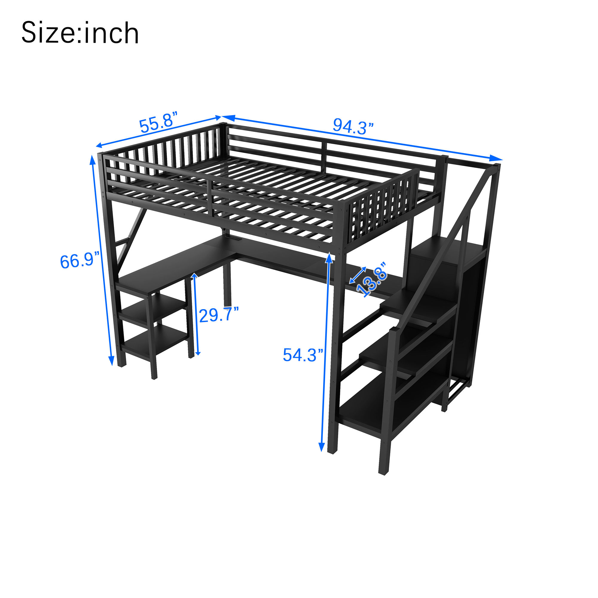 - [Loft Bed with Storage and Desk]: Our full loft bed frame with desk and storage shelves for kids is great for making extra room in a small bedroom. This functionality loft bed includes a L shape desk and built with 2 shelves under the desk and has 54.3” of under-bed clearance, the raised base creates a cozy space for storage, study or play to make the most of your space.