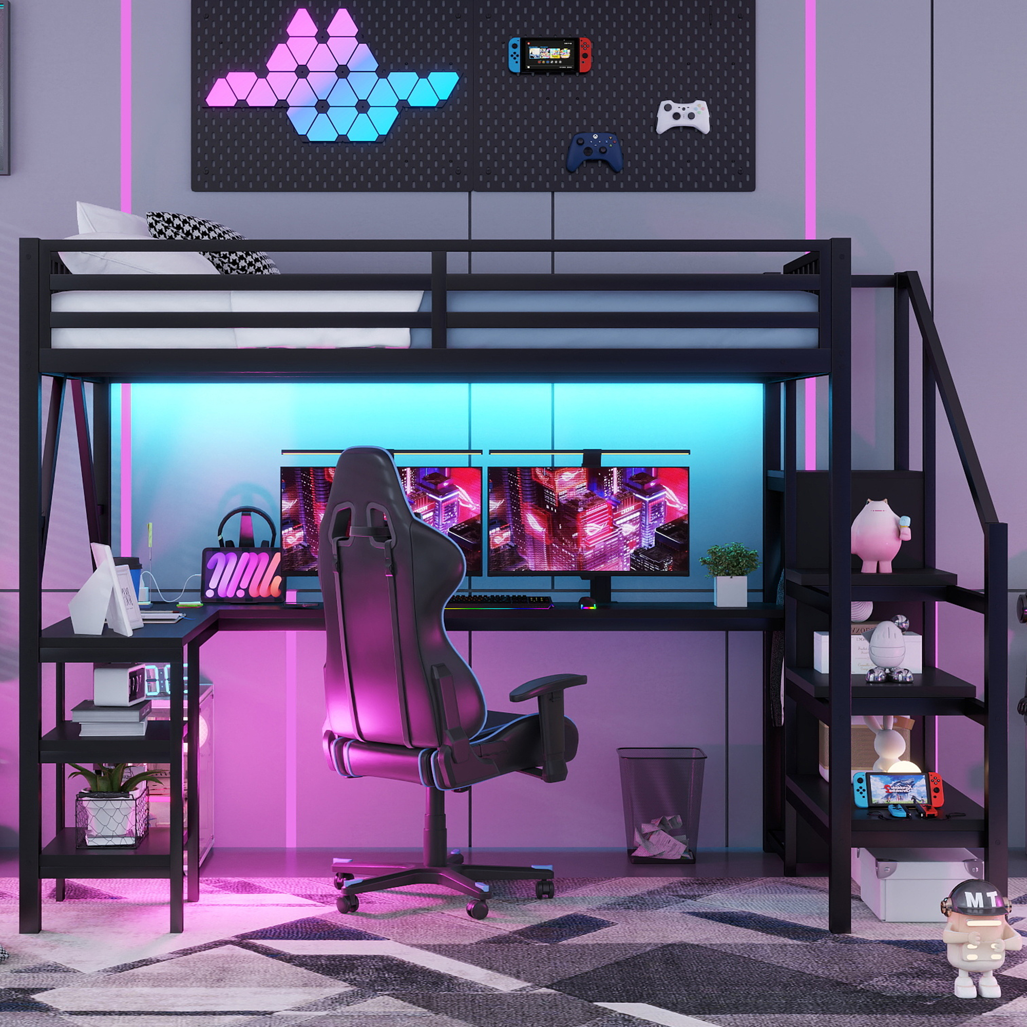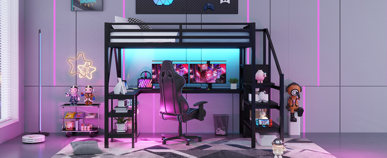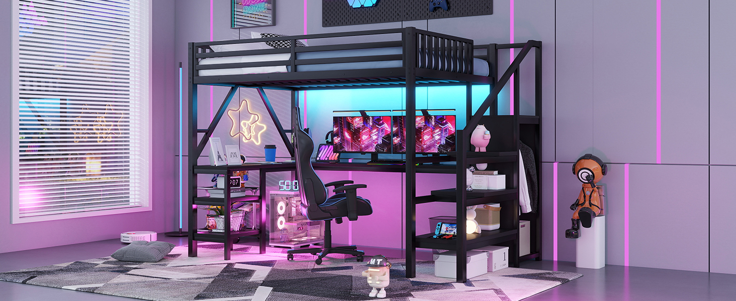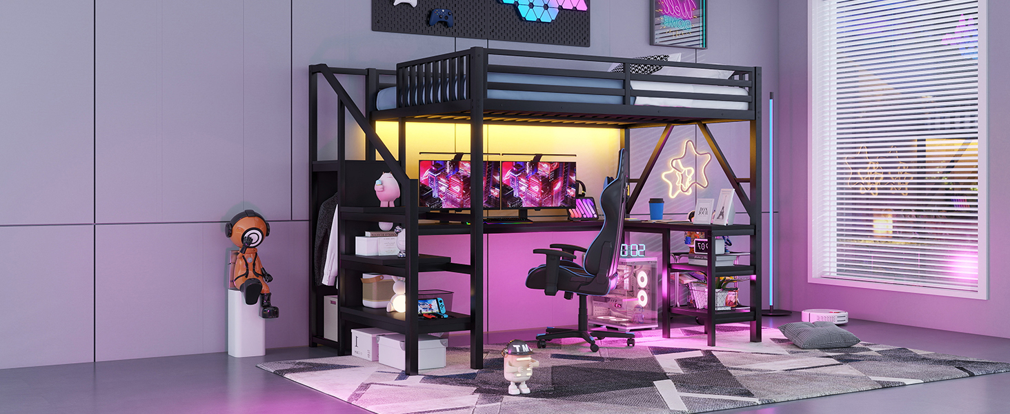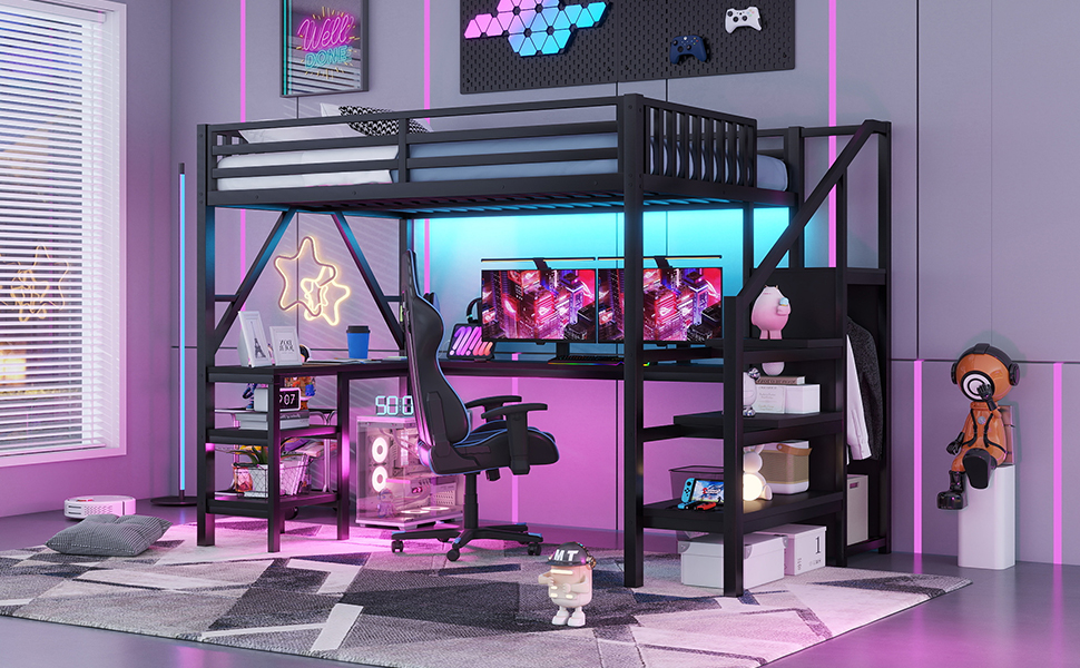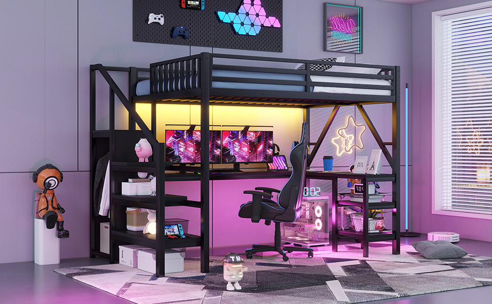 - [Loft Bed with USB and LED]: The full size loft bed comes with a USB charging station for charging electronics that is convenience to your daily life. The LED light with a remote control offers 16 static colors and speed adjust and brightness adjust provide personalized lighting atmosphere for your night.