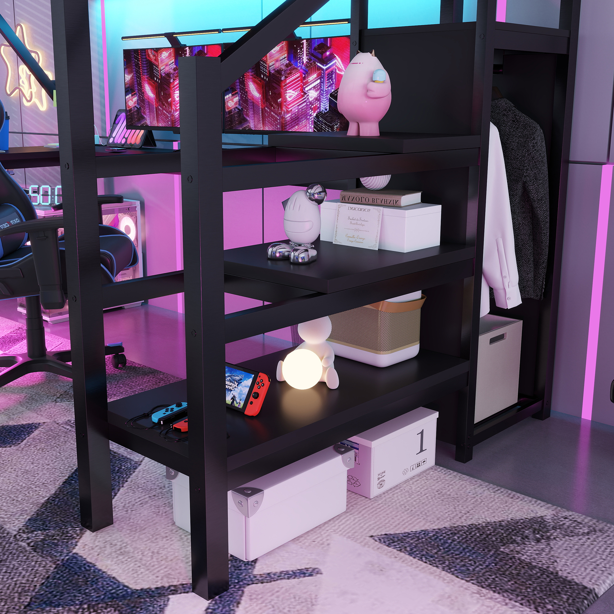 - [Storage Wardrobe and Staircase]: The lateral stairs of the full size loft bed can be used as shelves to lay out home items for you. And the wardrobe underneath the steps with hanging rod and an adjustable divider at the bottom which offer you space to store everyday clothes. It will definitely save plenty of space for you.