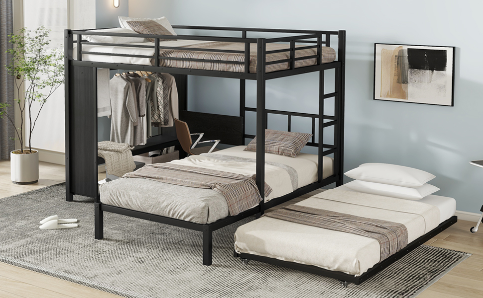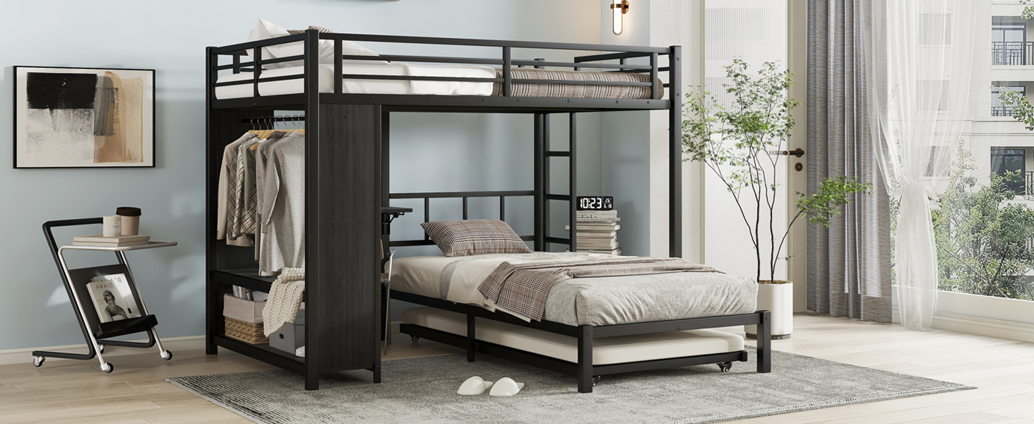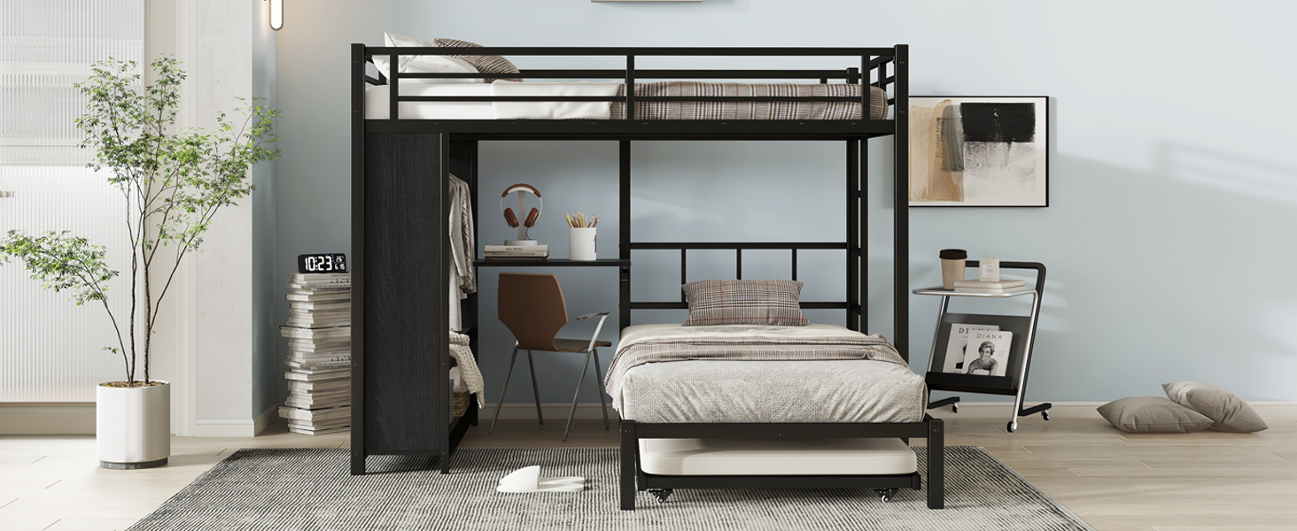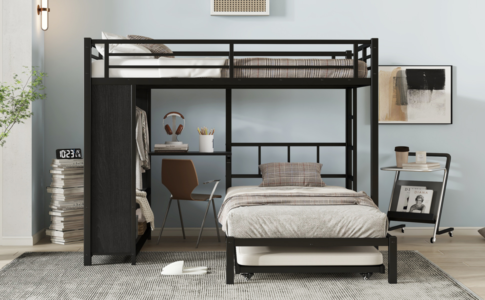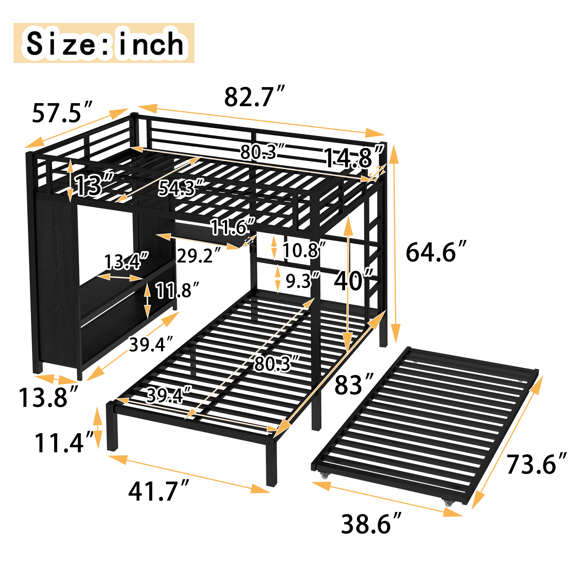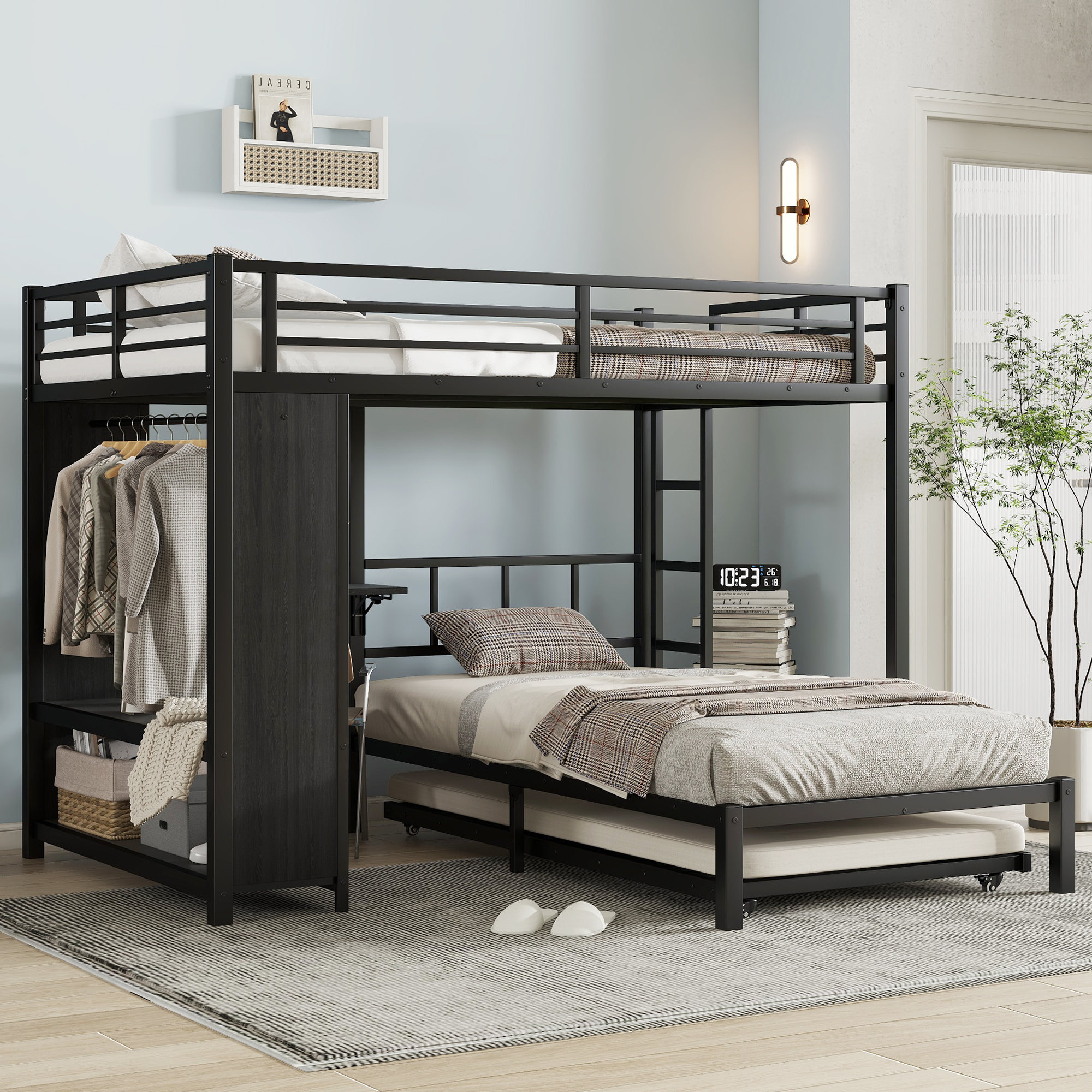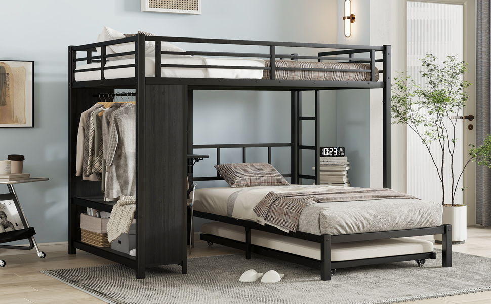Metal Full Over Twin Bunk Bed With Built-in Wardrobe, Trundle, Foldable Desk, Ladders