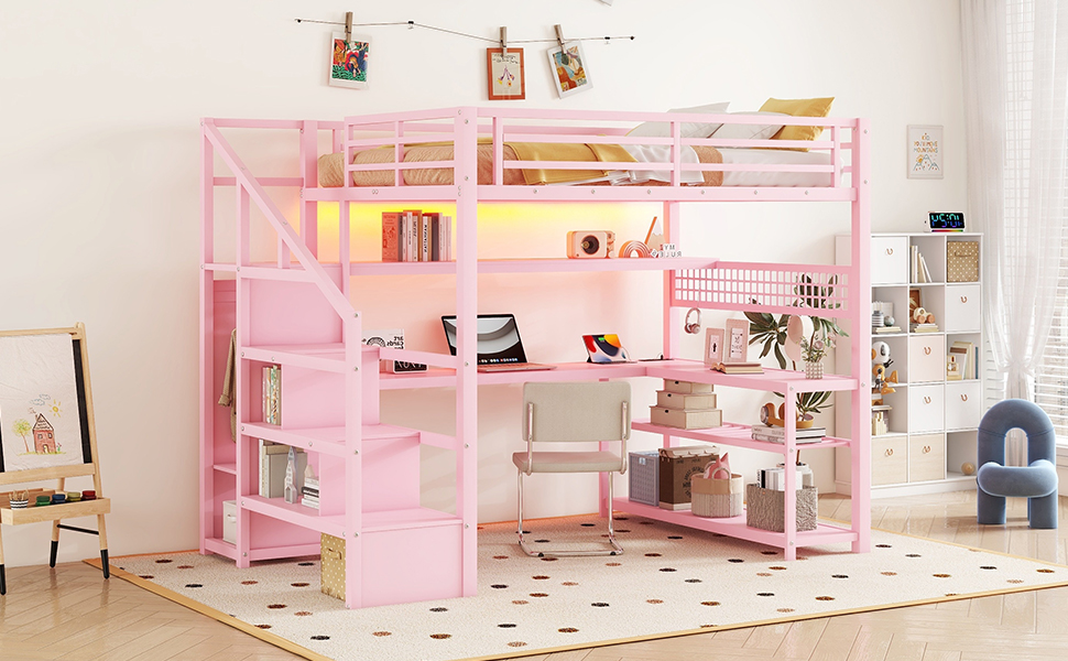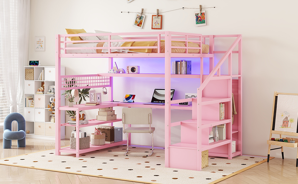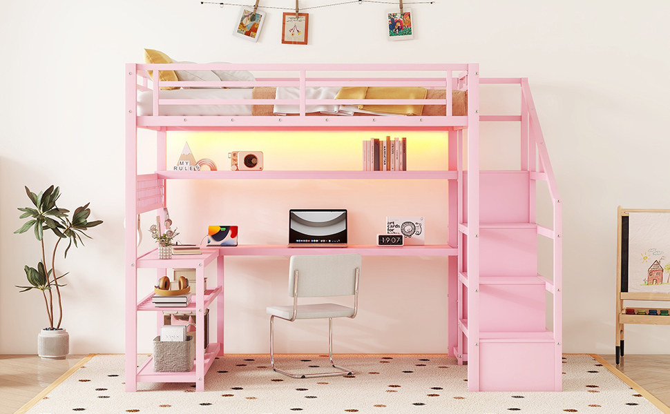 - Staircase with Storage: This full size loft bed features a sturdy staircase with built-in storage compartments. The wide steps ensure safe and easy access to the upper bed area, while the storage spaces provide extra room for organizing items.The stairscase can be placed at both left side and right side.
