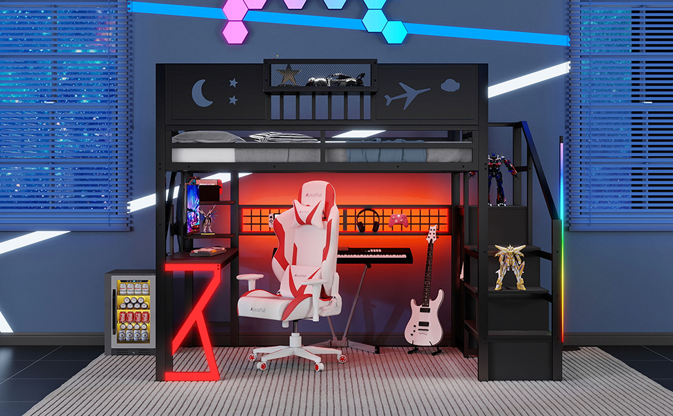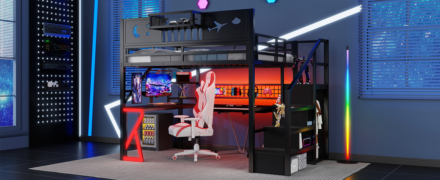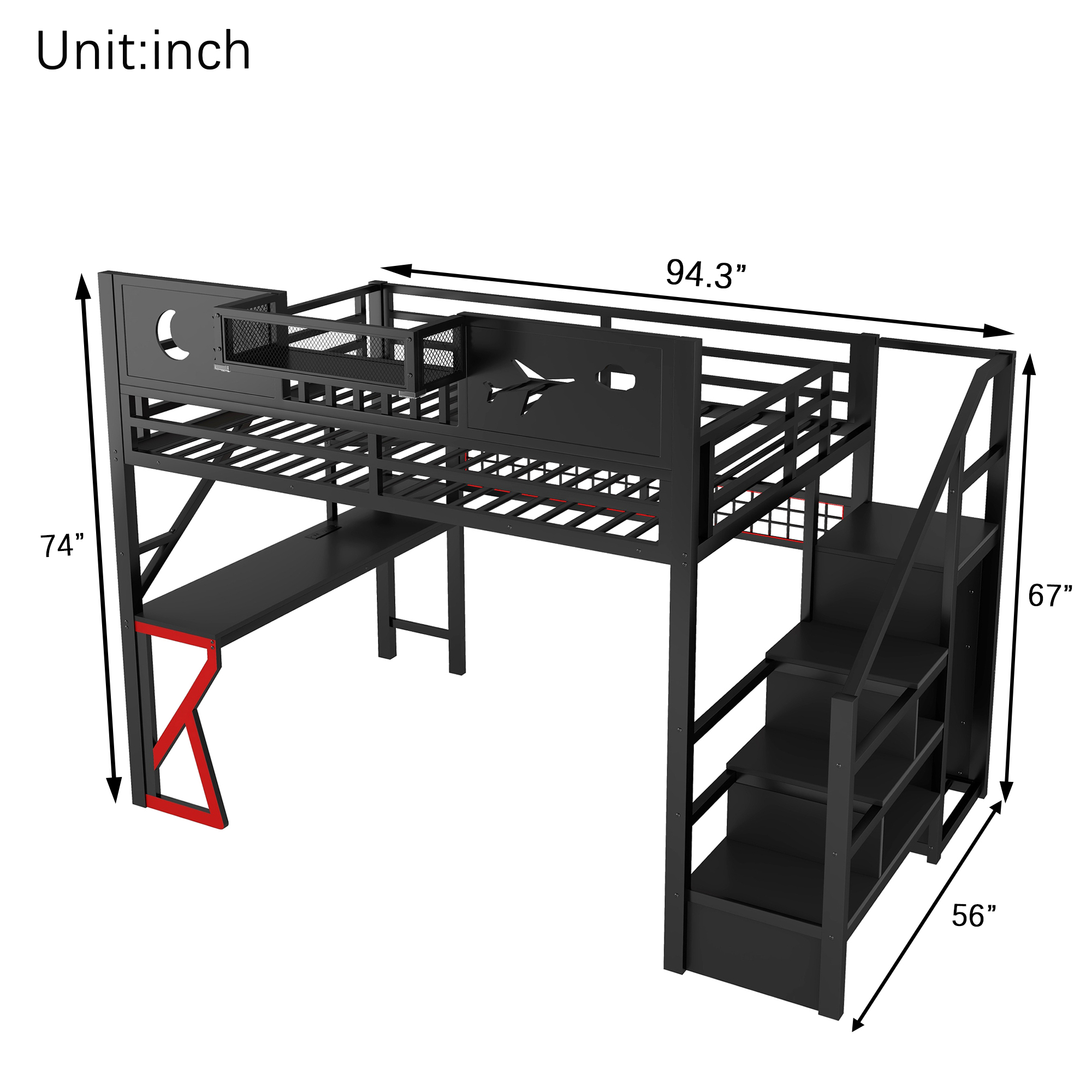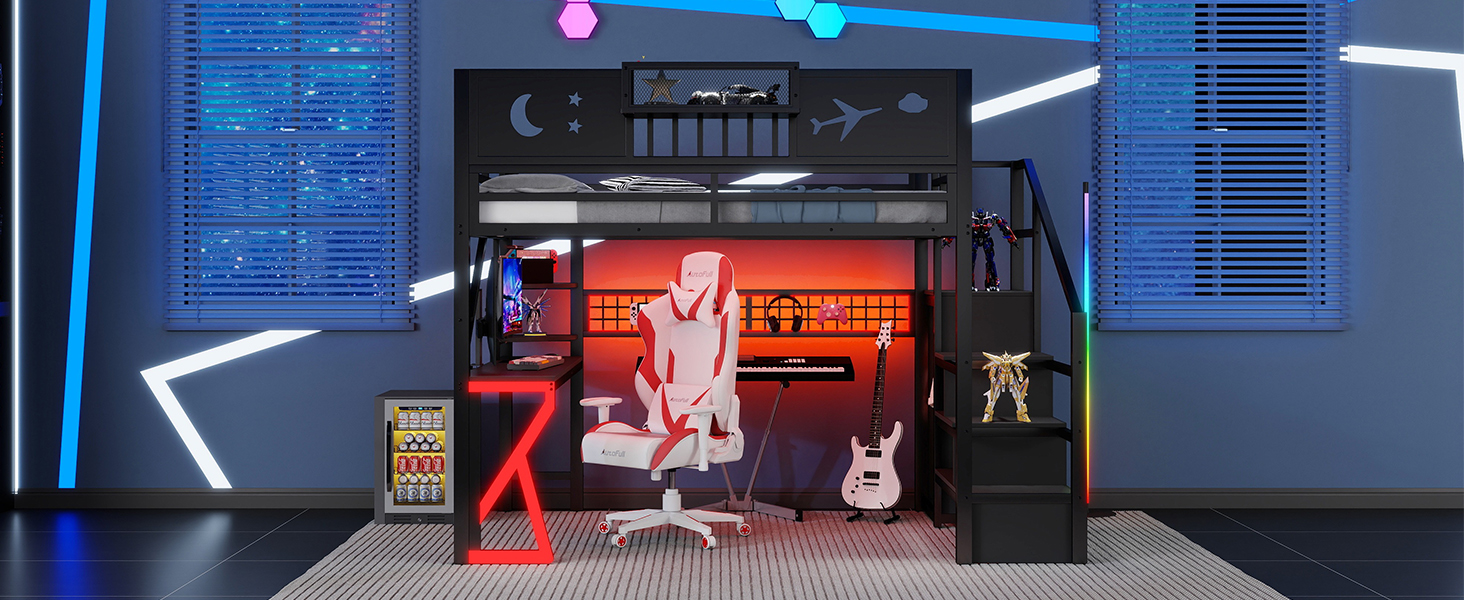 - This all-in-one loft bed is the perfect solution for small bedrooms, combining sleep, study, and storage in one compact footprint. Crafted with a premium metal frame for superior stability and durability.