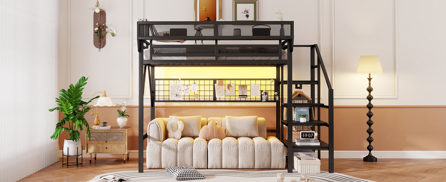 - [Metal Loft Bed with Light and Grid]Full size metal loft bed frame with RGB LED lights(over 60000 colors), in addition to directly adjusting the light colors in the APP or controller, you can customize the brightness, speed and timing modes. The lights offers a nice ambiance for your bedroom, bright up your night. And the grid can be DIY decoration.