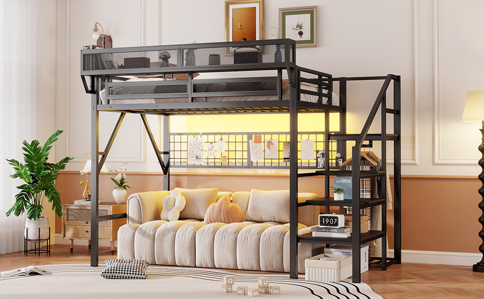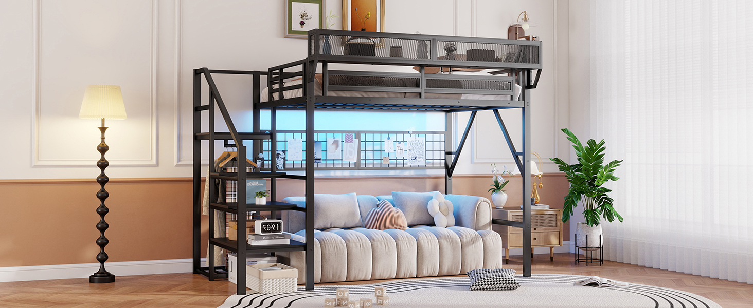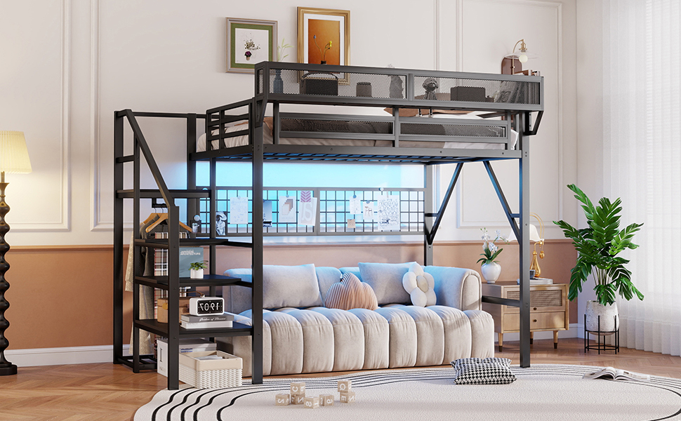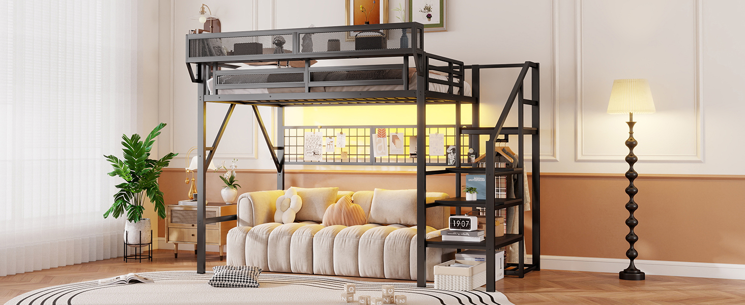 - [Metal Full Loft Bed with Staircase]The metal full size loft bed come with staircase includes built-in storage compartments making it easy to store items like shoes, toys, or blankets. There is a wardrobe under the stairs to storage clothes. The steps ensure safe and convenient access to the upper bed, enhancing both practicality and safety. The stairs can be installed on either right side or left side.