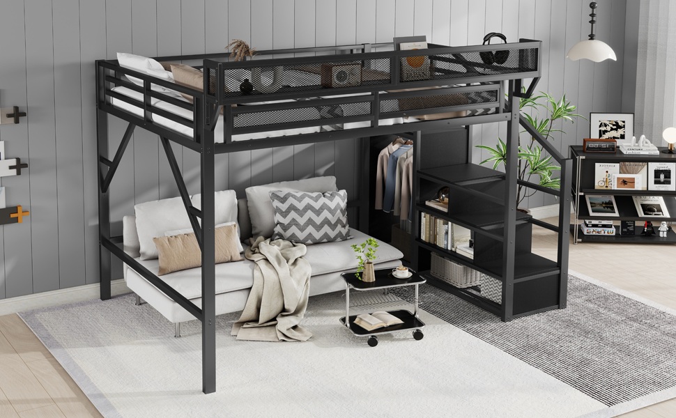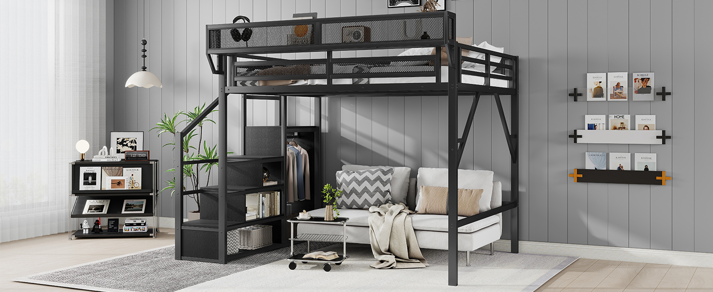 This full size loft bed features built-in storage shelves next to the upper bed. Come with staircase and wardrobe. The sturdy metal design ensures stability and durability, making your bedtime routine more organized and efficient.