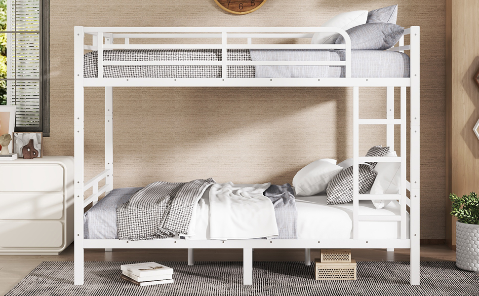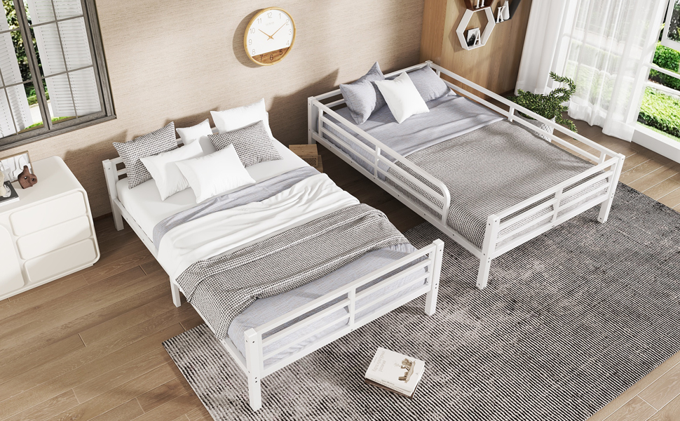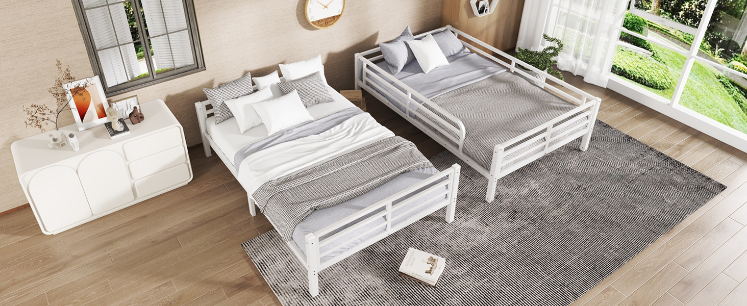 Feature upper bed is full size and bottom bed is full size. The metal bunk bed constructed with a sturdy quality and thicker steel frame that for stability and durability, make the bunk bed not wobbling and allowing users to sleep soundly.