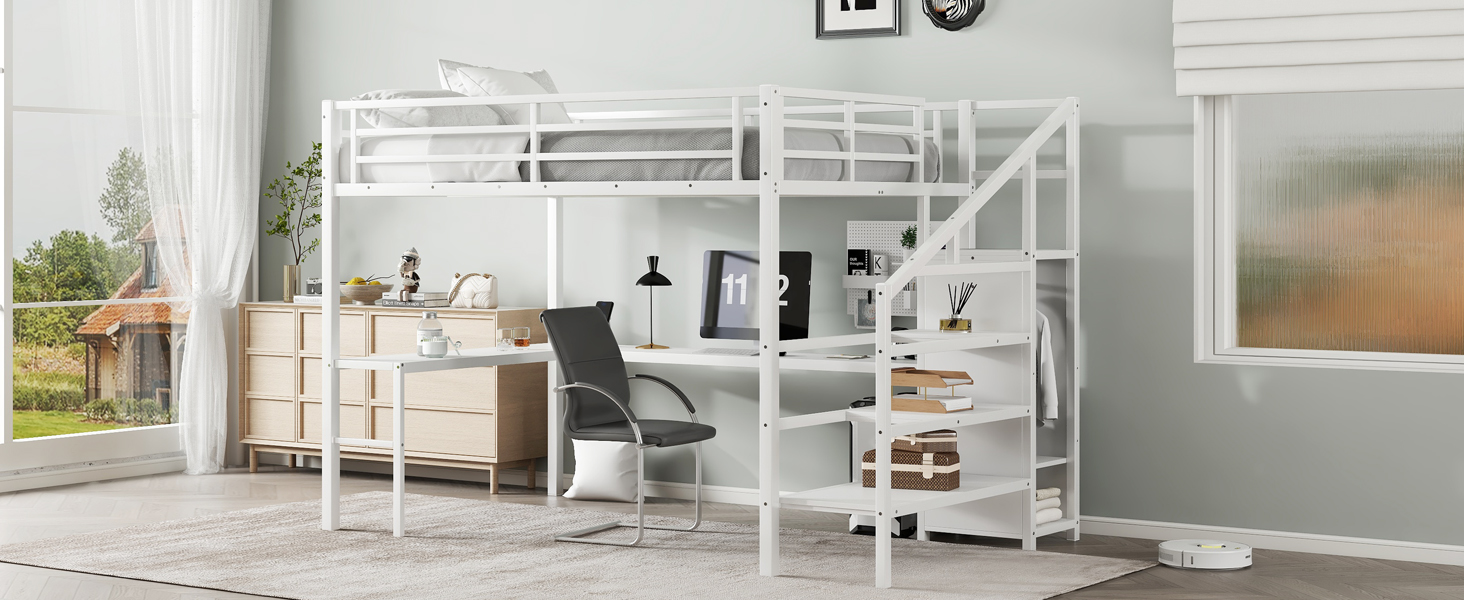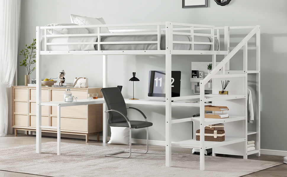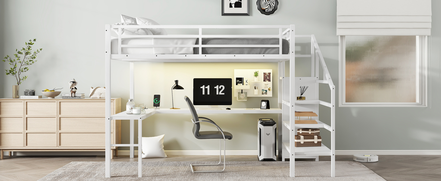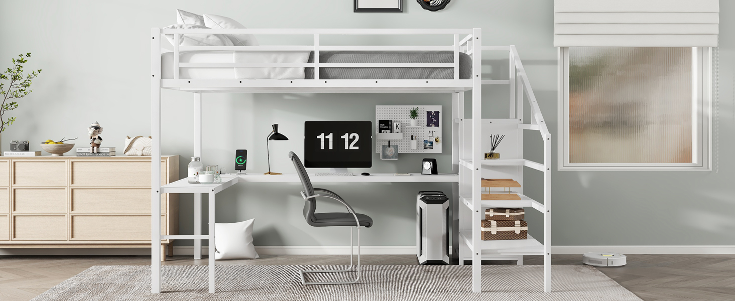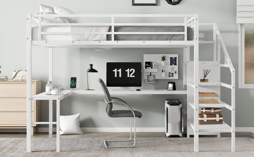 - Space-Saving Loft Bed & Workspace – This metal loft bed has a cozy sleeping space, and a spacious and practical L-shaped desk underneath that can be used as a workbench, reading area, etc. where you can create your own little world. The space-saving design adds a touch of elegance to any bedroom.