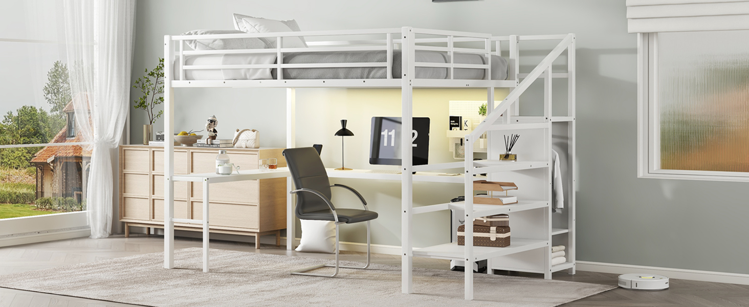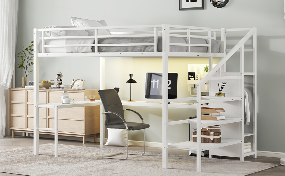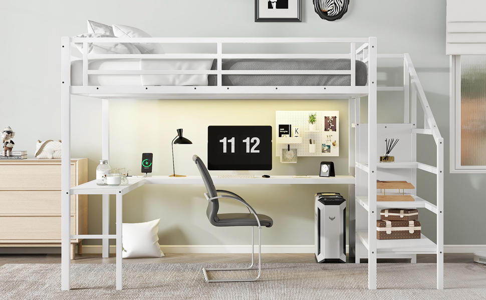 - Loft Bed with USB and LED – The queen size bed’s desk comes with a USB charging station for charging electronics that is convenience to your daily life.The LED light strip adds a sense of ambiance to your room while making it easy for you to wake up at night.