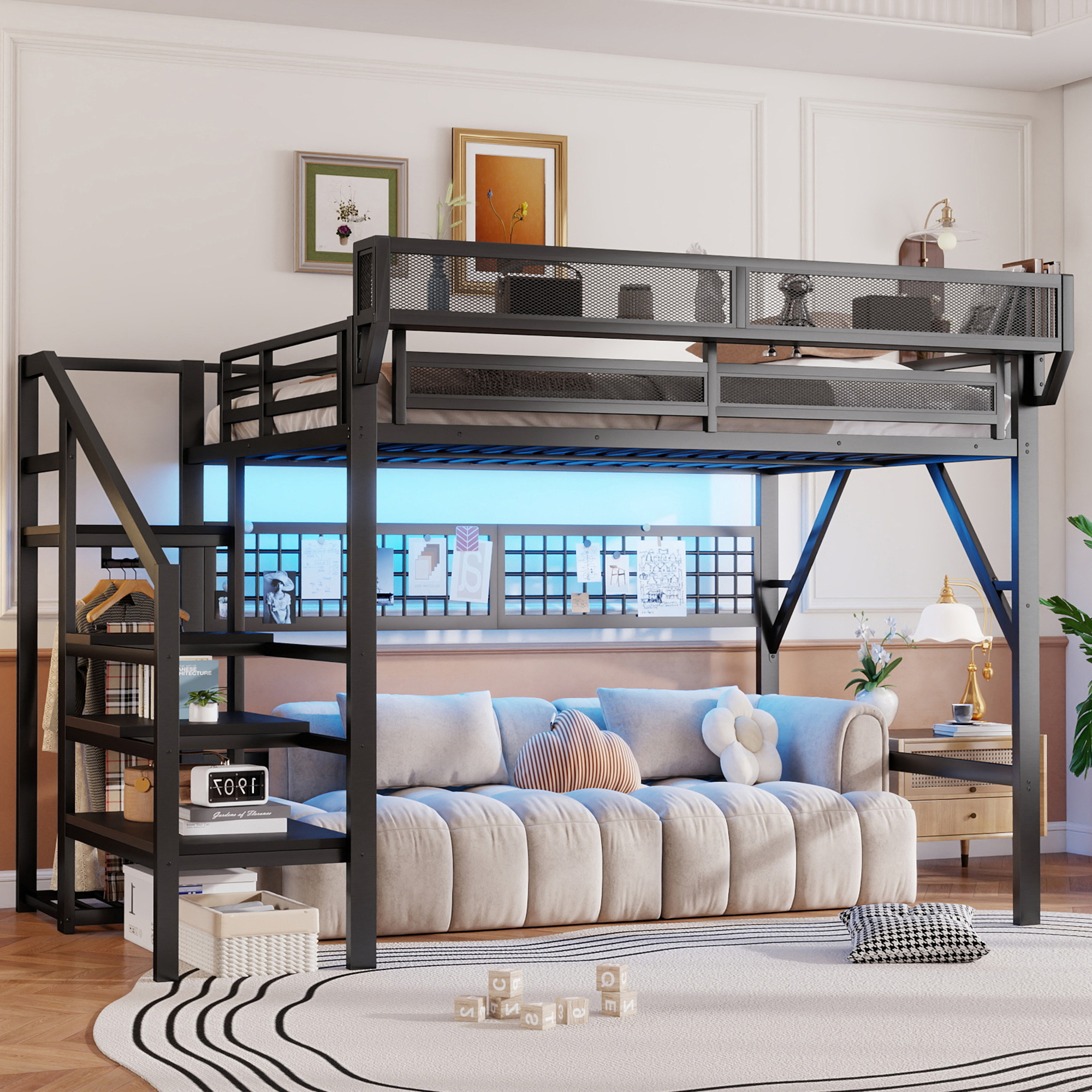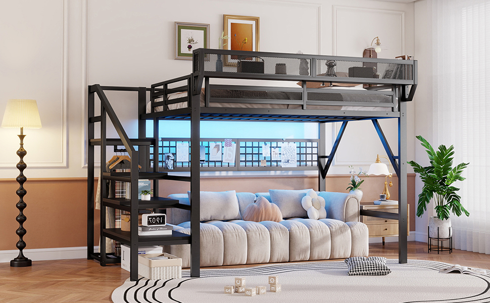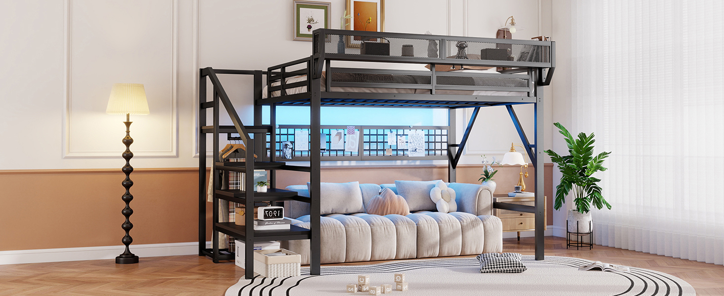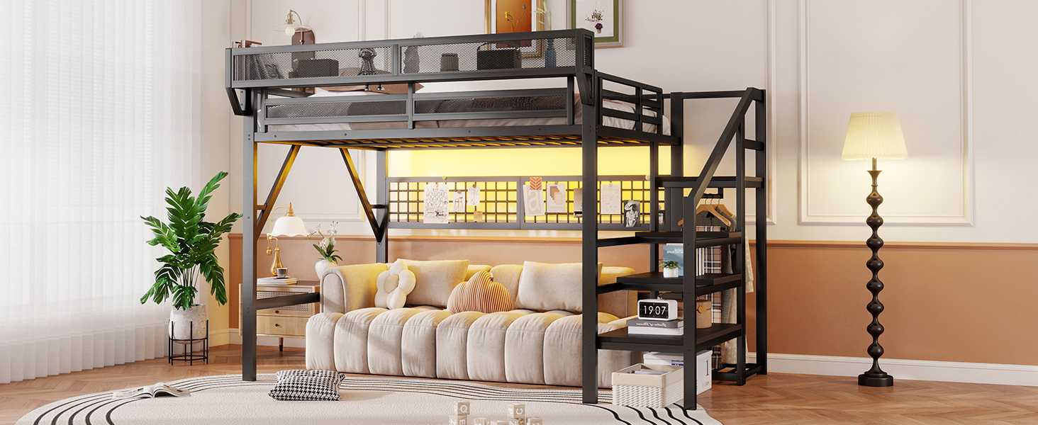 - [Metal Queen Loft Bed with Staircase]The metal queen size loft bed come with staircase includes built-in storage compartments making it easy to store items like shoes, toys, or blankets. There is a wardrobe under the stairs to storage clothes. The steps ensure safe and convenient access to the upper bed, enhancing both practicality and safety. The stairs can be installed on either right side or left side.