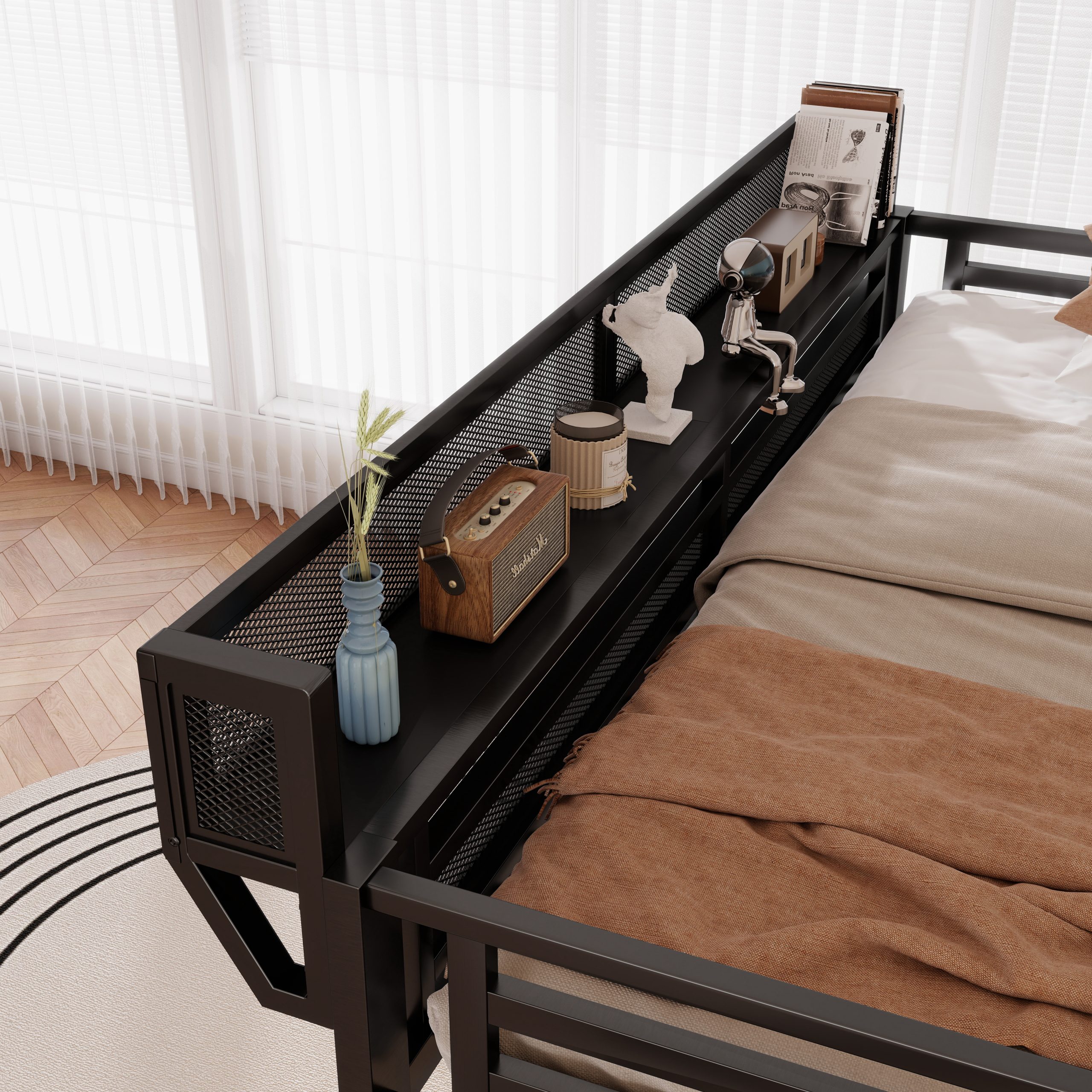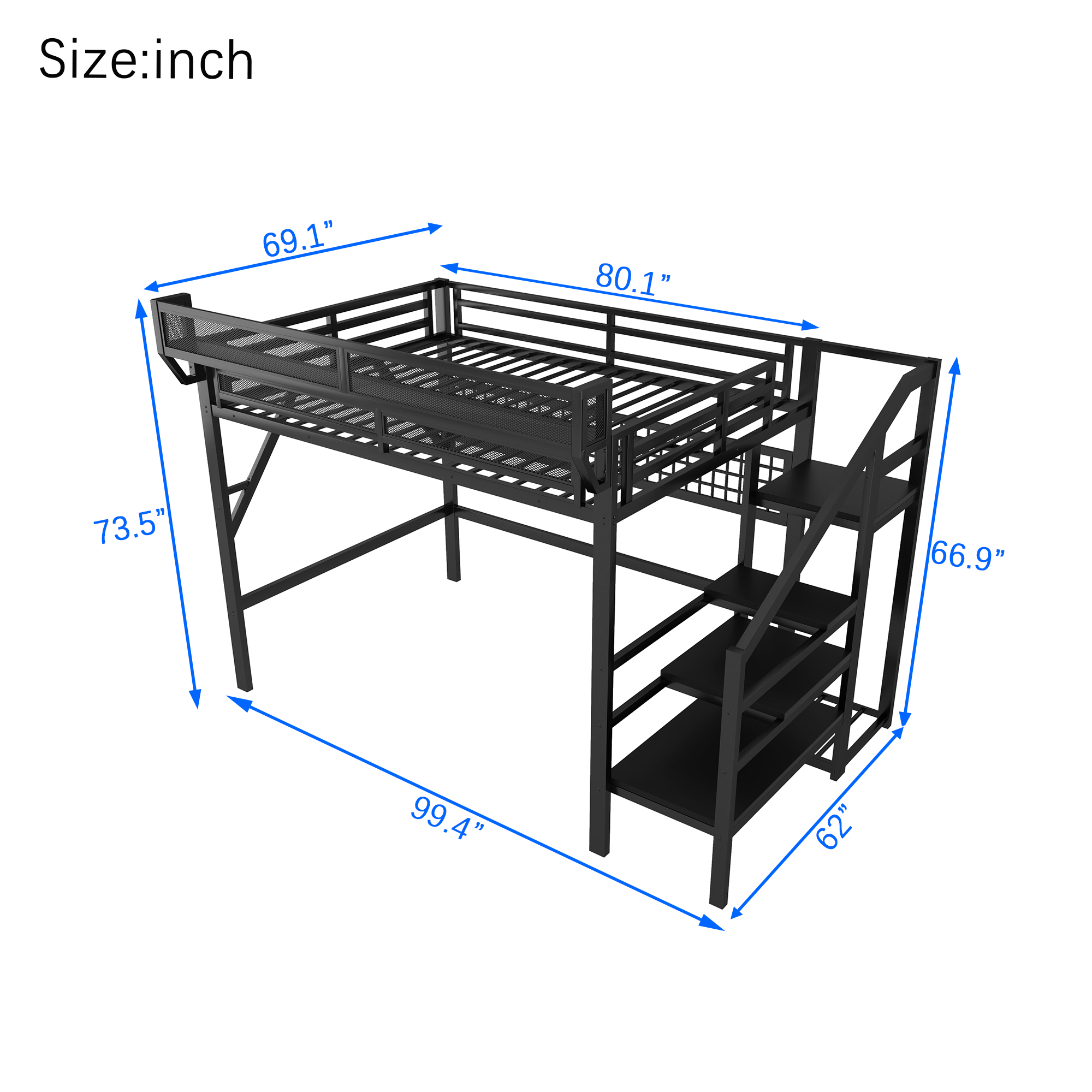 - [Queen Loft Bed with Storage Shelves for Upper]The queen metal loft bed features a storage shelf next to the upper bed, providing extra storage space. This shelf is perfect for keeping books, gadgets, or small items within easy reach. The shelf have mesh around which prevent thing falling down. It adds functionality without compromising space.