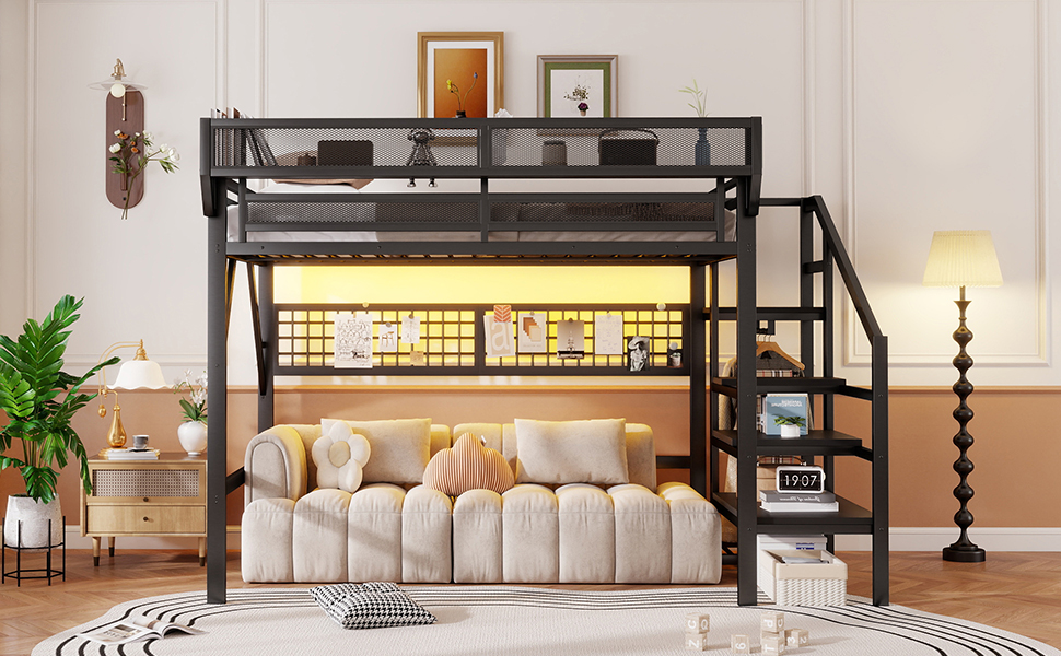 - [Metal Loft Bed with Light and Grid]Queen size metal loft bed frame with RGB LED lights(over 60000 colors), in addition to directly adjusting the light colors in the APP or controller, you can customize the brightness, speed and timing modes. The lights offers a nice ambiance for your bedroom, bright up your night. And the grid can be DIY decoration.