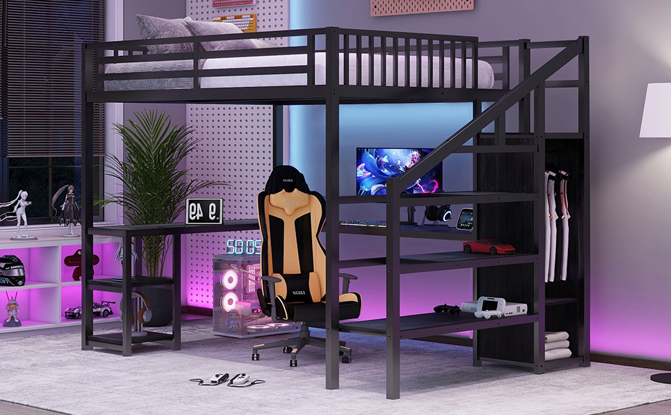 - [Loft Bed with USB and LED]: The queen size loft bed comes with a USB charging station for charging electronics that is convenience to your daily life. The LED light with a remote control offers 16 static colors and speed adjust and brightness adjust provide personalized lighting atmosphere for your night.