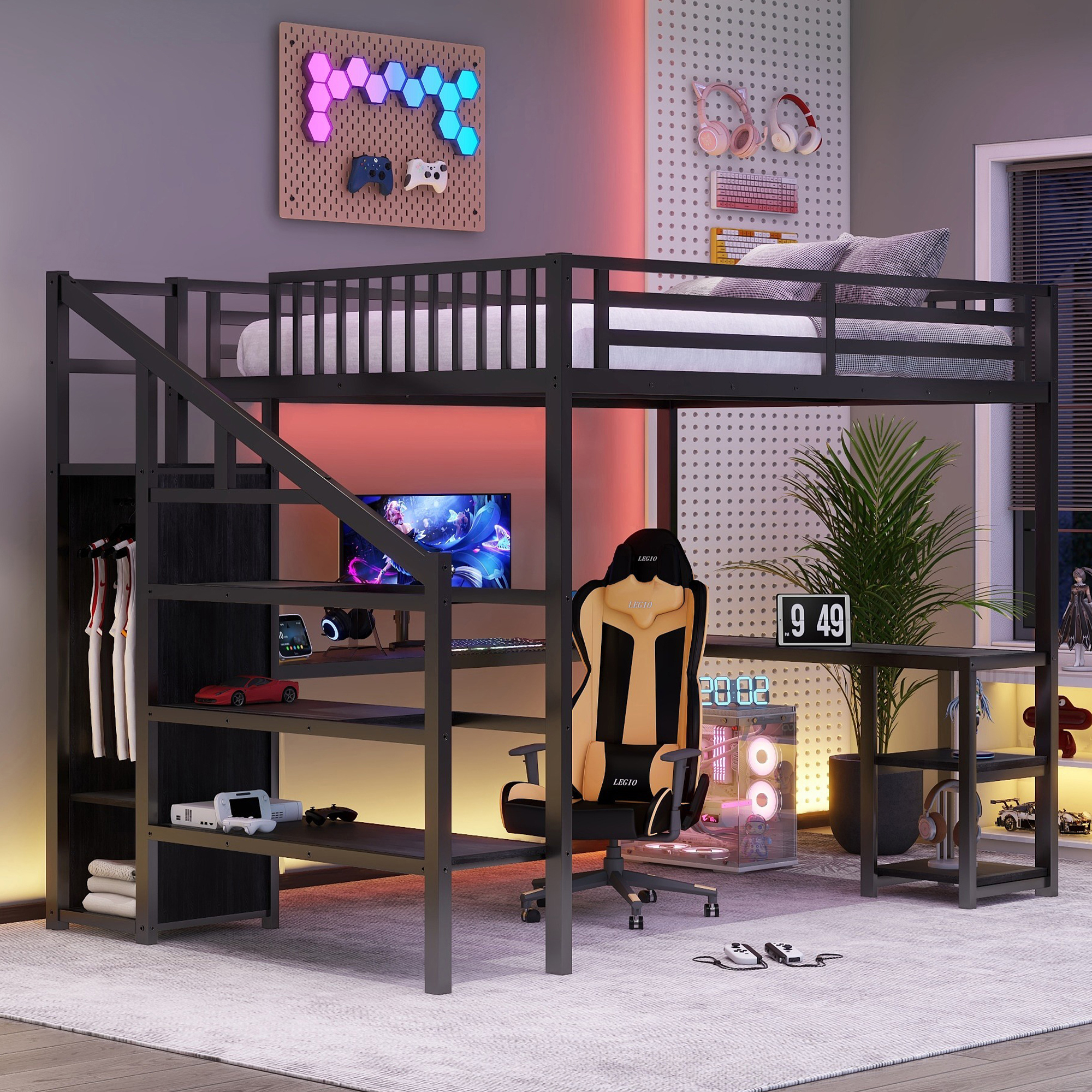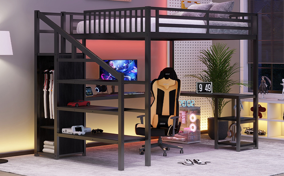 - [Loft Bed with Storage and Desk]: Our queen loft bed frame with desk and storage shelves for kids is great for making extra room in a small bedroom. This functionality loft bed includes a L shape desk and built with 2 shelves under the desk and has 55” of under-bed clearance, the raised base creates a cozy space for storage, study or play to make the most of your space.