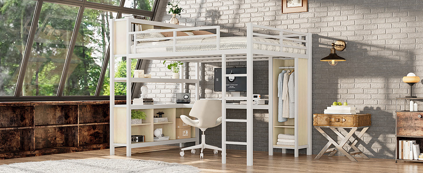 - Queen Loft Bed with Wardrobe and Desk: This metal loft bed has a cozy sleeping space, a spacious and practical L-shaped desk that can be used as a workbench or reading area, and the wardrobe can provide a great place for your everyday clothes.
