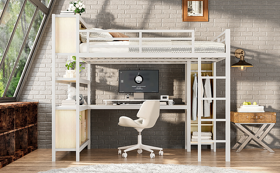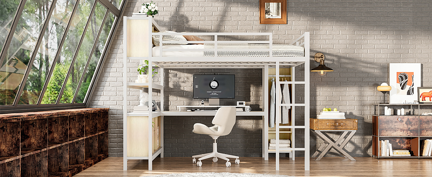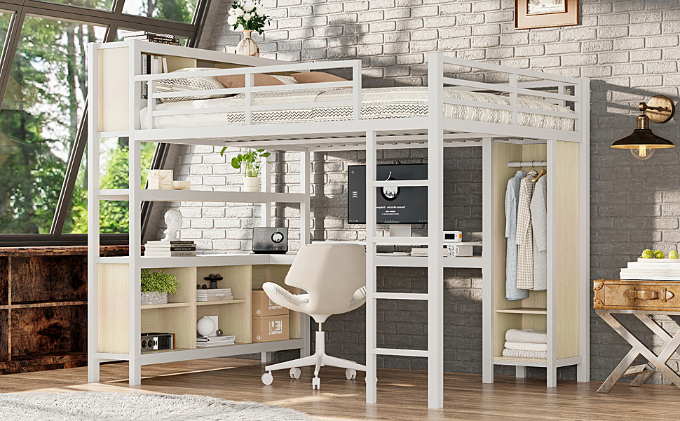 - Modern Style: This queen metal loft bed with desk is an ideal gift for a child! The simple and airy look suits any room style. Our loft bed is versatile and perfect for apartments, dorms, and teenage rooms!