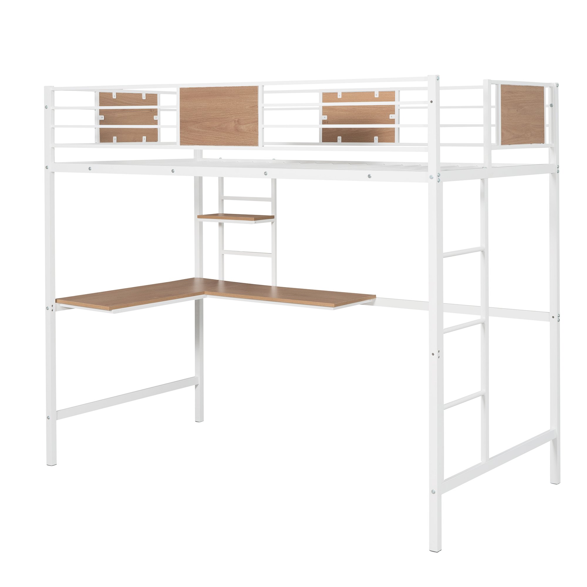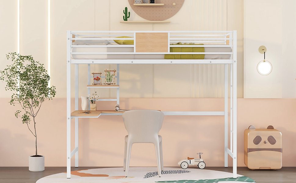 Metal Twin Loft Bed With Desk, Guardrail And Shelve