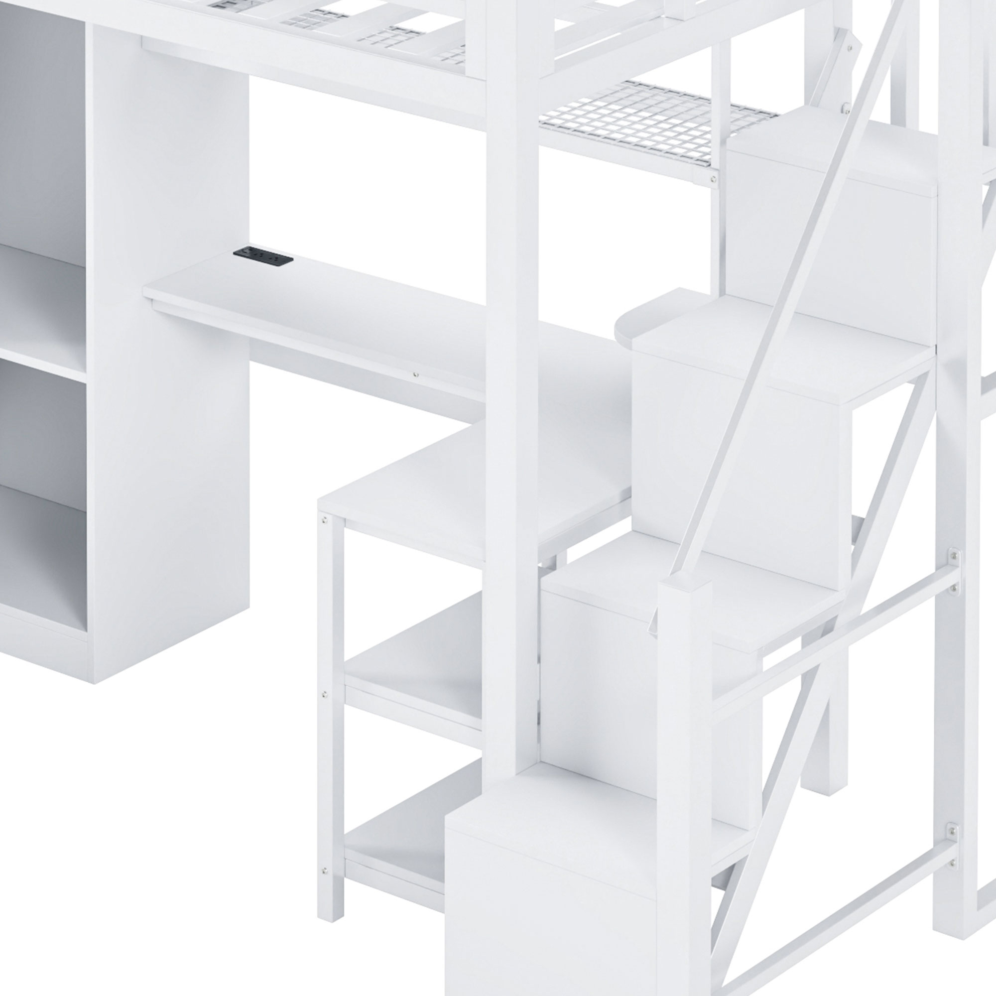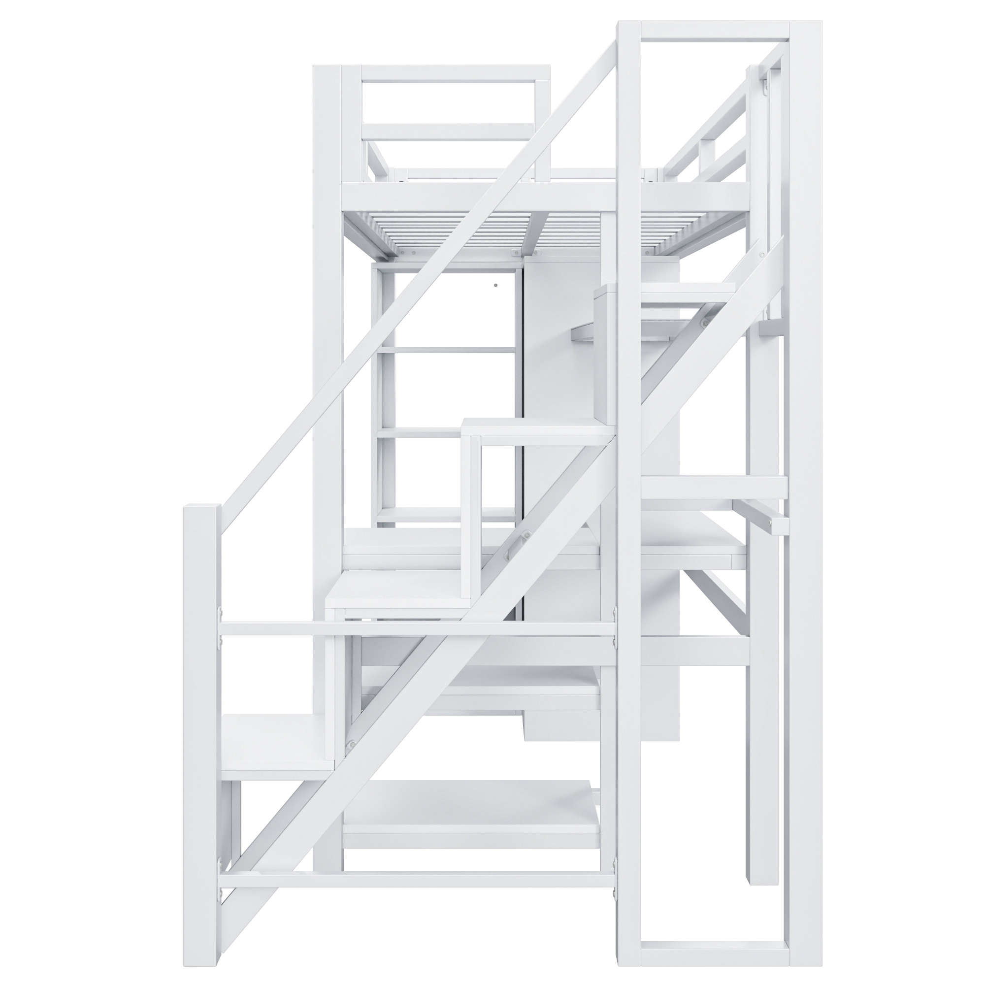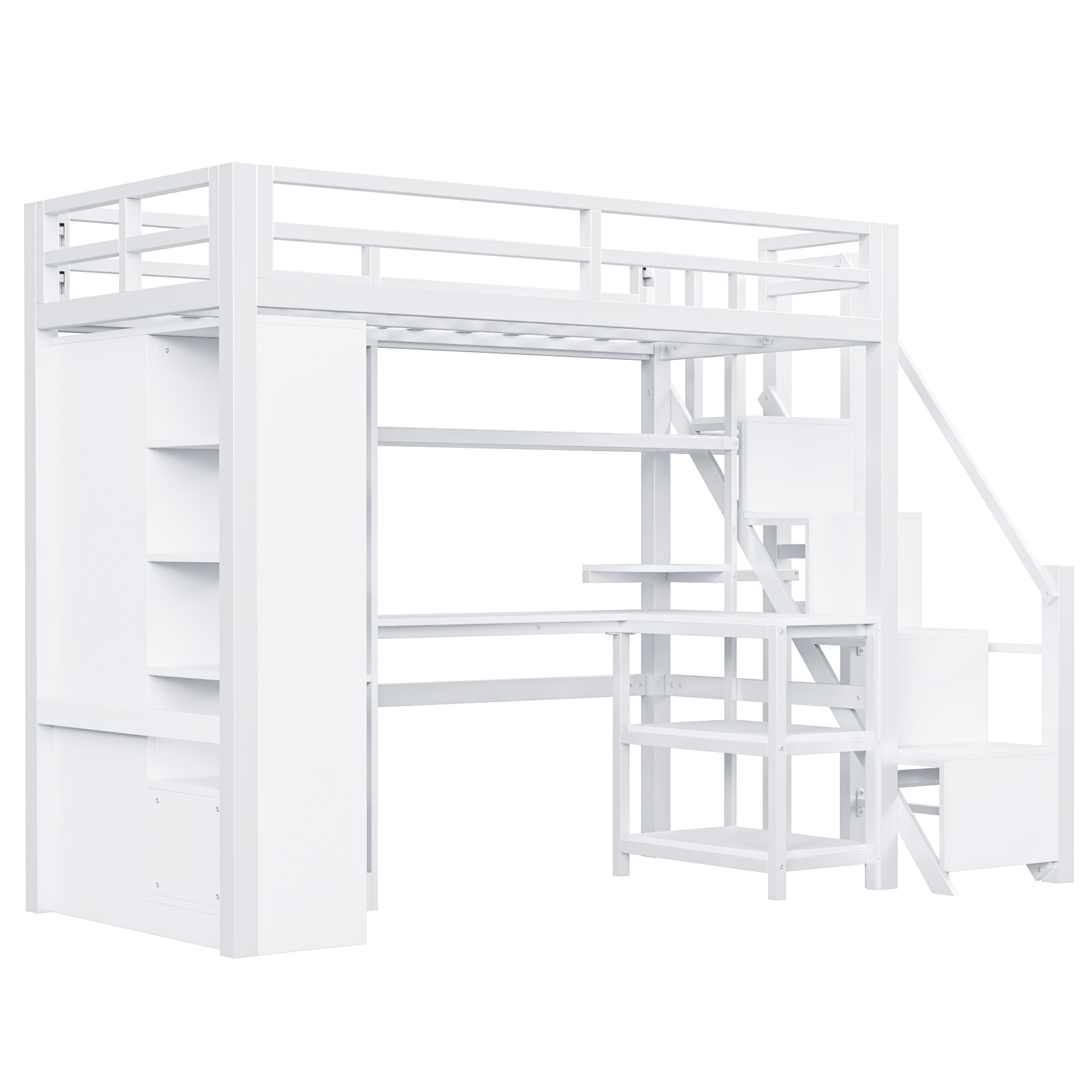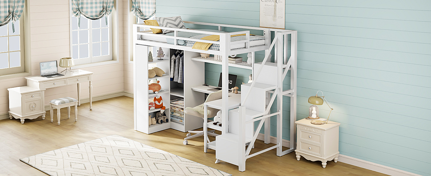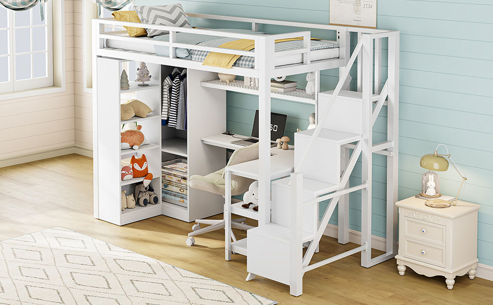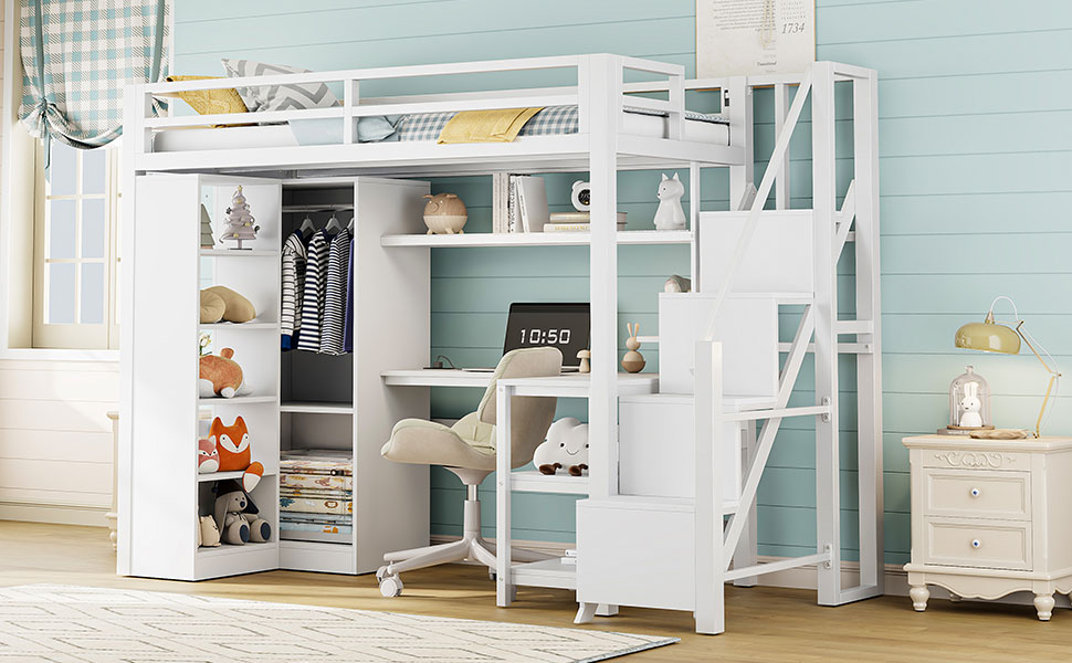 (Price Includes Shipping, No Tax Fee.)This metal loft bed is made of metal with a clean painted surface and slatted guardrails for a simple silhouette. The 5-layer shelf on the side of the loft bed can hold anything you want, including lamps, books, toys, and more. You can put some decorations on the top and some household items on the bottom. This bed comes with an L-shaped desk under it, which can definitely provide you with a comfortable place to work, read, and play. If you can use your imagination, this loft bed will be both beautiful and practical. The feature of this bed is that it also has a large wardrobe inside, where you can store clothes and other things.