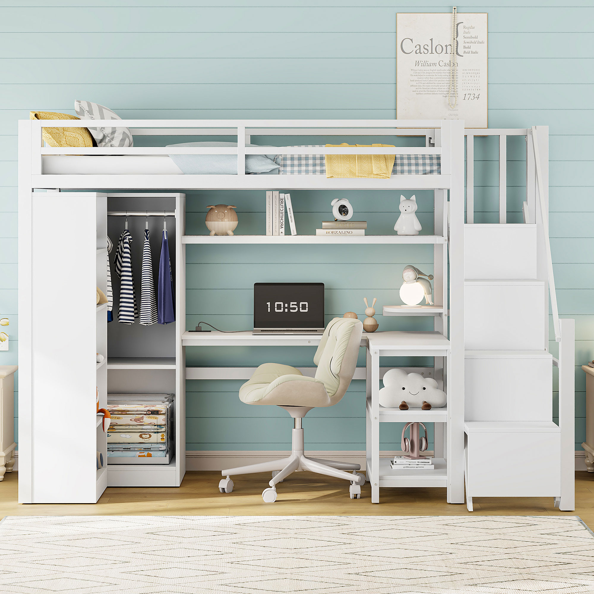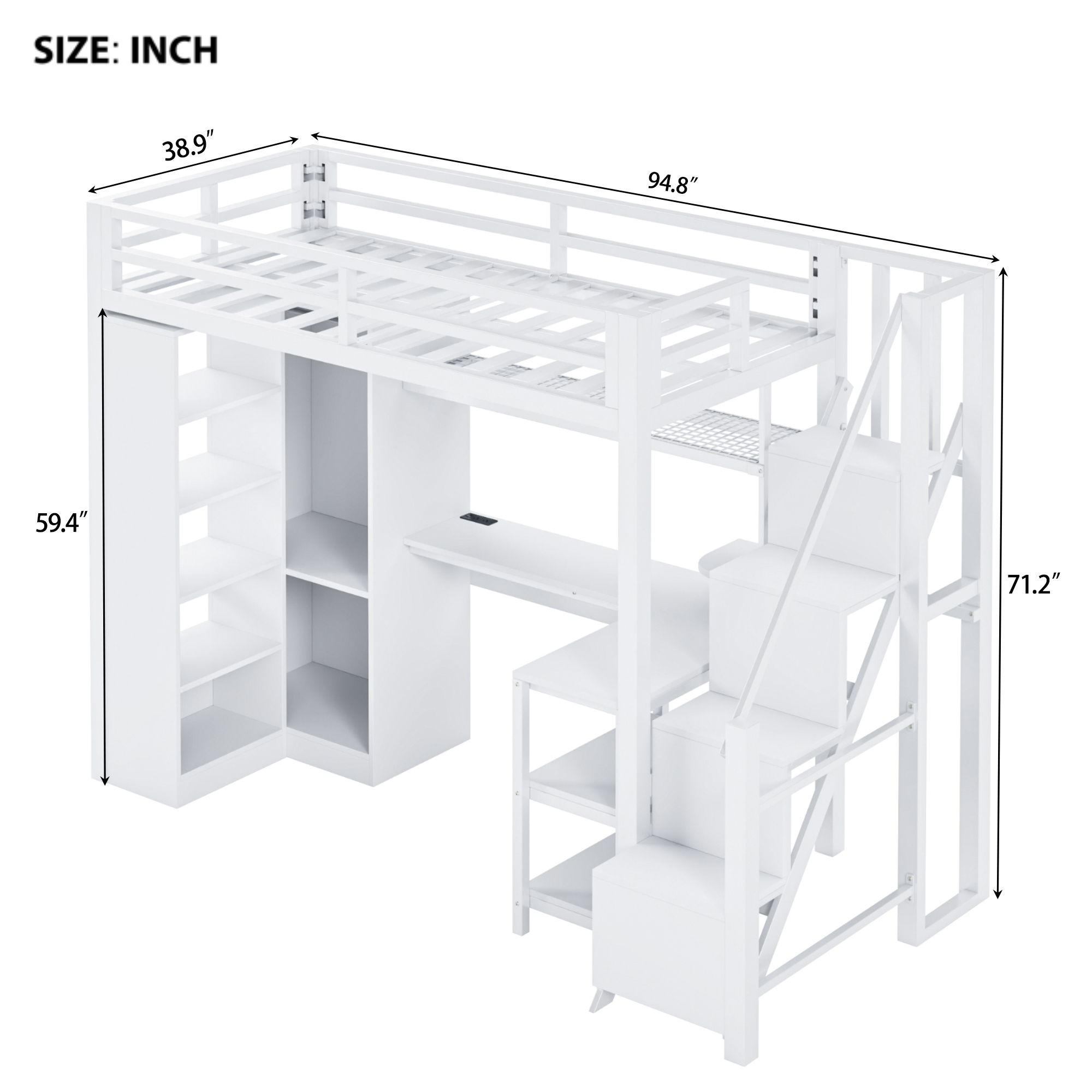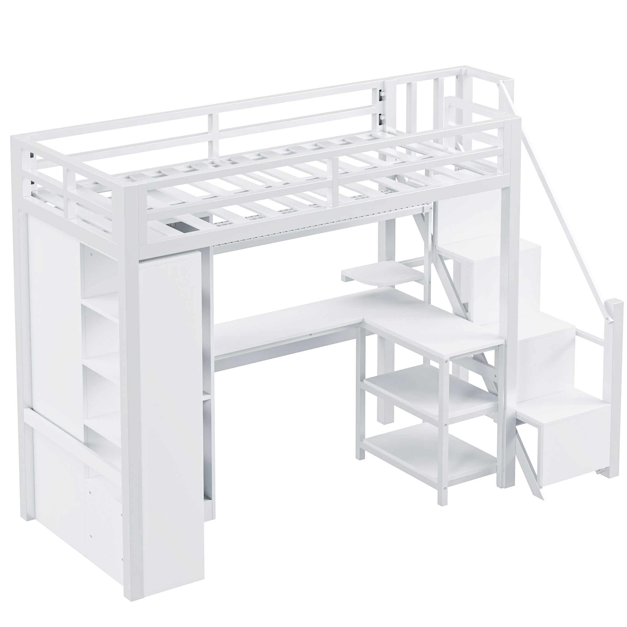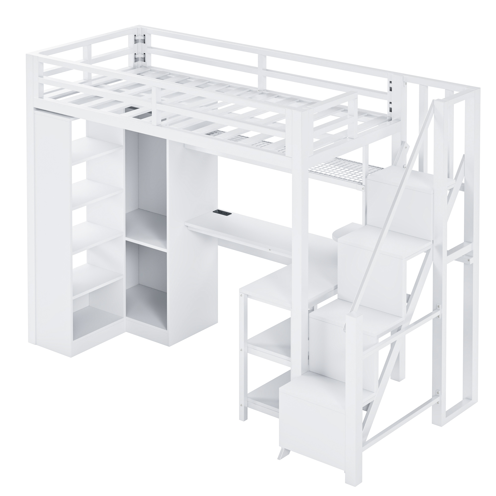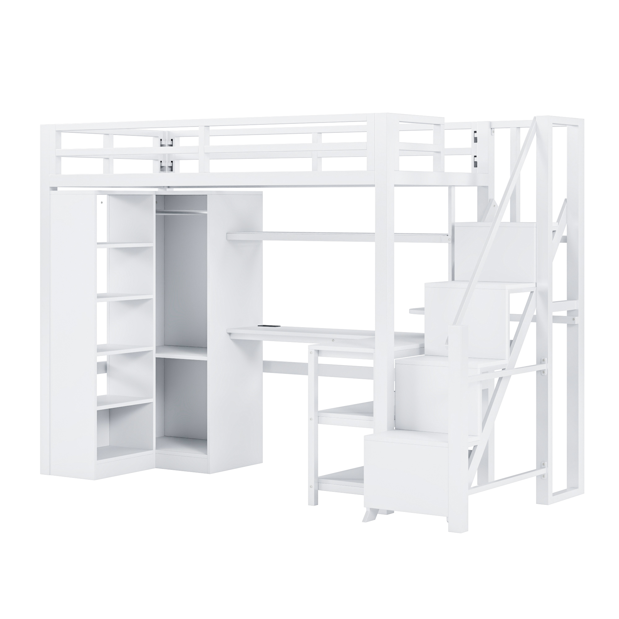 Metal Twin Loft Bed With Desk, Usb Ports, 5-layer Shelf, Wardrobe And Stepped Stairs