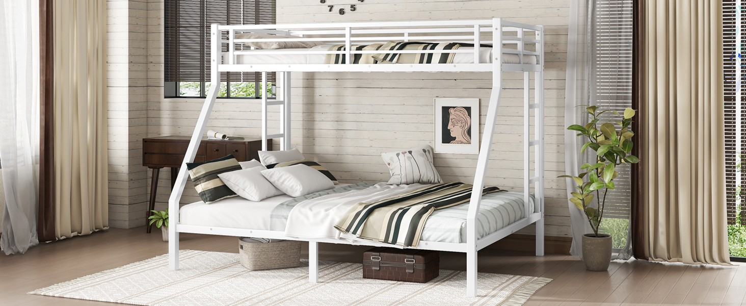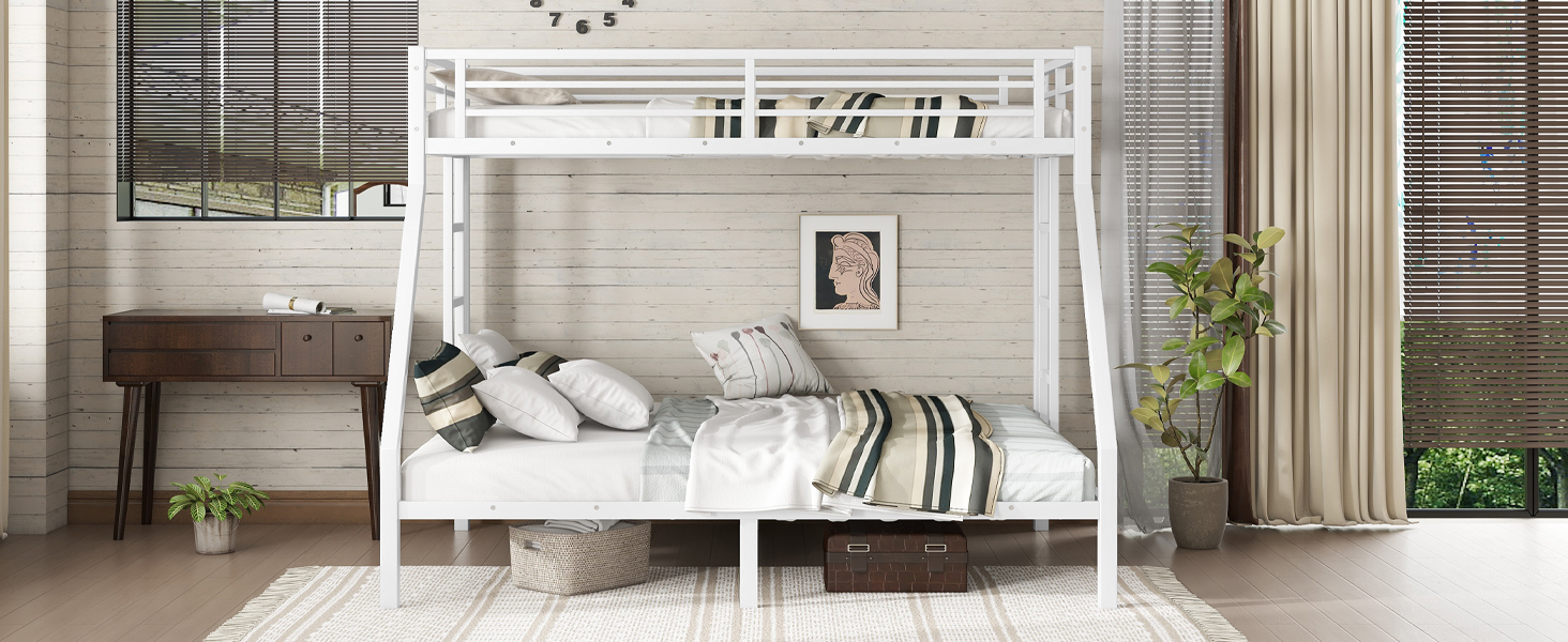 Feature upper bed is Twin XL size and bottom bed is queen size. The metal bunk bed constructed with a sturdy quality and thicker steel frame that for stability and durability, make the bunk bed not wobbling and allowing users to sleep soundly.