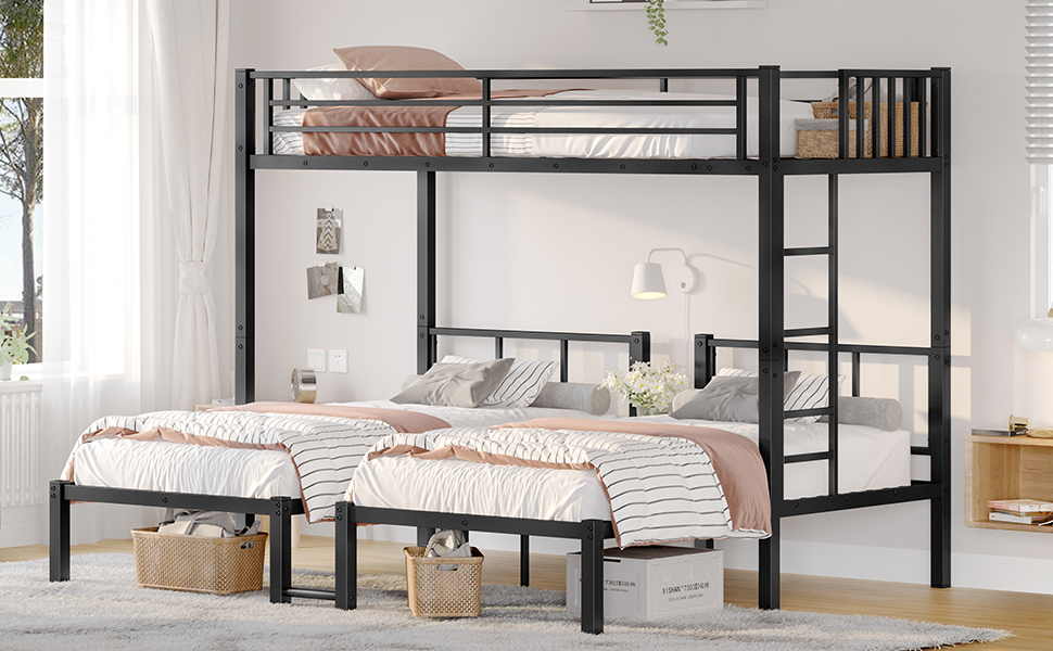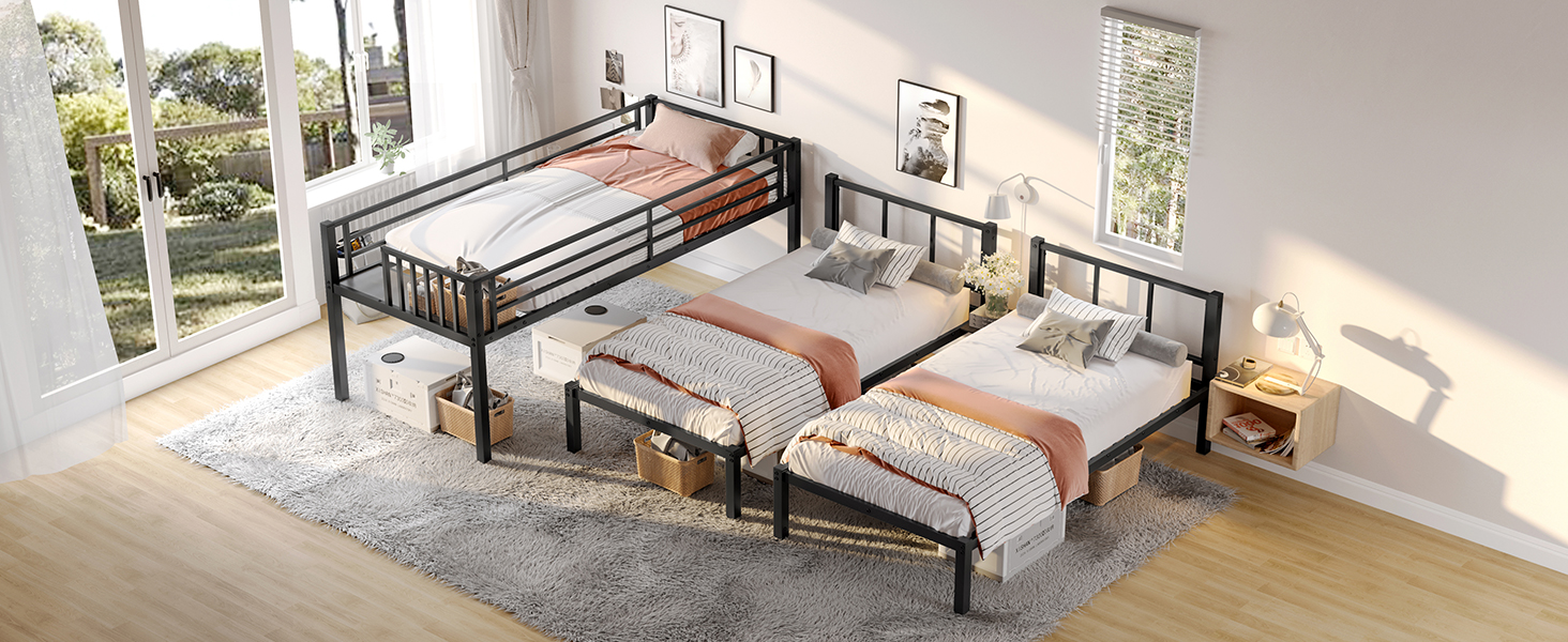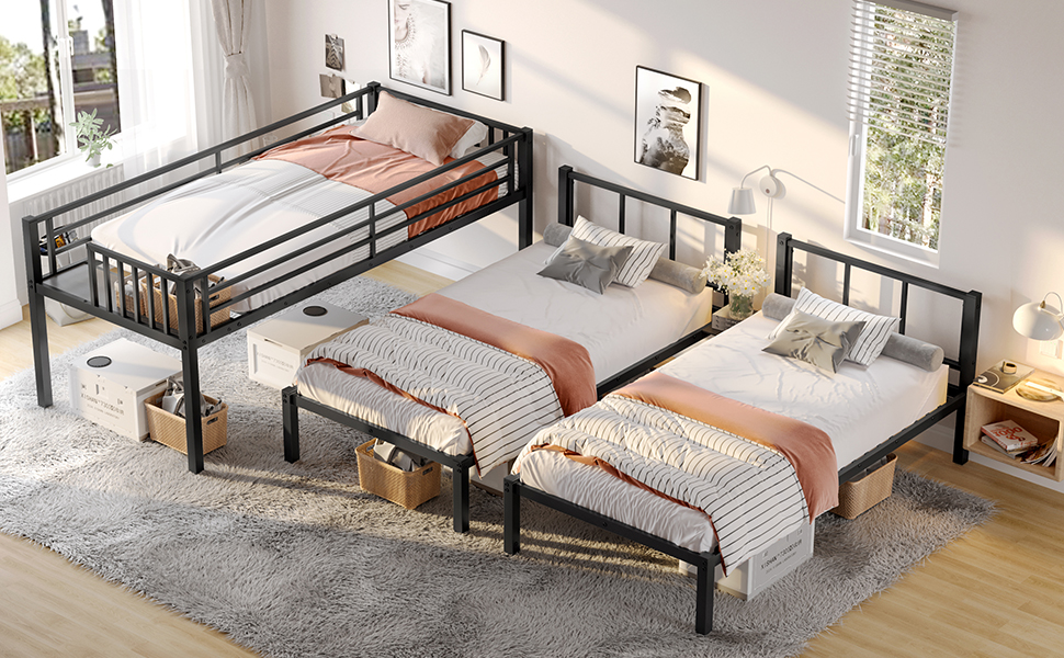 - Detachable Triple Bunk Bed — This metal triple bed frame can be used as L-shaped triple bunk bed, but also can be divided into three separate twin beds. It is a good choice when your children grow up and need private space.