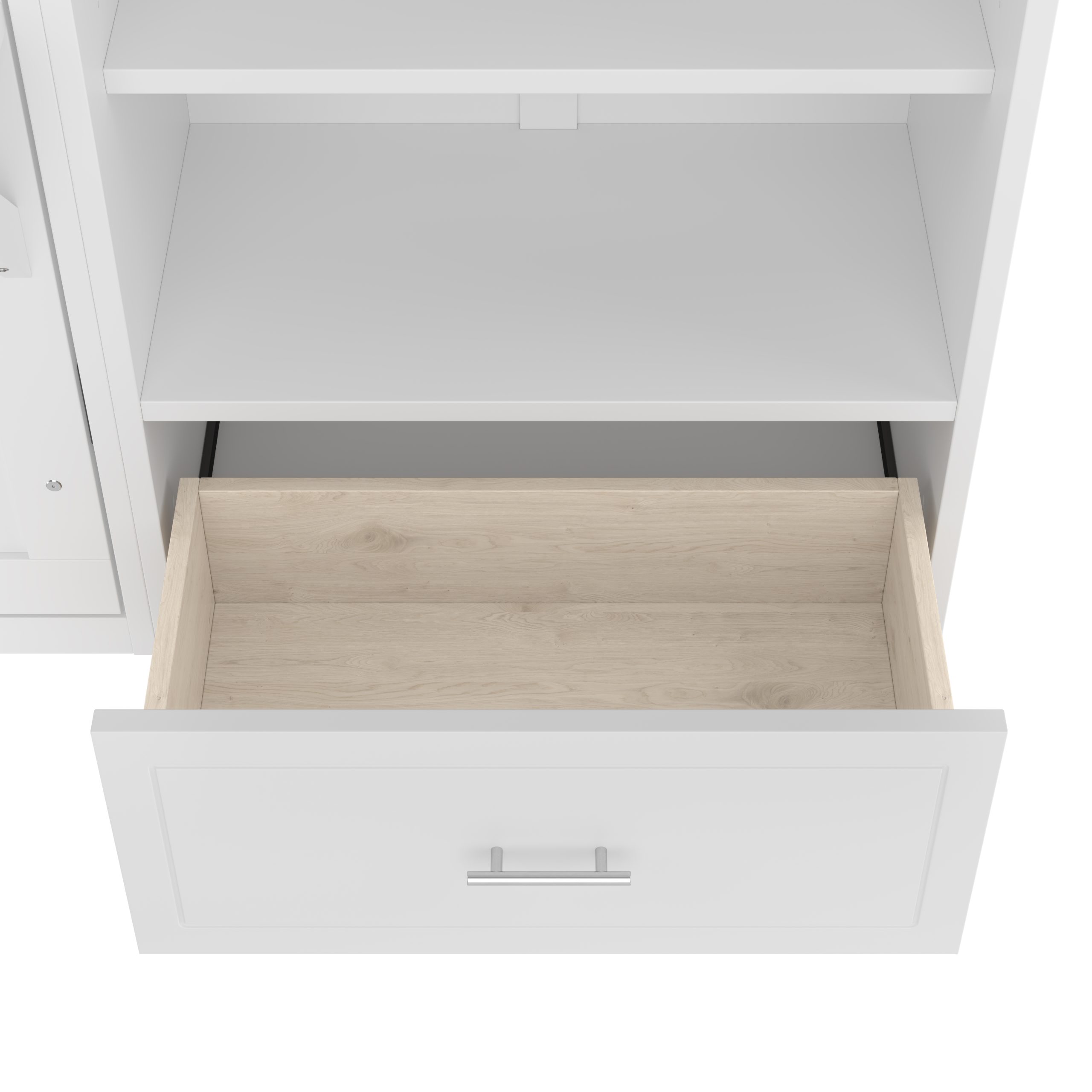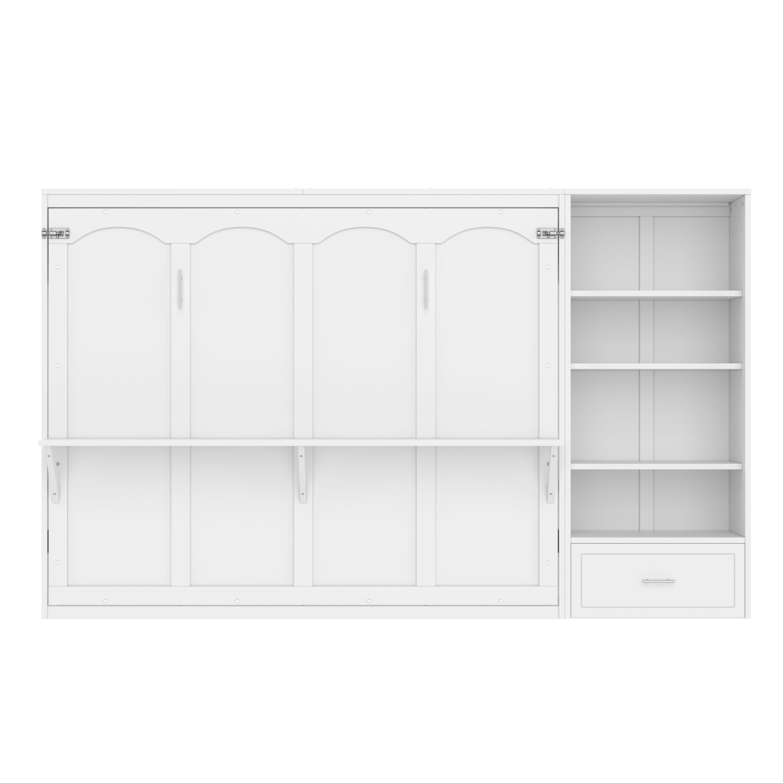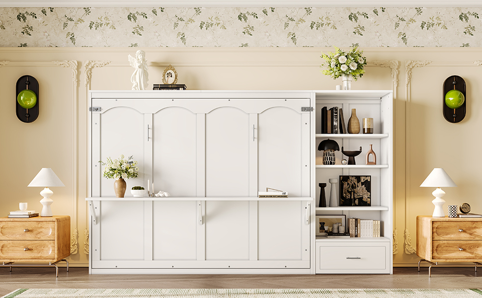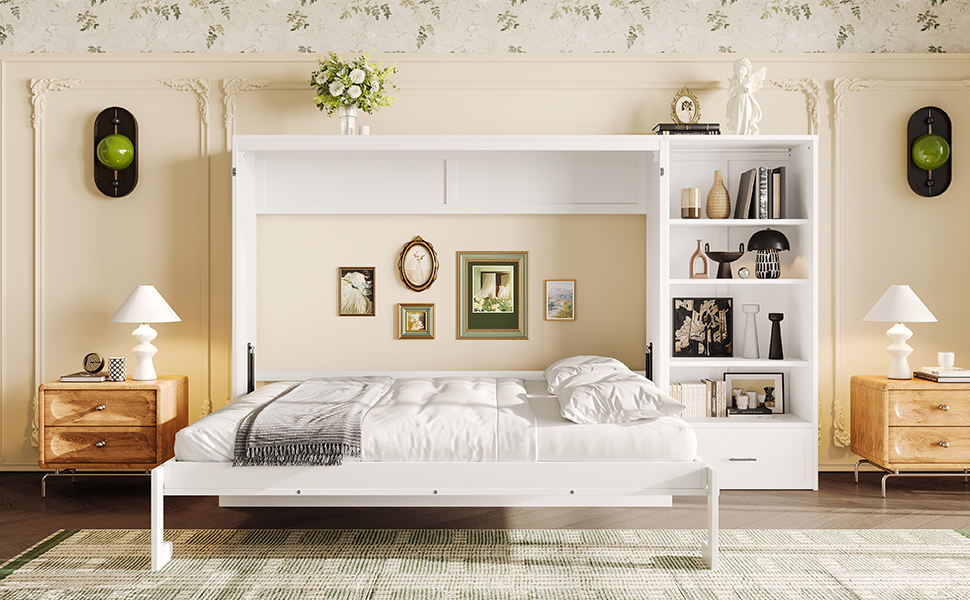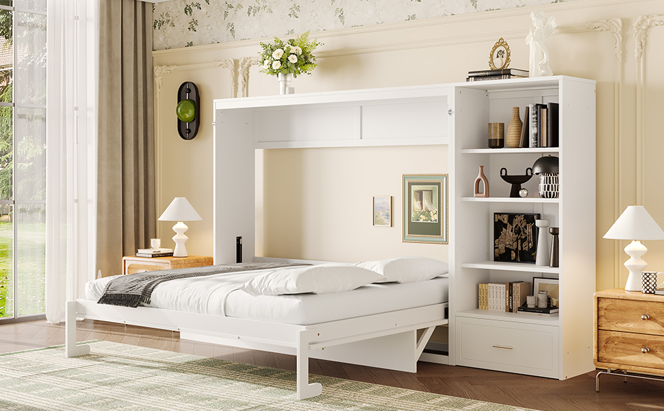 - 3.Queen Size Murphy Bed with Height Adjustable Storage Compartments: The top and bottom shelves of the side storage compartments are height-adjustable, each offering 3 different positions to choose from. This flexibility allows you to customize the space to fit your storage needs, making it easy to accommodate items of various heights and sizes.