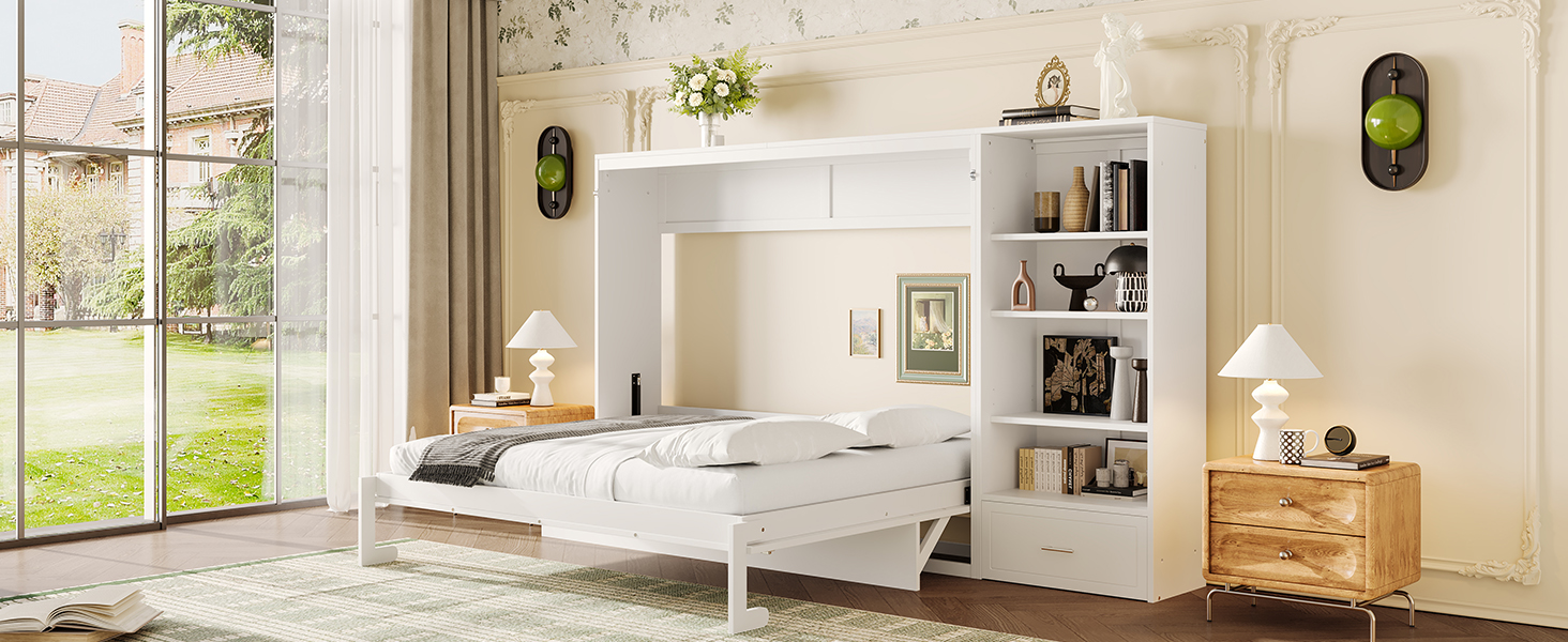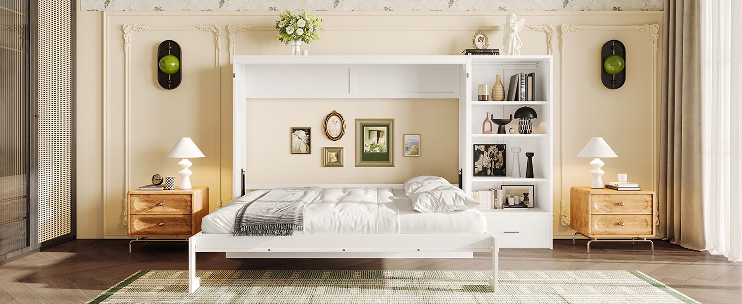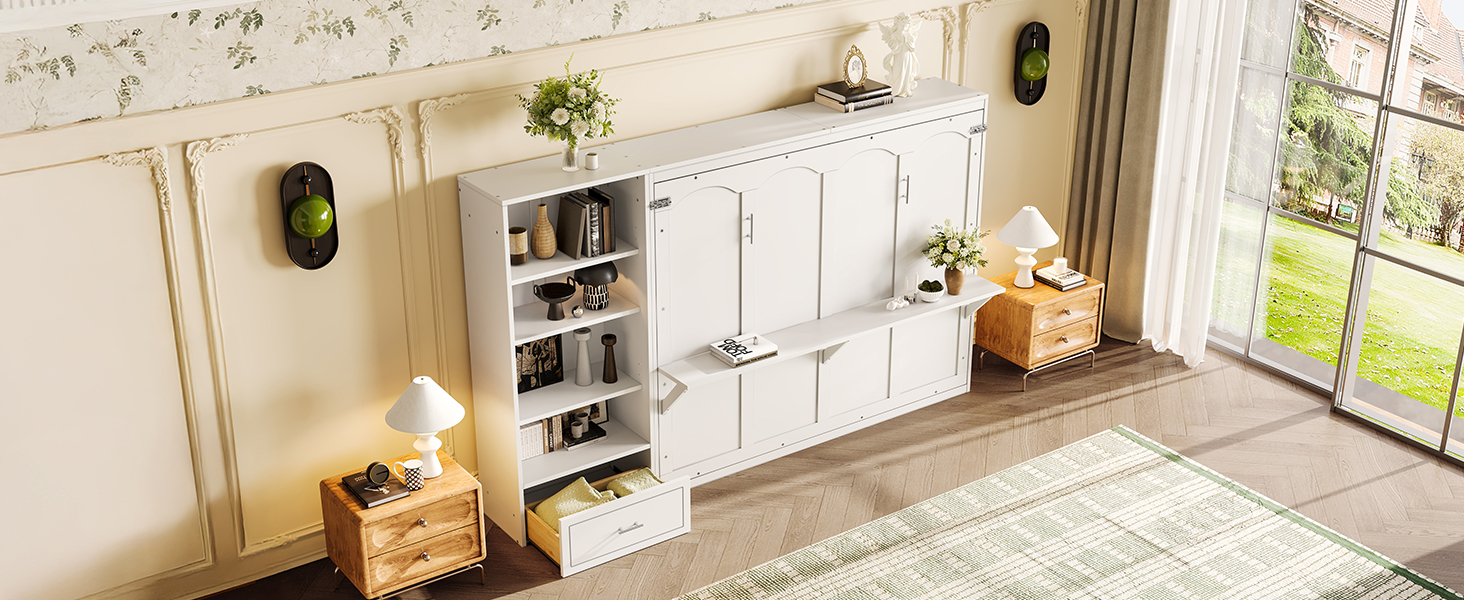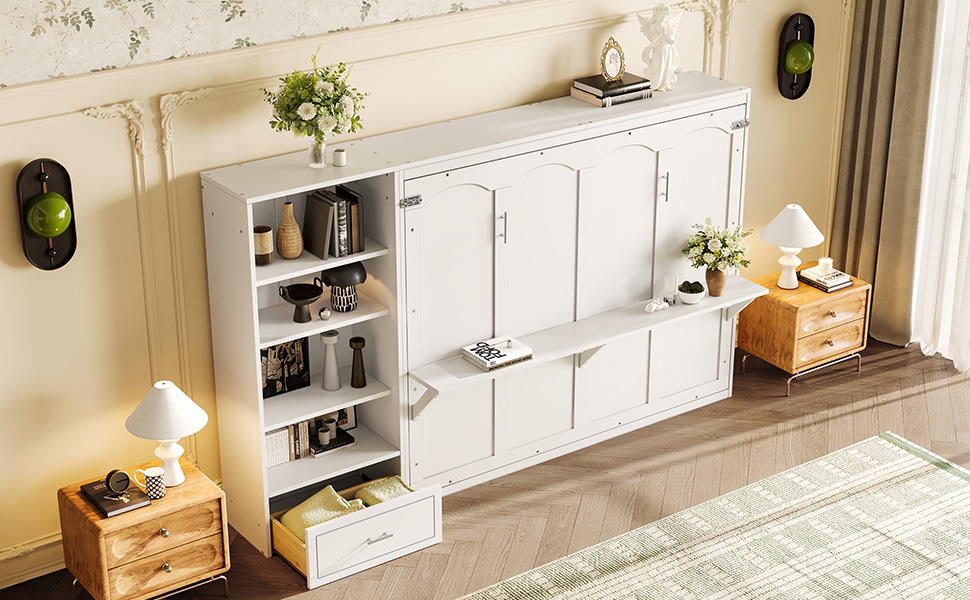- 4.Murphy Bed with Ample Storage Space: The 4 storage compartments on the side panel, along with the spacious bottom drawer, provide ample room for organizing bedding, clothing, and other daily essentials. With everything neatly stored away, you can keep your room tidy and clutter-free with ease.