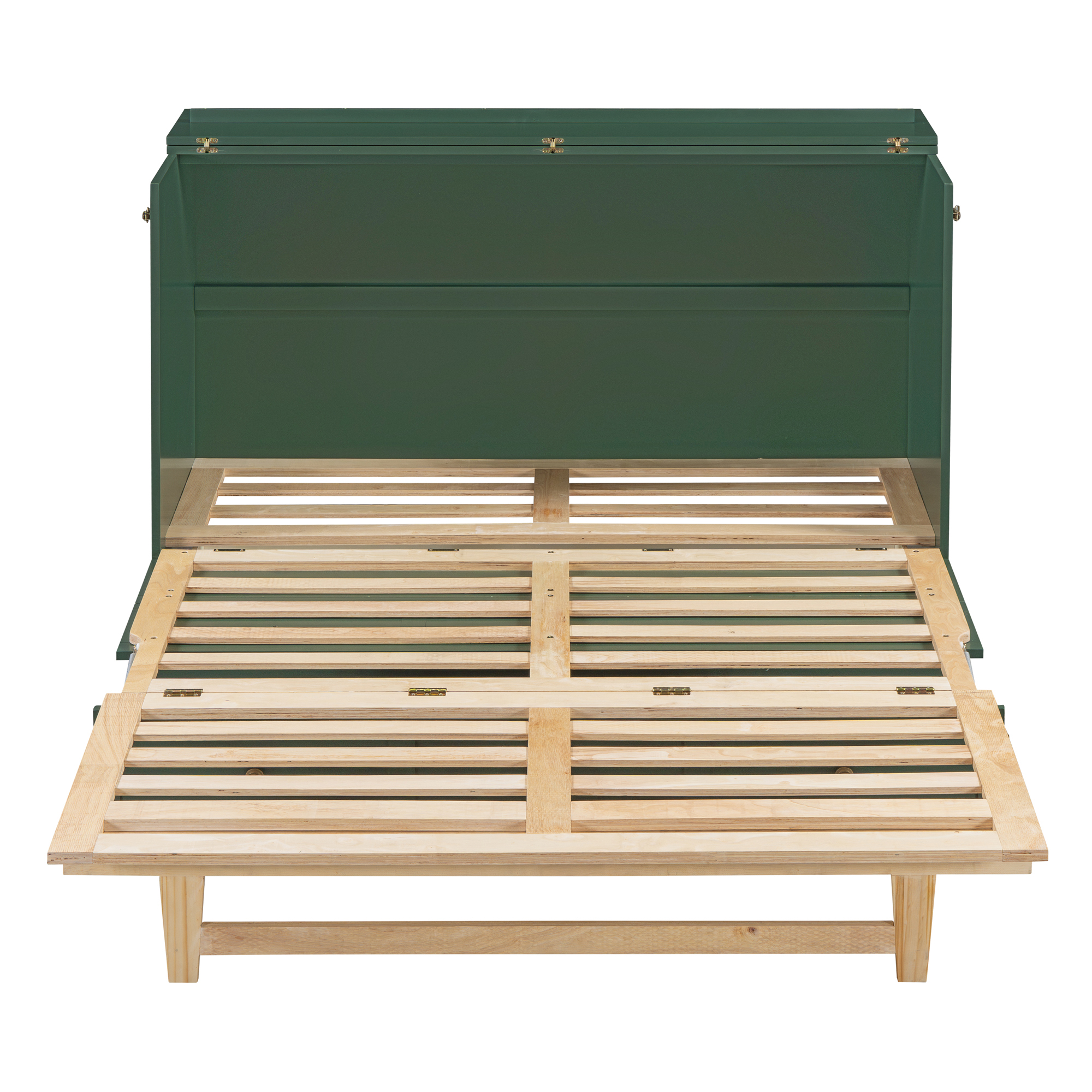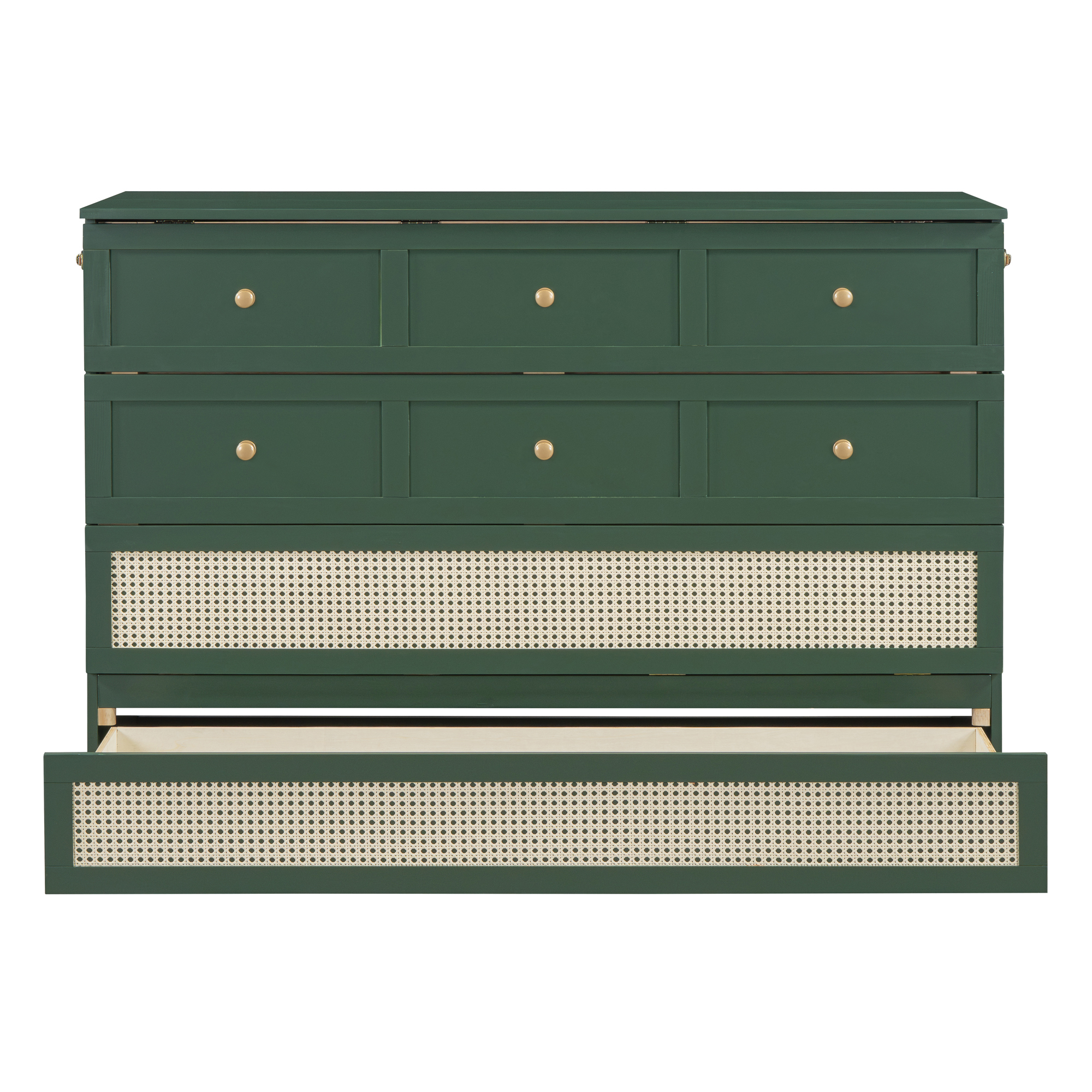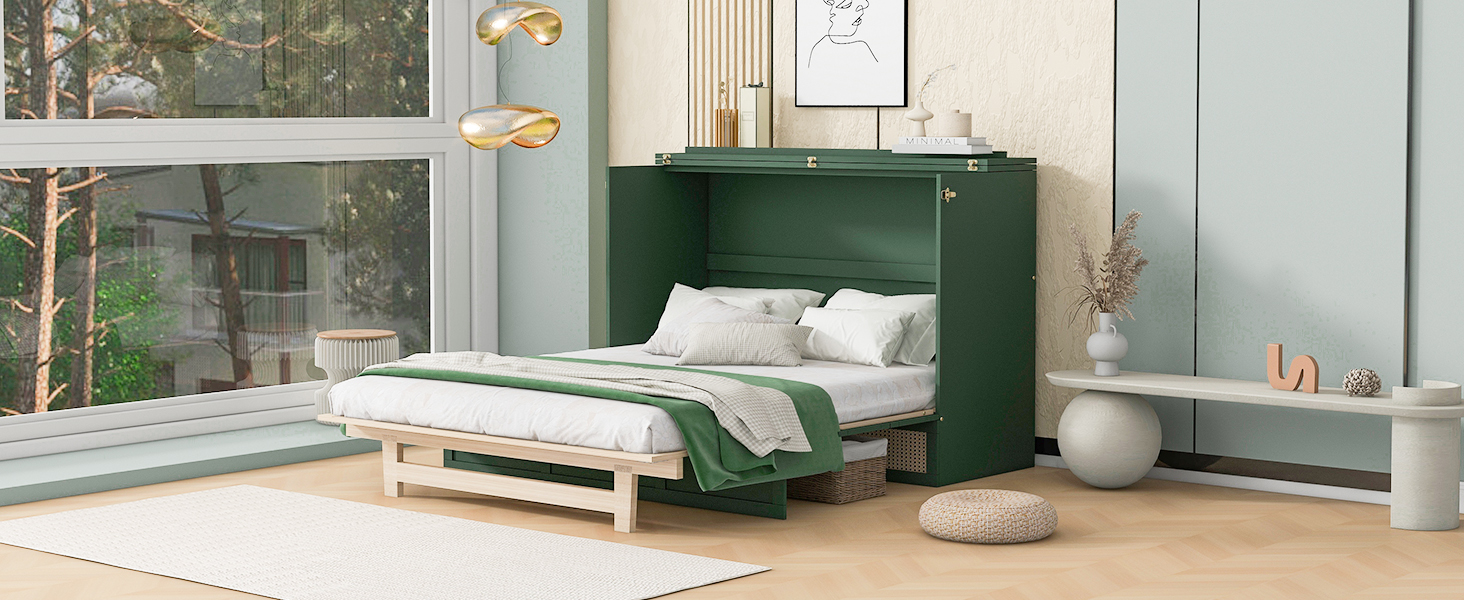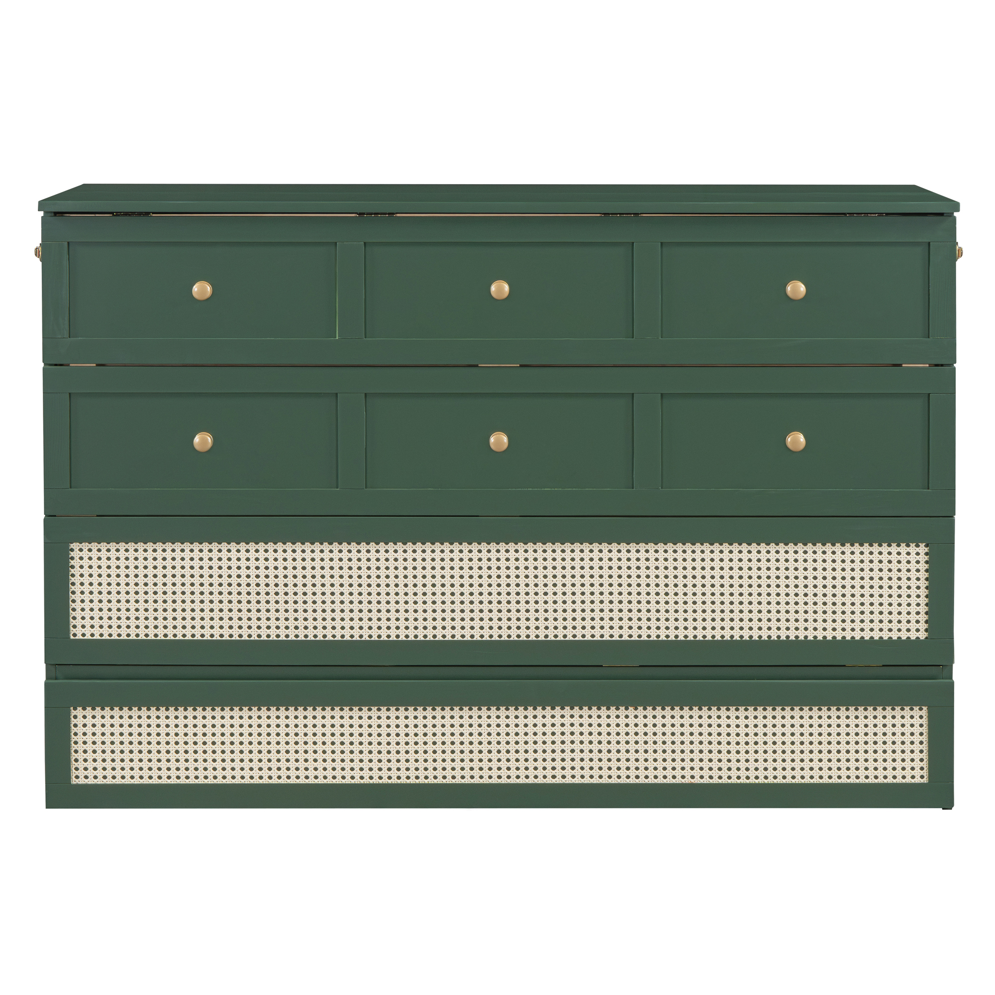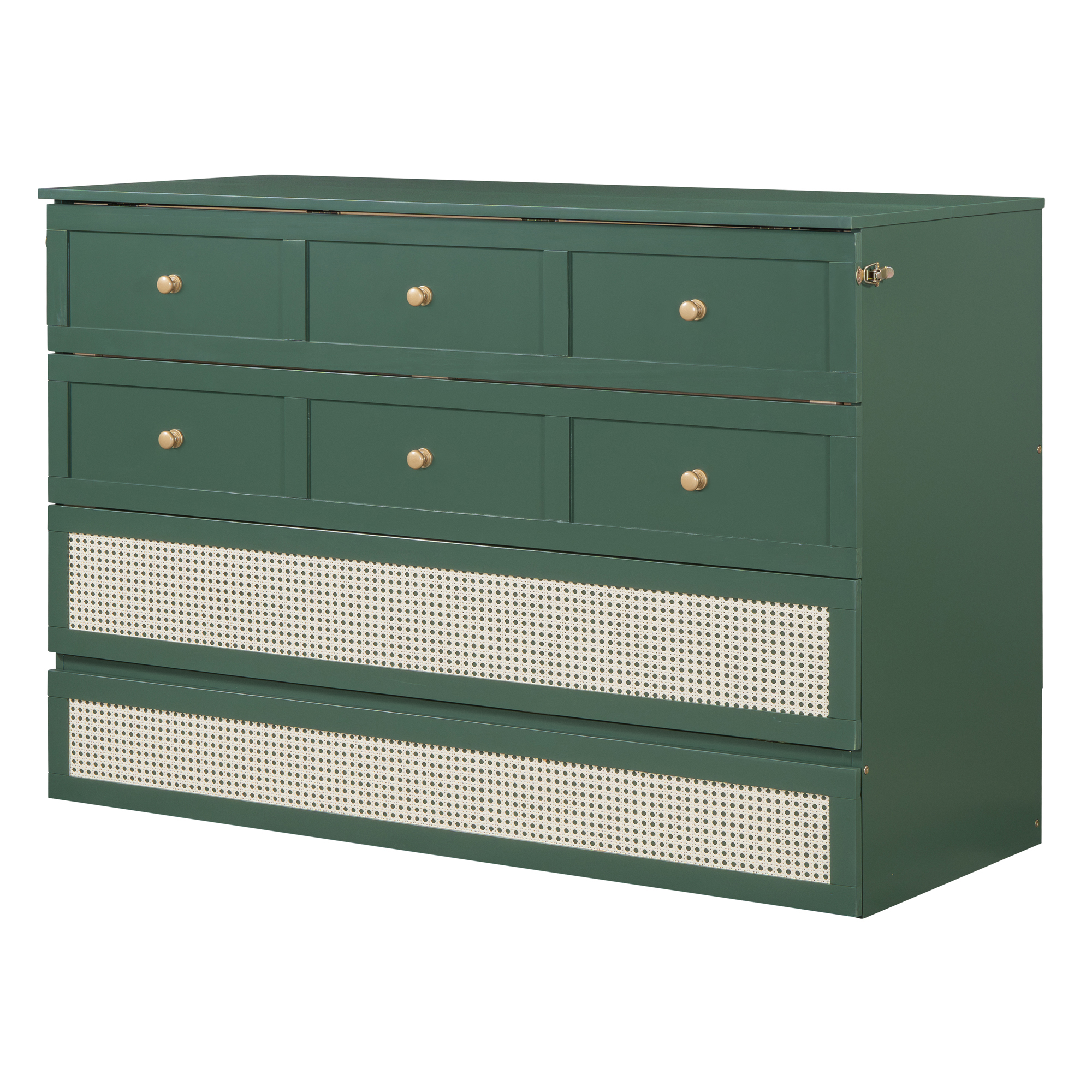 (Price Includes Shipping, No Tax Fee.)The unique design of the Murphy bed allows it to transform into an exquisite cabinet when folded up, greatly saving space and adding more flexibility to your living space. By fully utilizing space, it makes your room more spacious and tidy. Designed in full size, it can withstand weights of up to 450 pounds, providing a sturdy sleeping environment for you to enjoy ultimate comfort. Whether used by one person or shared by two, it ensures a cozy sleep experience. The bed comes with spacious storage drawers at the bottom, allowing you to easily store bedding, clothes, and other items, keeping your space organized and making daily life more convenient. The front design of the Murphy bed is uniquely crafted, with classic and elegant false drawers on the upper layers and stylish rattan-patterned designs on the lower layers. Available in three colors – white, gray, and green – it meets different decoration needs, adding a touch of sophistication to your living space.