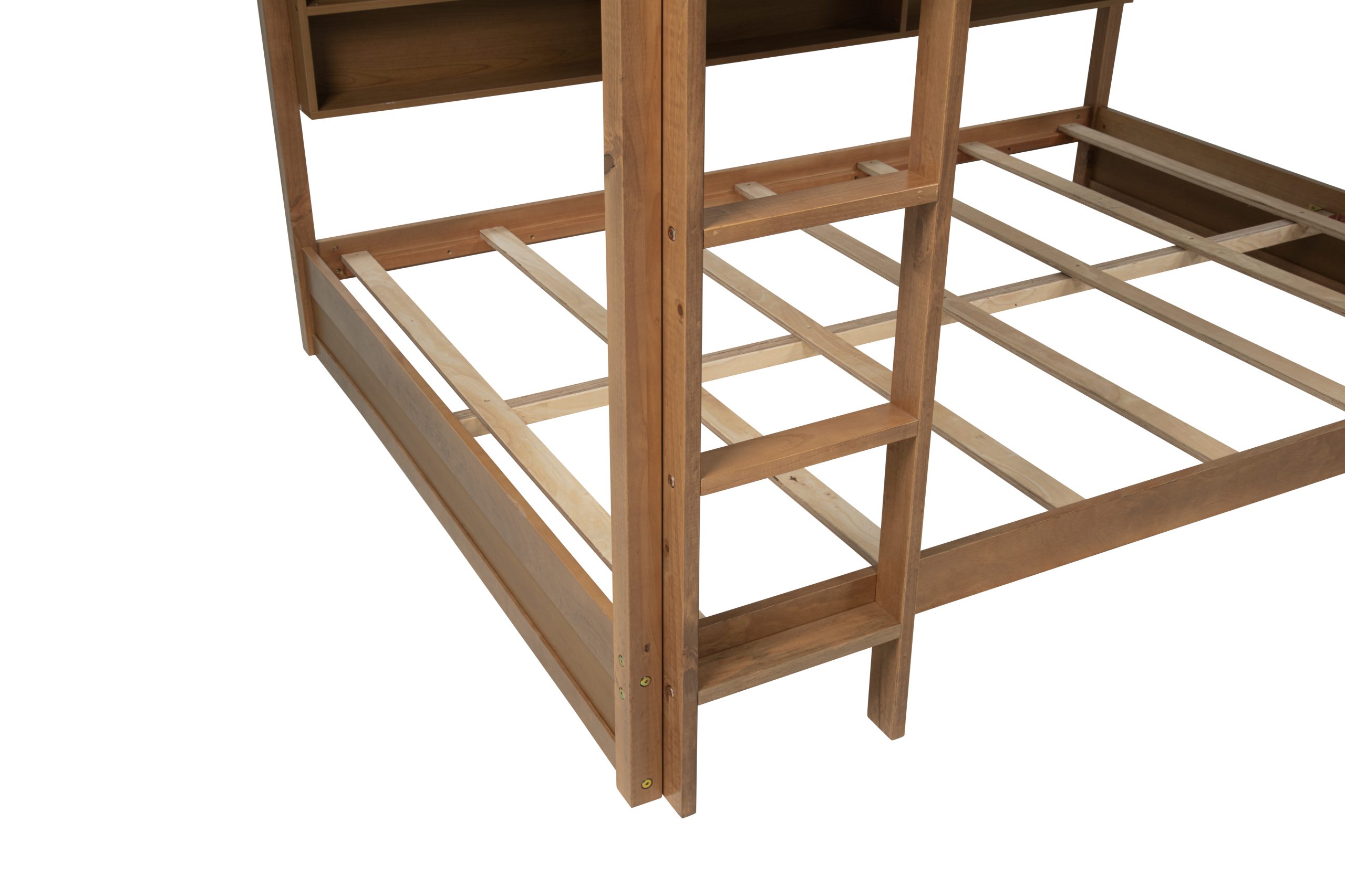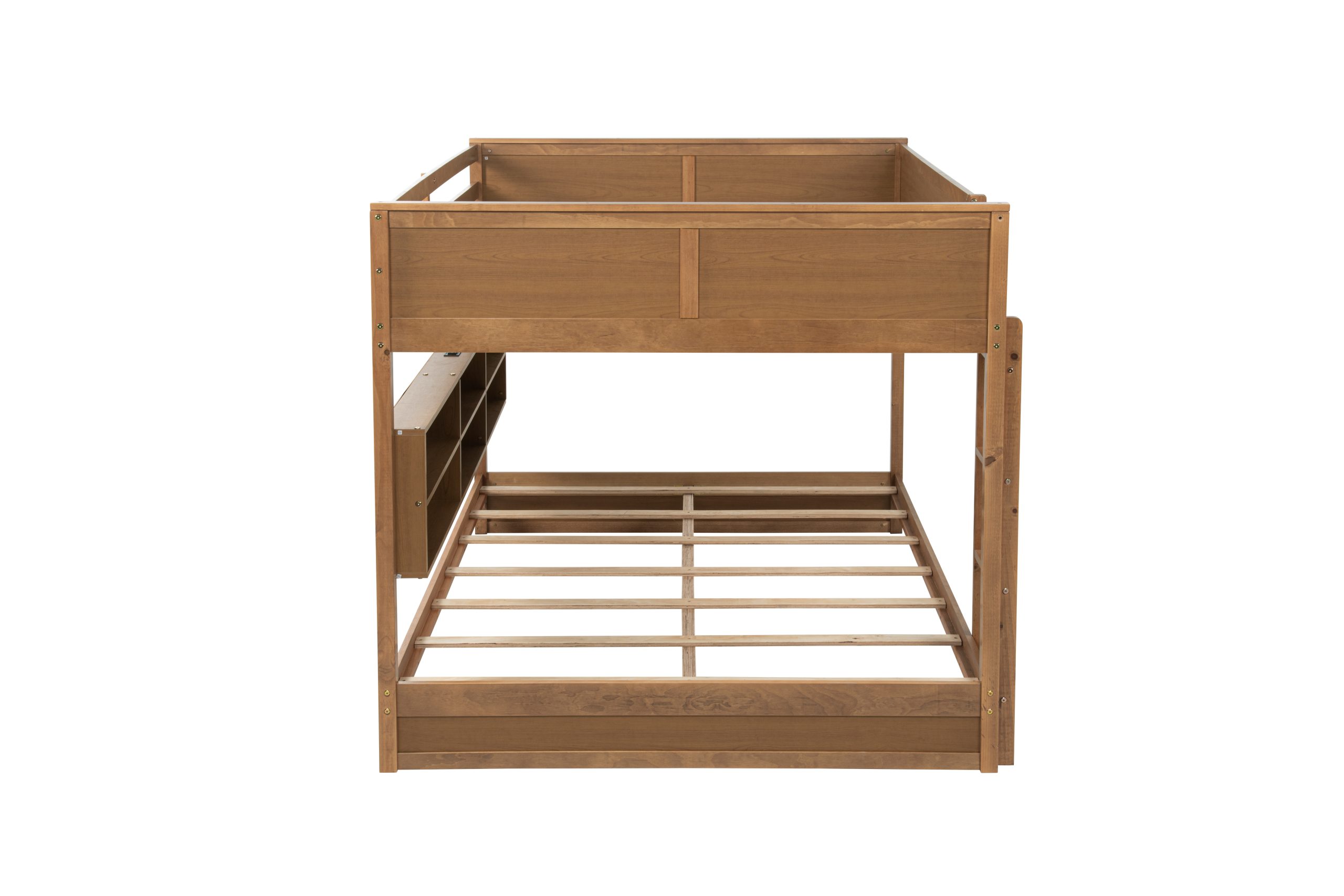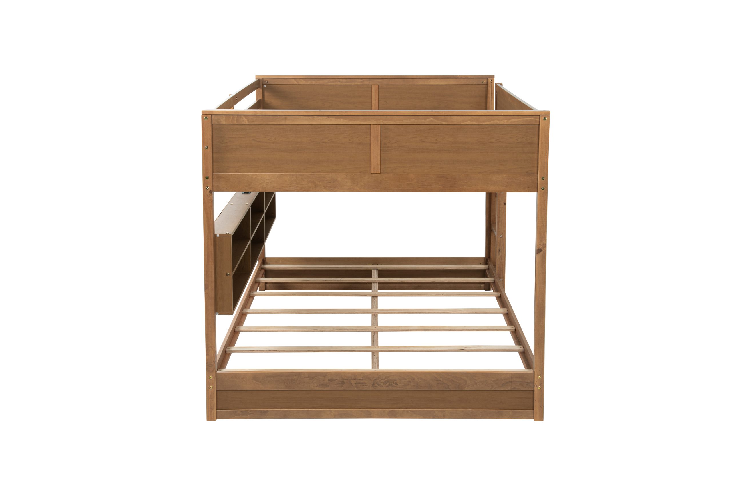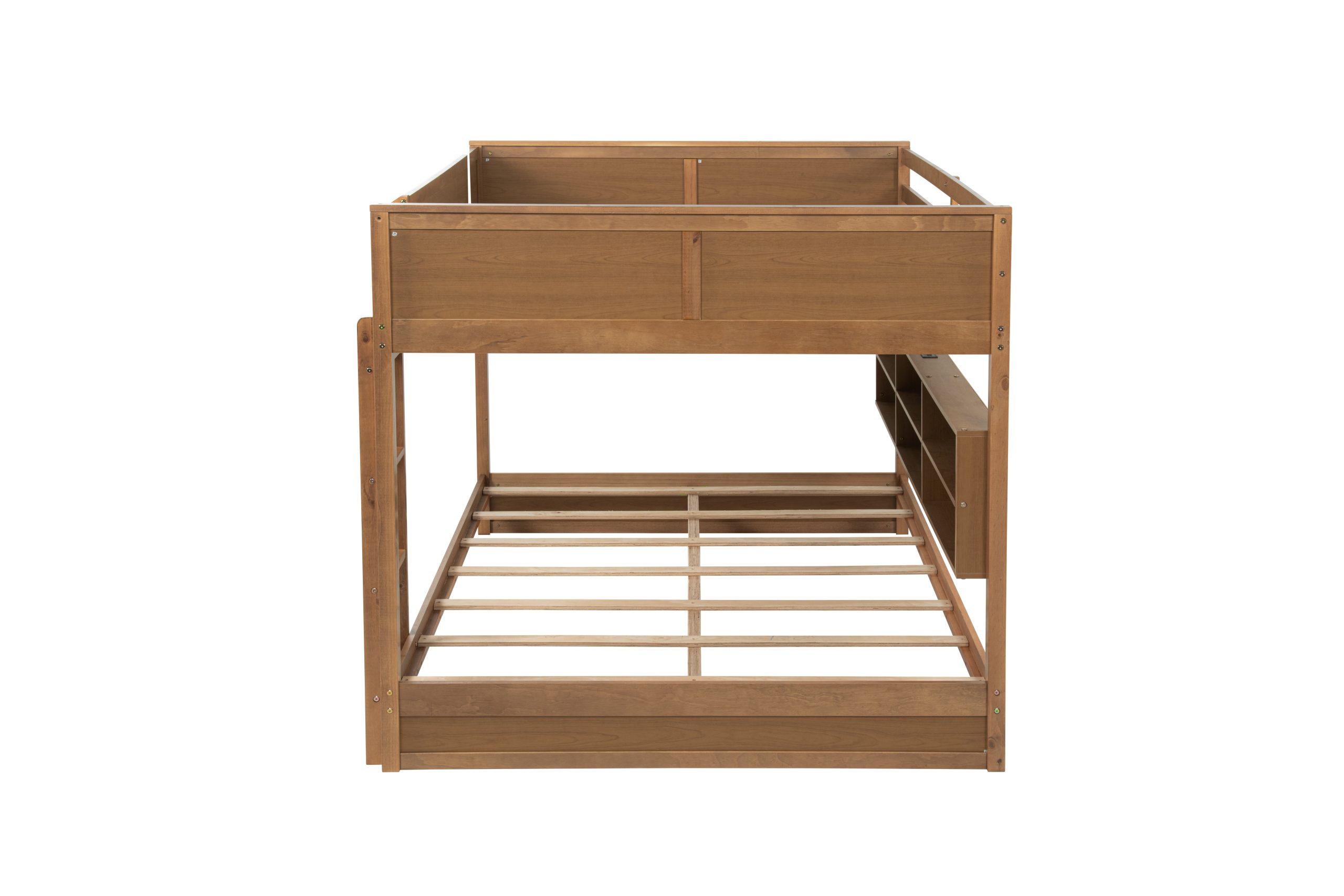 This queen-over-queen floor bunk bed, meticulously designed and exquisitely crafted, features integrated storage shelves, a charging station, and a ladder, offering functional storage solutions. The upper bunk is equipped with safety guardrails, while the ladder provides convenient access to the top sleeping platform. Serving as an ideal centerpiece, it enhances the aesthetic appeal across a diverse range of bedroom themes. This bunk bed masterfully integrates sleeping, storage, and practical functionalities into this perfect unit.