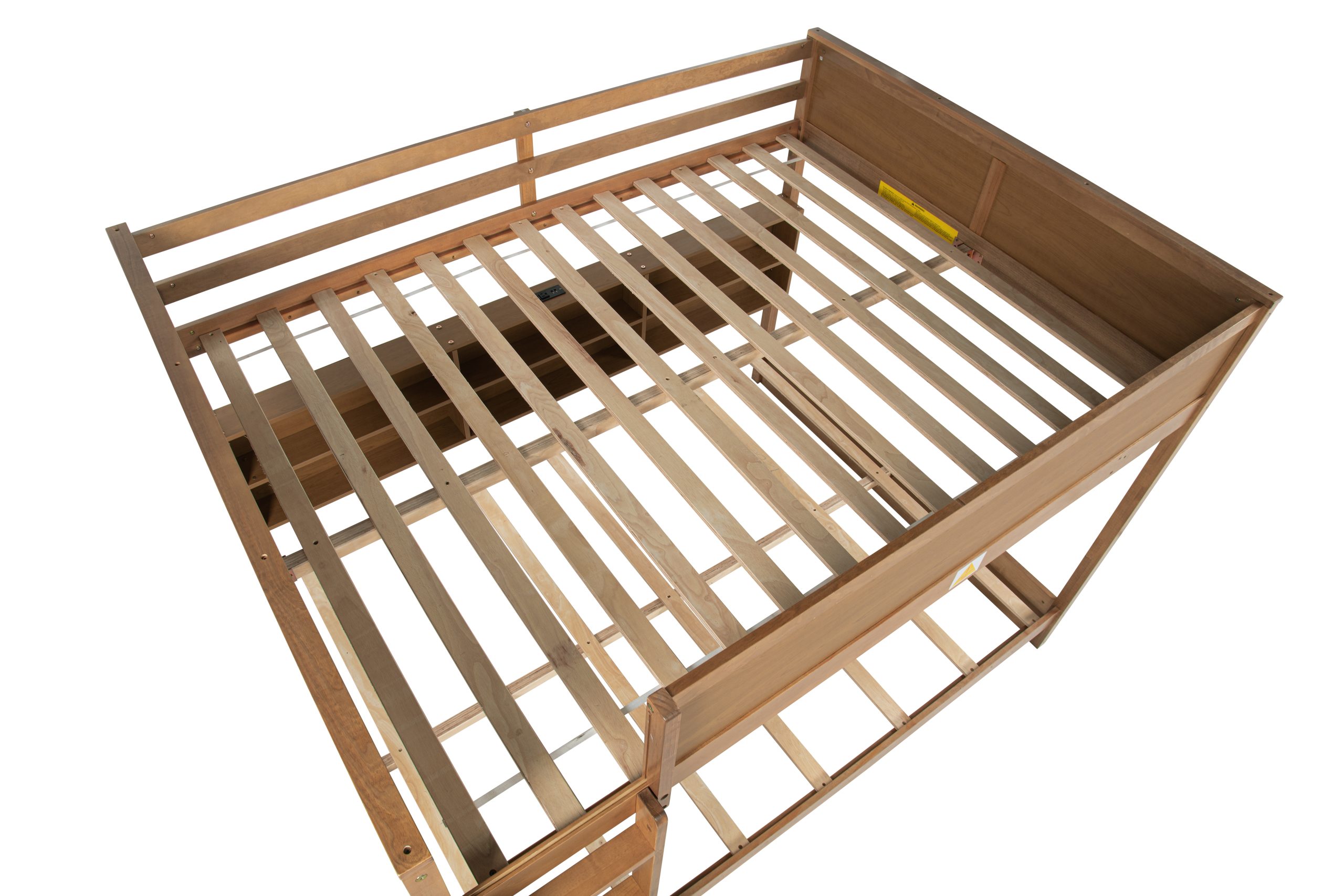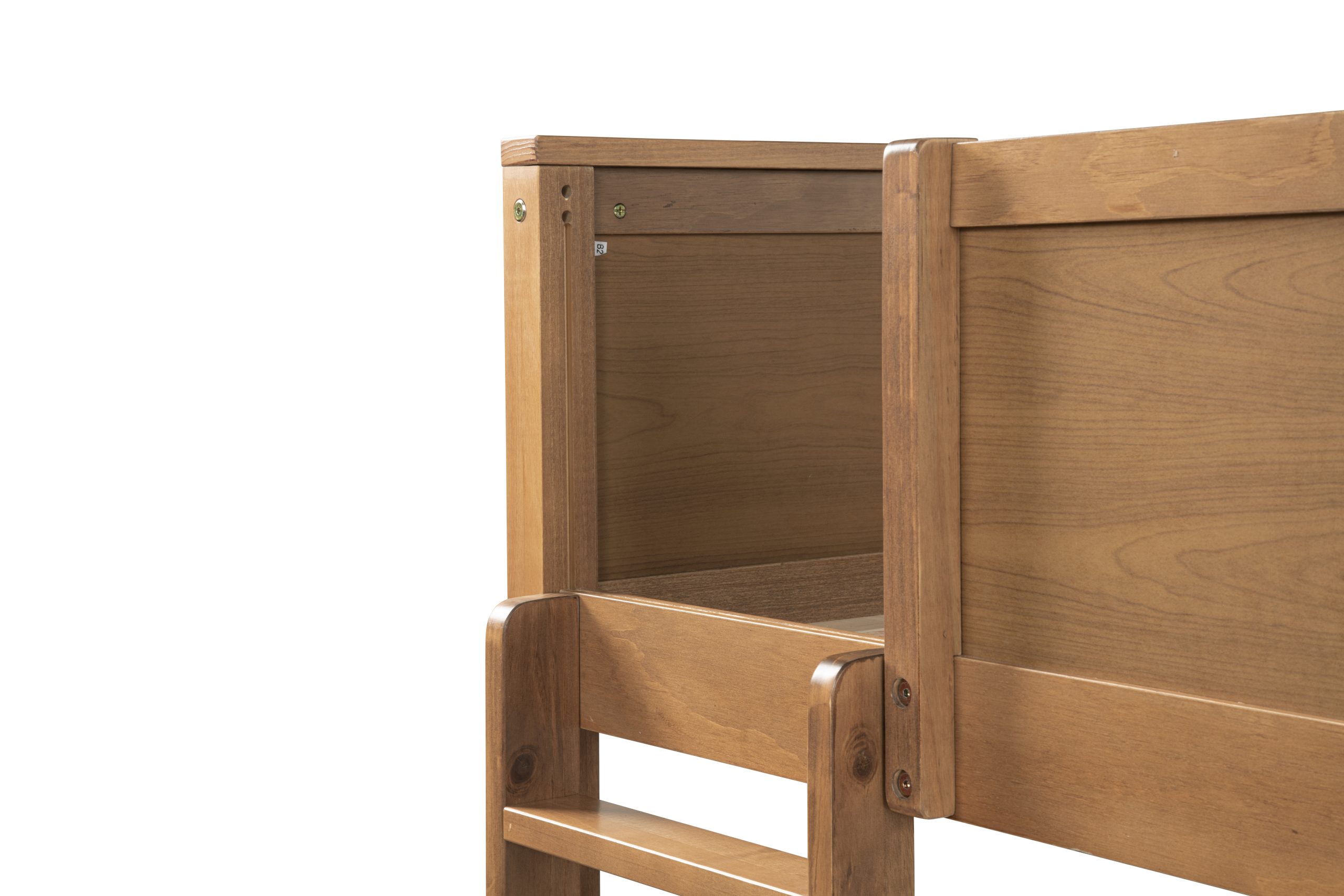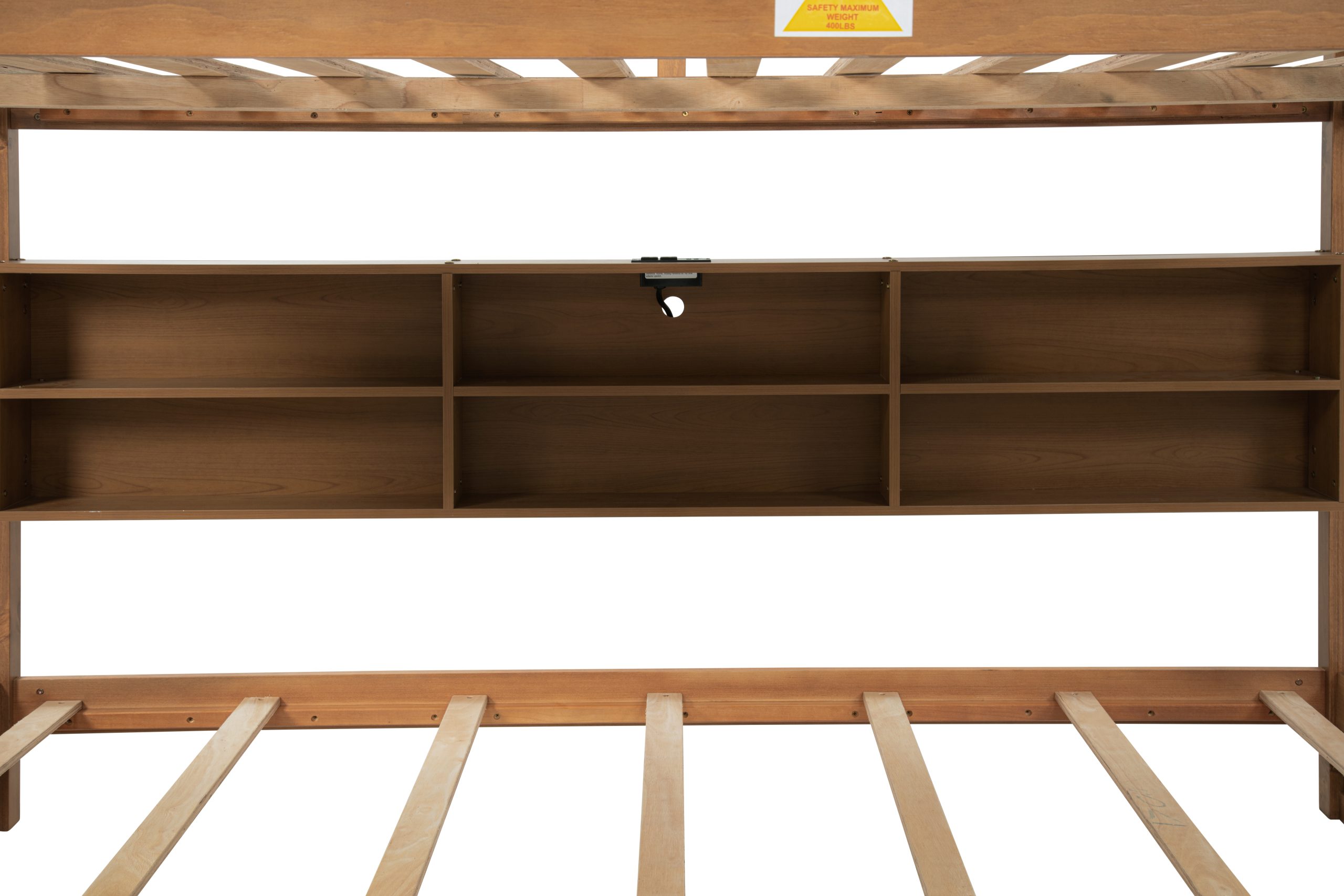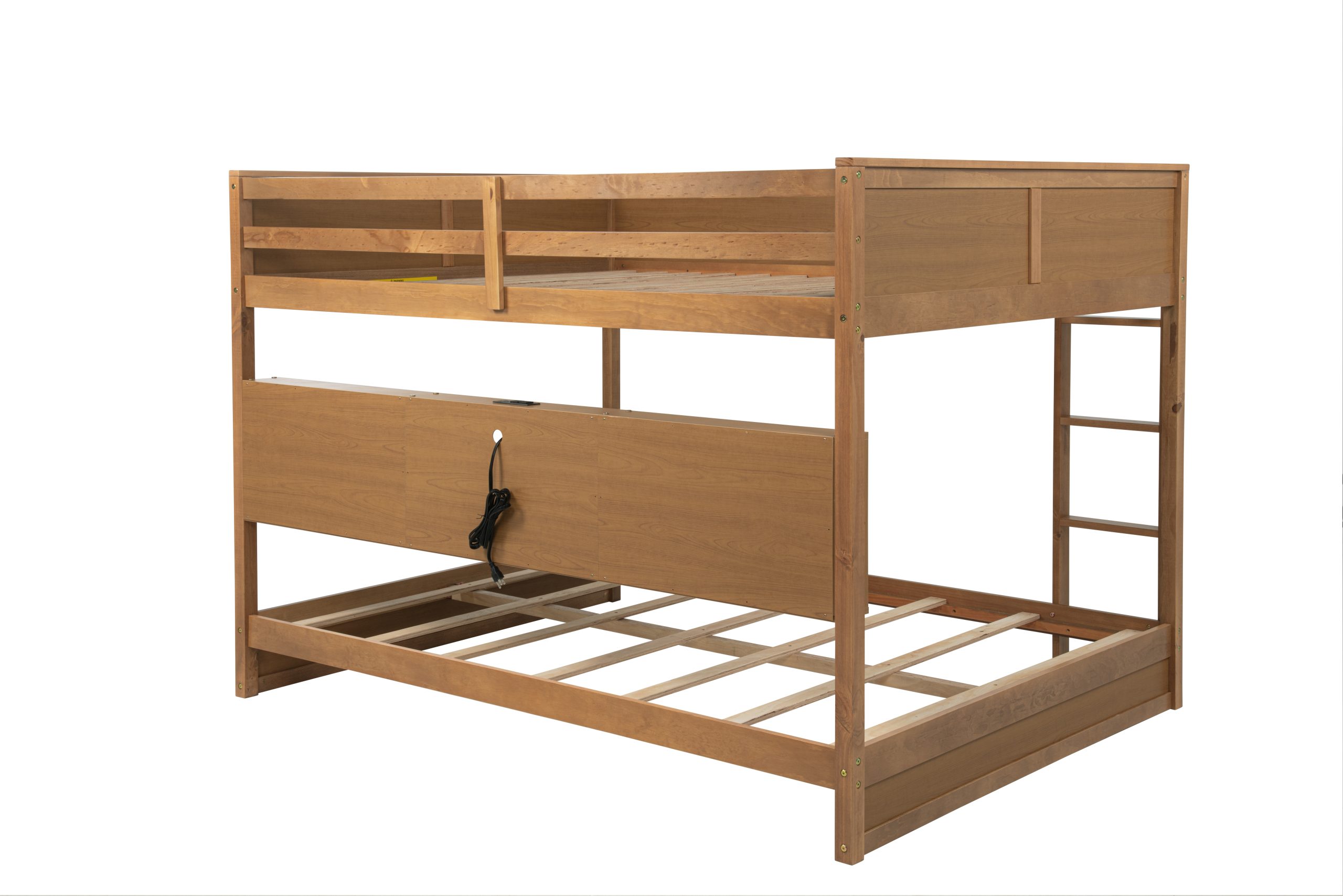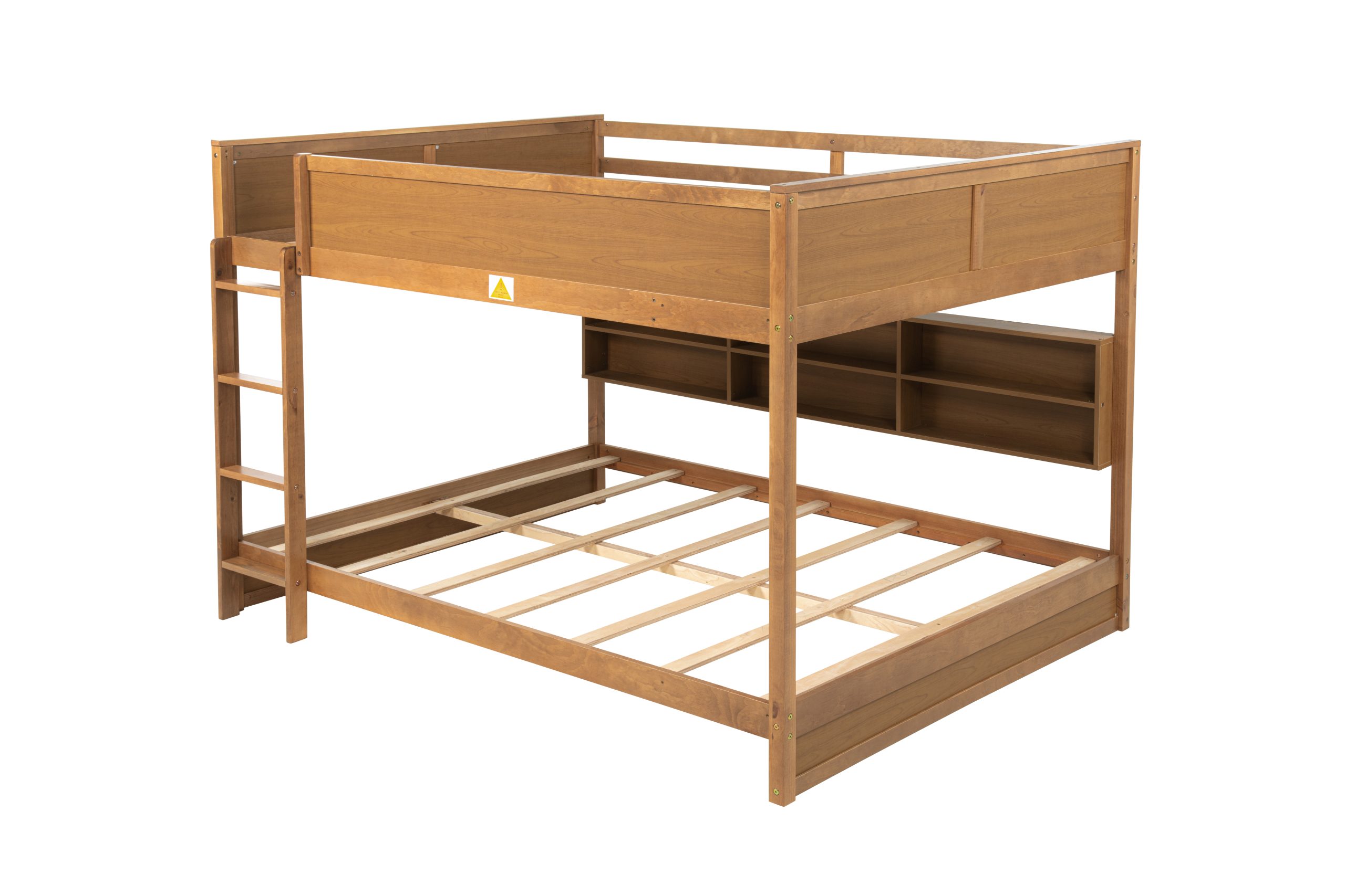 This queen-over-queen floor bunk bed, meticulously designed and exquisitely crafted, features integrated storage shelves, a charging station, and a ladder, offering functional storage solutions. The upper bunk is equipped with safety guardrails, while the ladder provides convenient access to the top sleeping platform. Serving as an ideal centerpiece, it enhances the aesthetic appeal across a diverse range of bedroom themes. This bunk bed masterfully integrates sleeping, storage, and practical functionalities into this perfect unit.