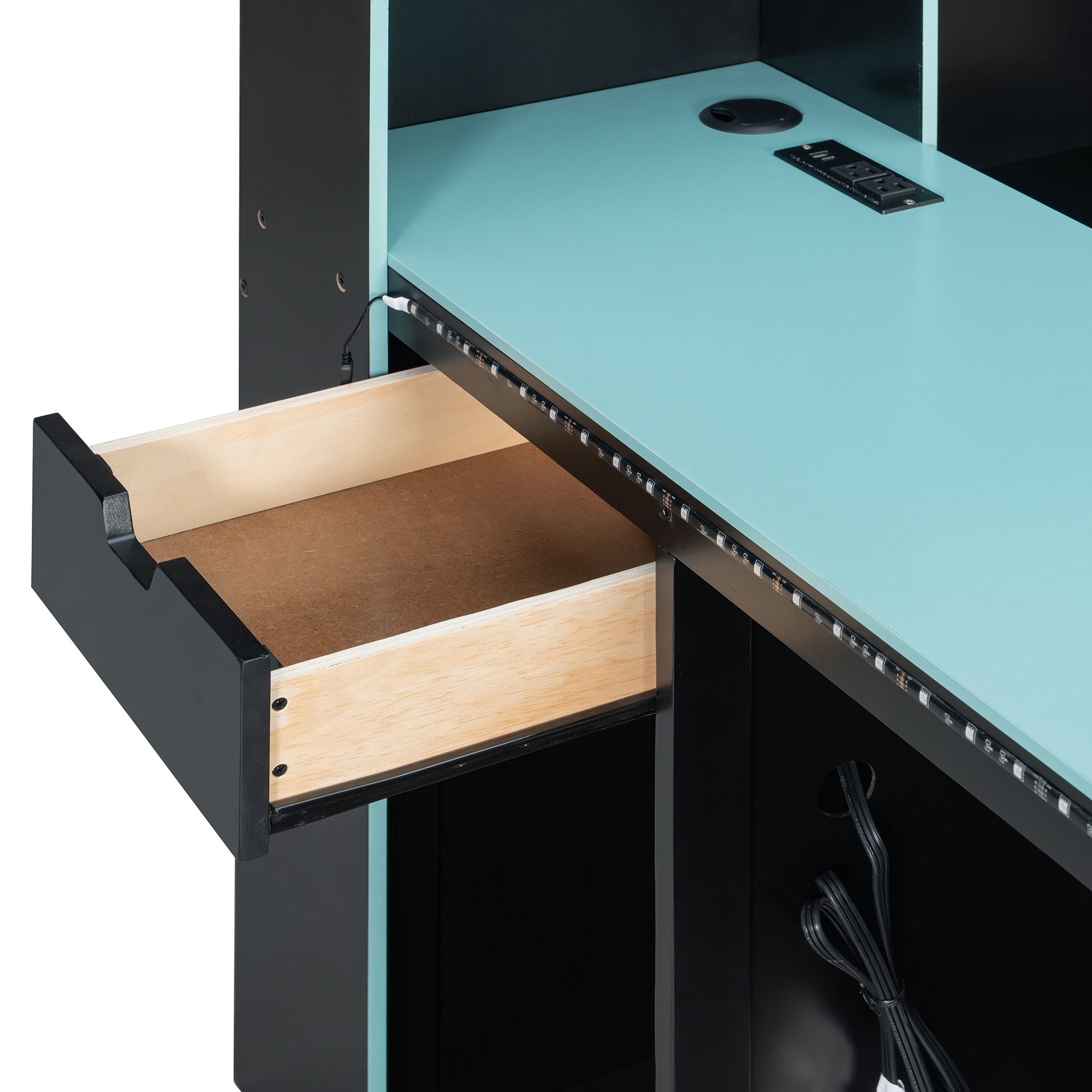 - Atmospheric Lighting & Power: Elevate your room’s vibe with the integrated light strips that offer customizable colors and modes to match your gaming rig’s aesthetic. The desk also features a built-in power strip with multiple outlets and USB charging ports, ensuring that your PC, smartphone, and controllers are always powered up and ready for action without messy cord tangles.