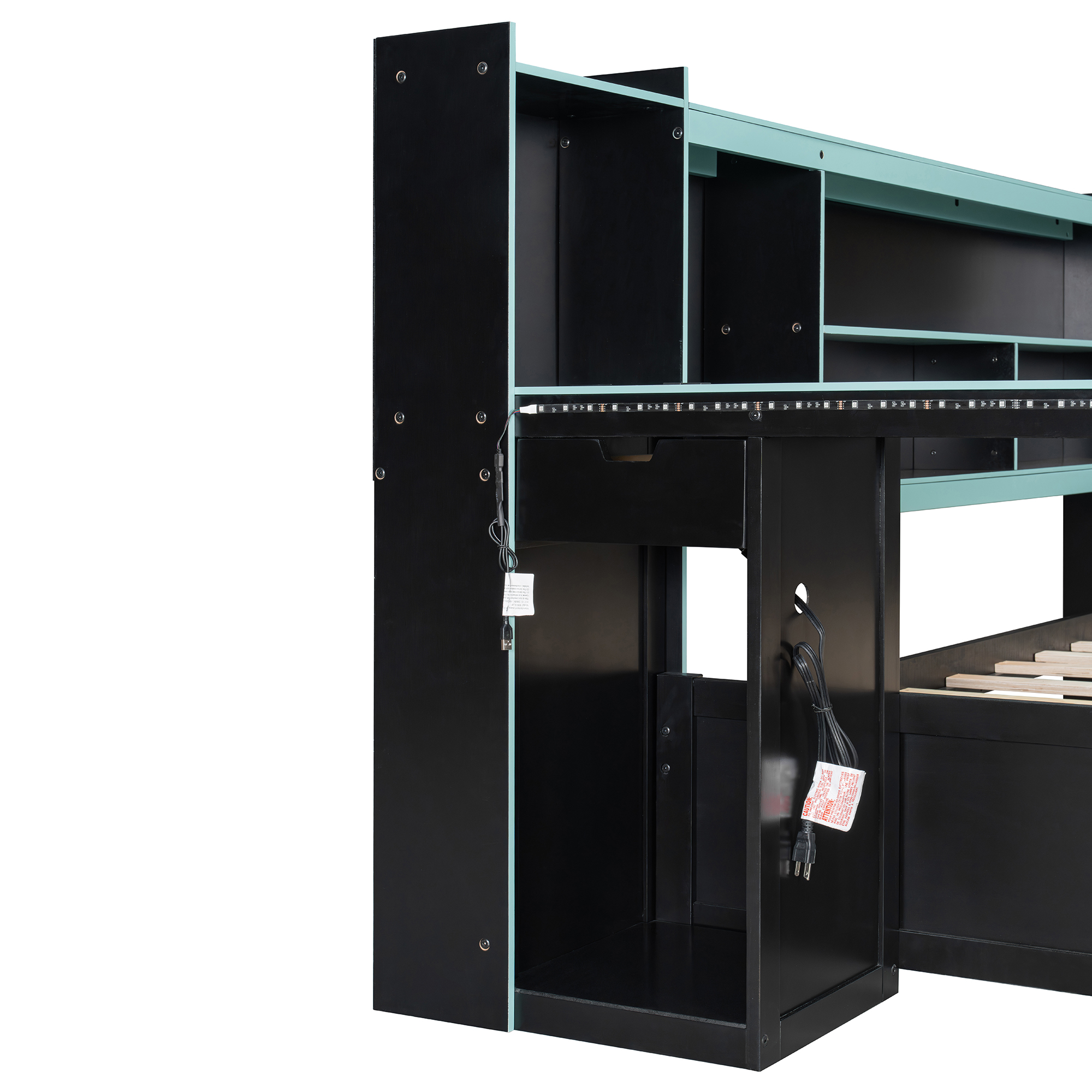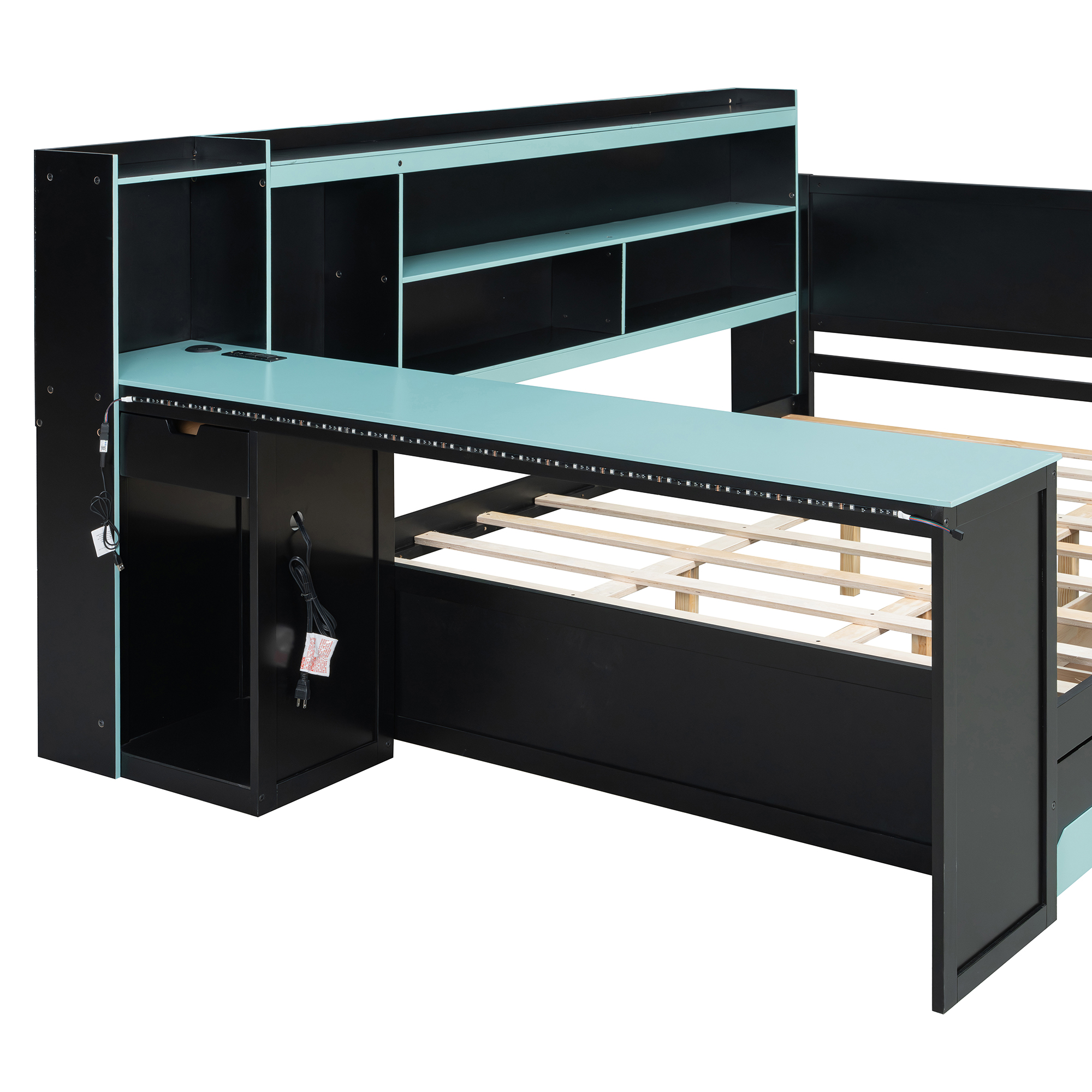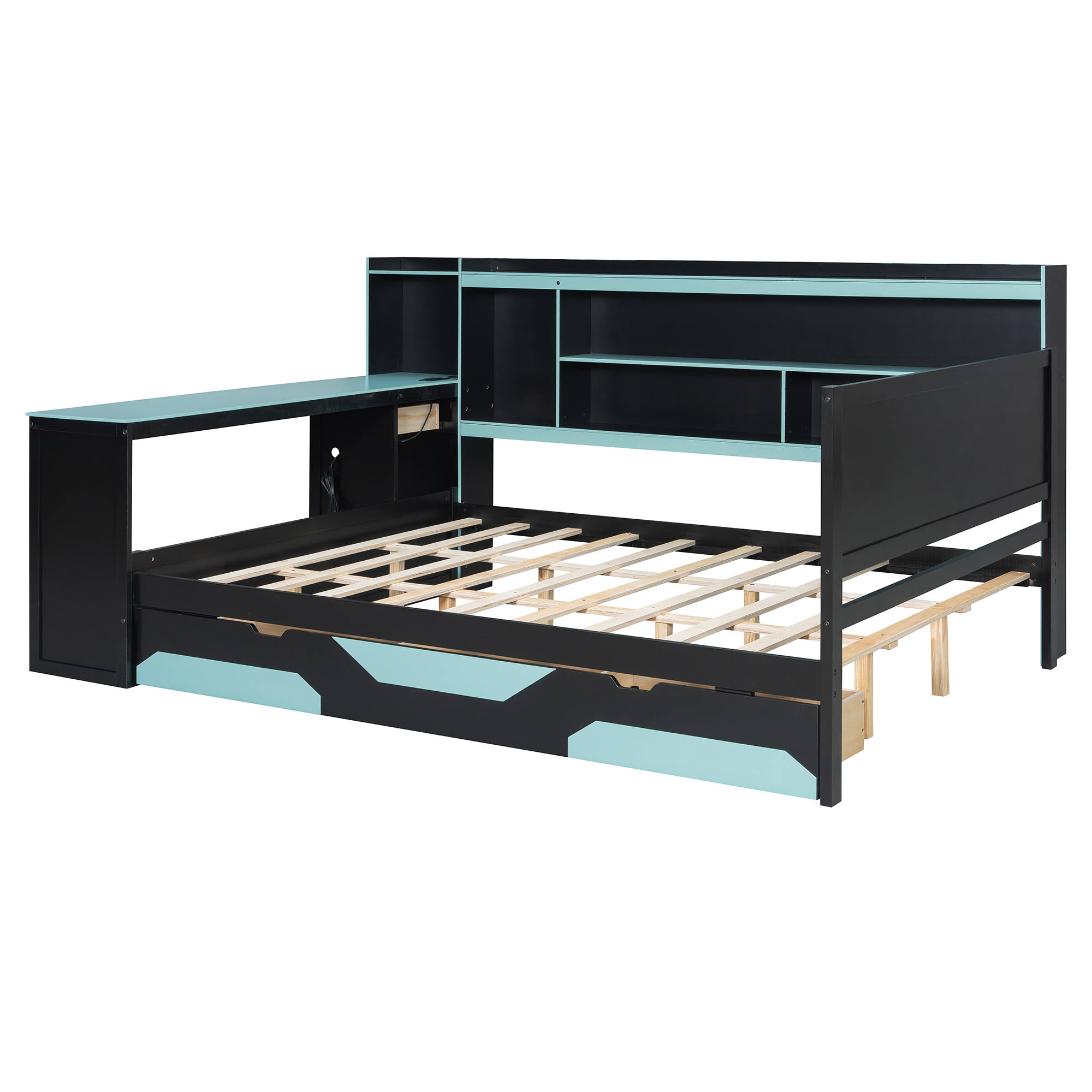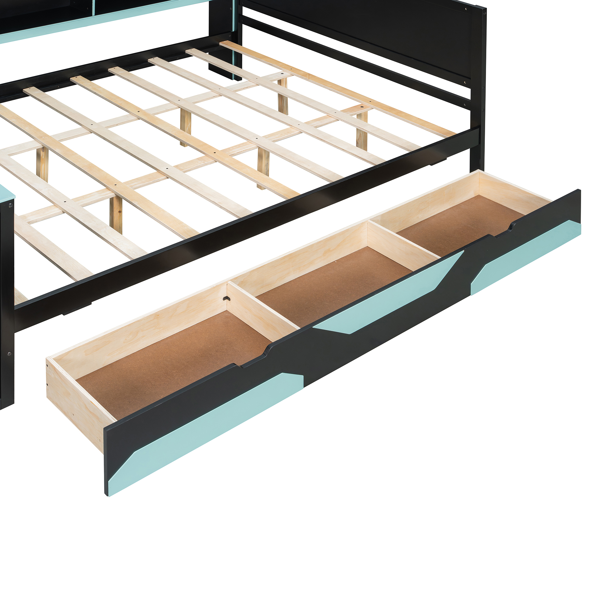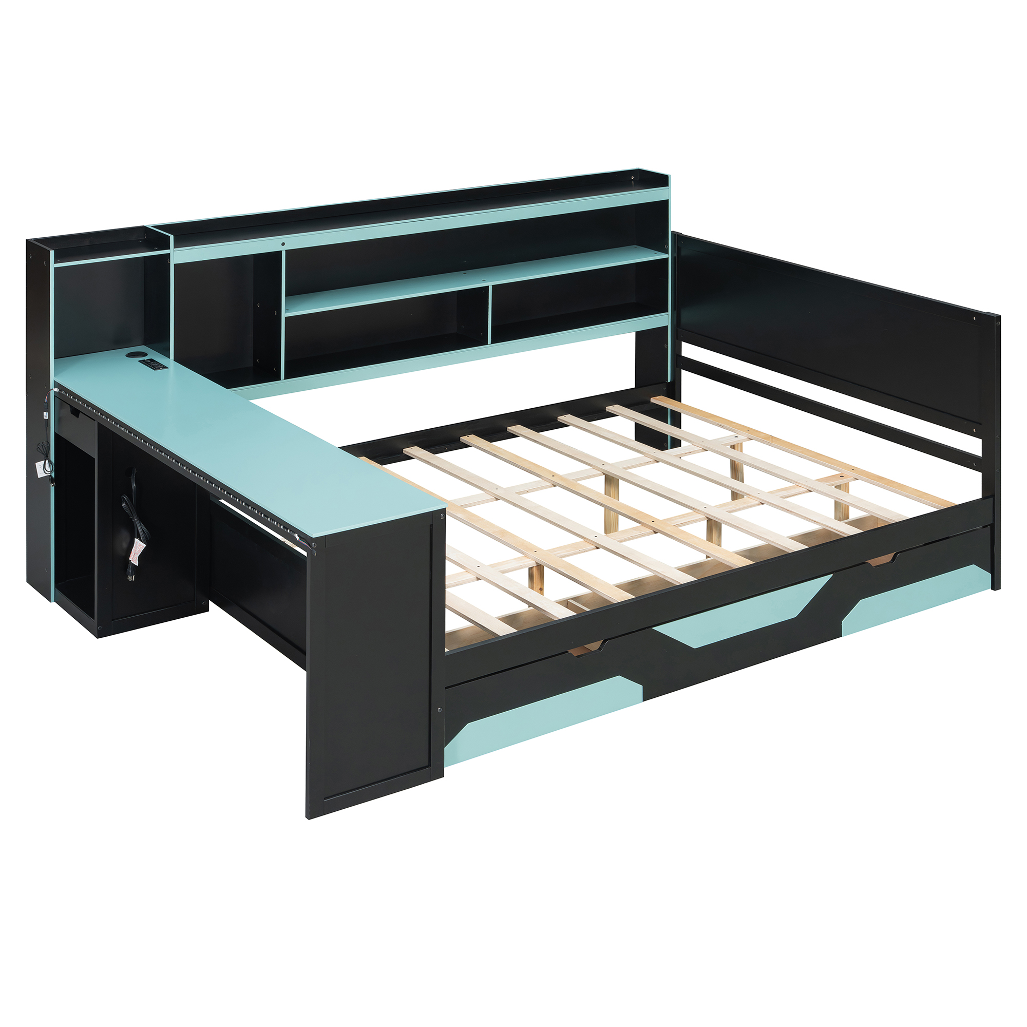 - Massive Under-Bed Storage Drawers: Maximize your organization with three oversized, smooth-gliding drawers located beneath the bed frame. These drawers provide ample space for storing extra bedding, clothes, or gaming peripherals, keeping your room clutter-free. The drawers feature a unique geometric red/blue-and-black design that perfectly complements the futuristic theme of the entire bed set.
