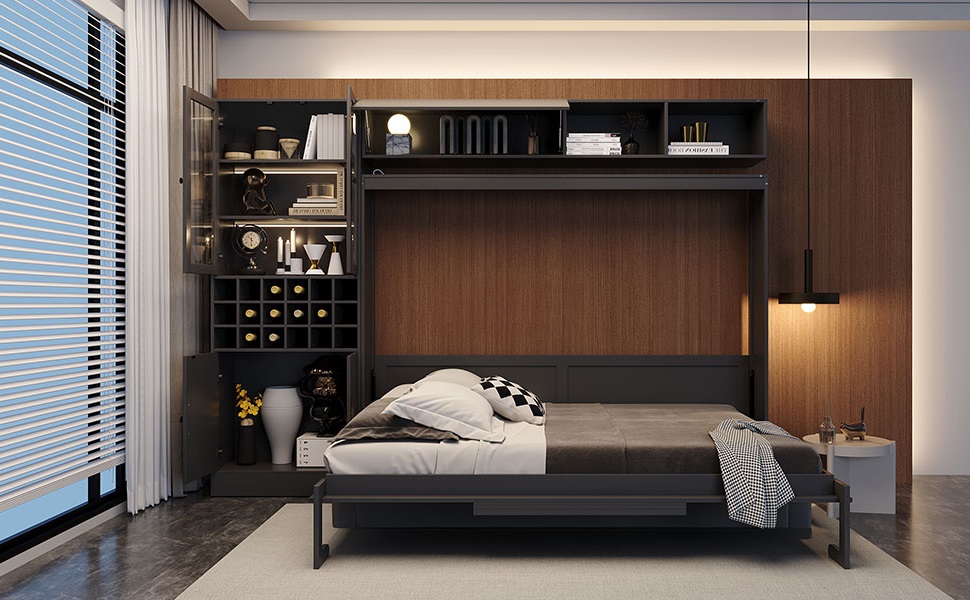 The Murphy Bed not only provides a comfortable sleeping space but also incorporates a sofa, seamlessly blending the functionalities of both to meet diverse spatial needs effortlessly. With its unique storage design, the bed and mattress can be easily stowed away together, maximizing space efficiency and keeping your living area tidy. This space-saving bed can be slept on every night and works perfectly in a small apartment or studio. The hide away bed is easy to use, simply pull on the handles and flip the support leg down onto the floor.