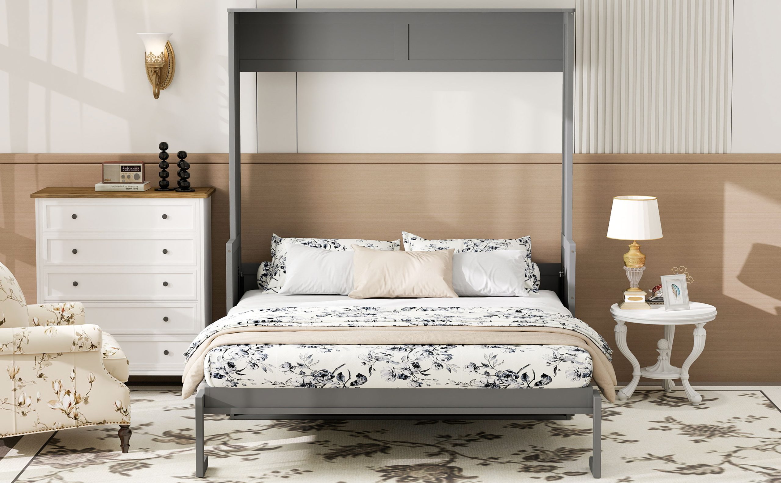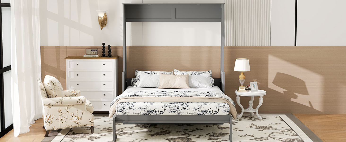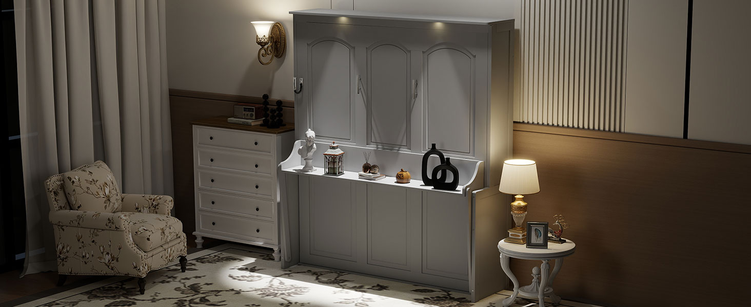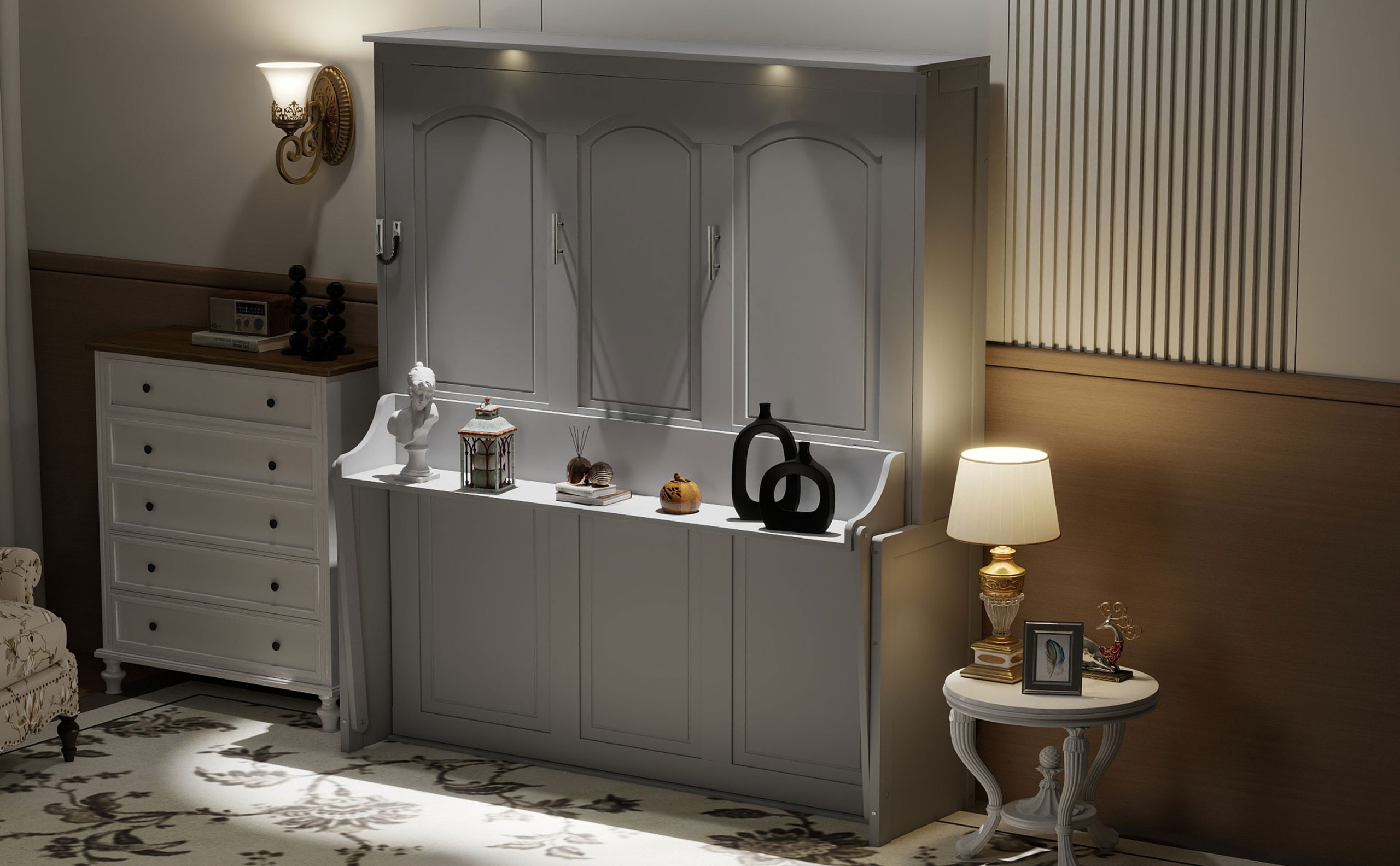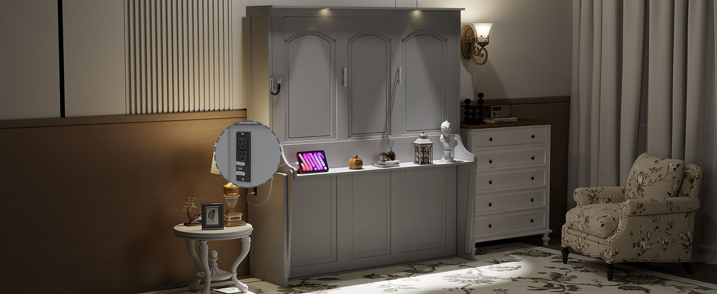 (Price Includes Shipping, No Tax Fee.)This Queen – size Murphy bed is a masterstroke of multifunctional design, seamlessly integrating practicality and style. When not in use as a bed, it folds away to reveal a sleek desk surface, transforming your space into a productive home office or study area with ease.Illumination is thoughtfully provided with two integrated LED lights at the top, casting soft, focused light to illuminate your work or reading area. Meanwhile, the USB charging ports on the side panels offer convenient charging solutions for your devices, keeping your tech powered up while you work or relax.Crafted with a sleek, modern aesthetic, this Murphy bed is a perfect fit for small – space living, guest rooms, or home offices. It not only maximizes your room’s utility but also enhances the overall look with its stylish design, making it a versatile and visually appealing addition to any space.