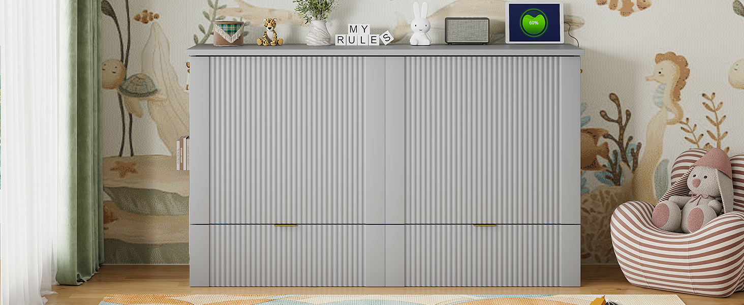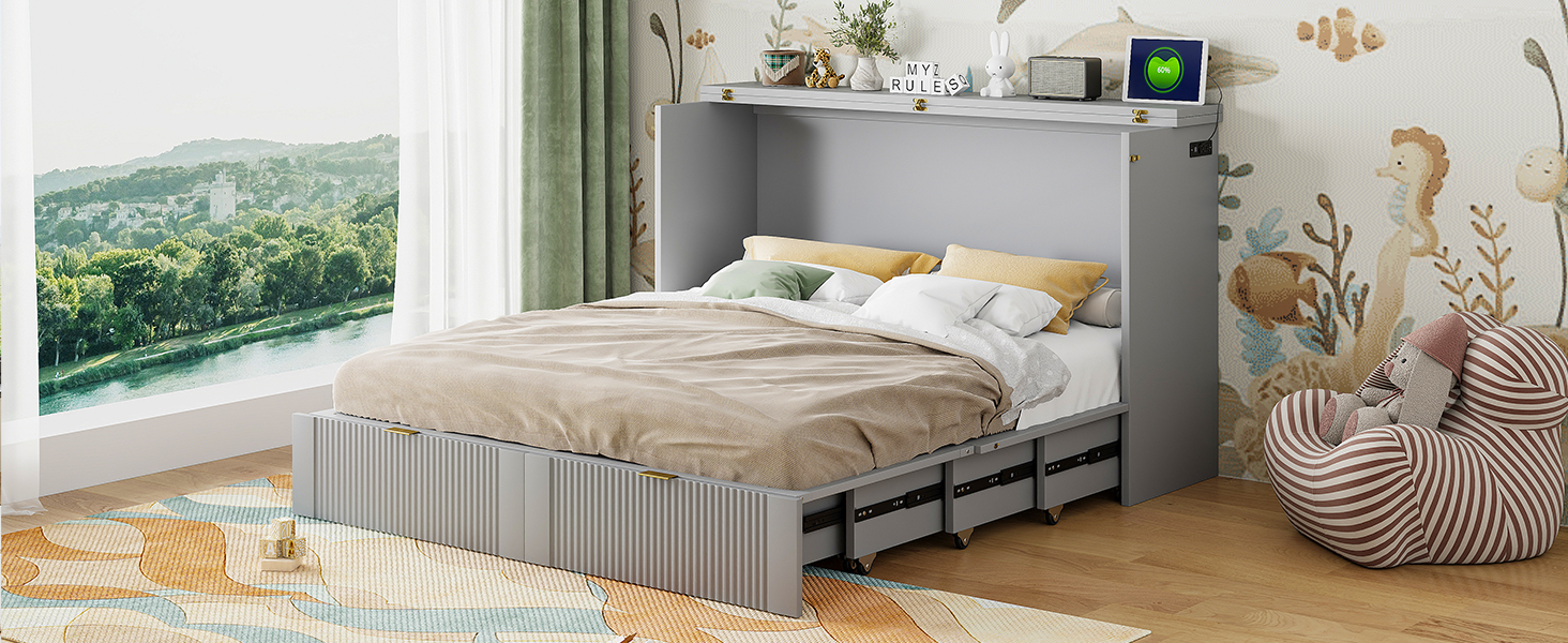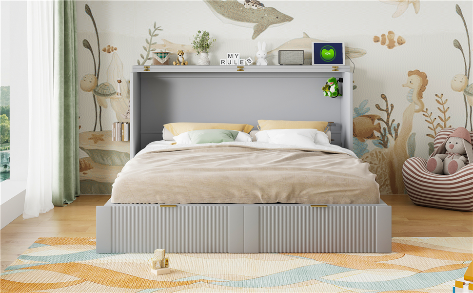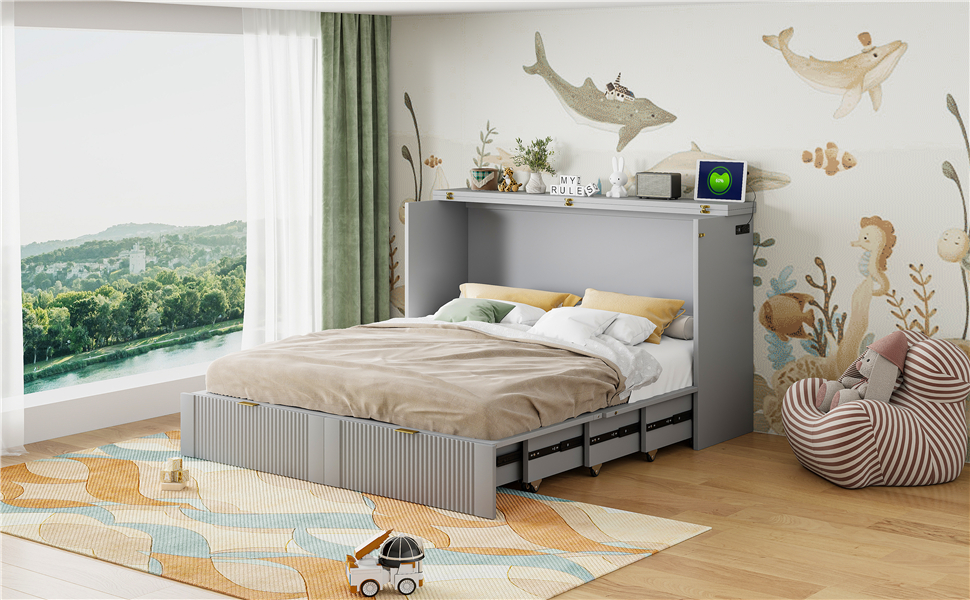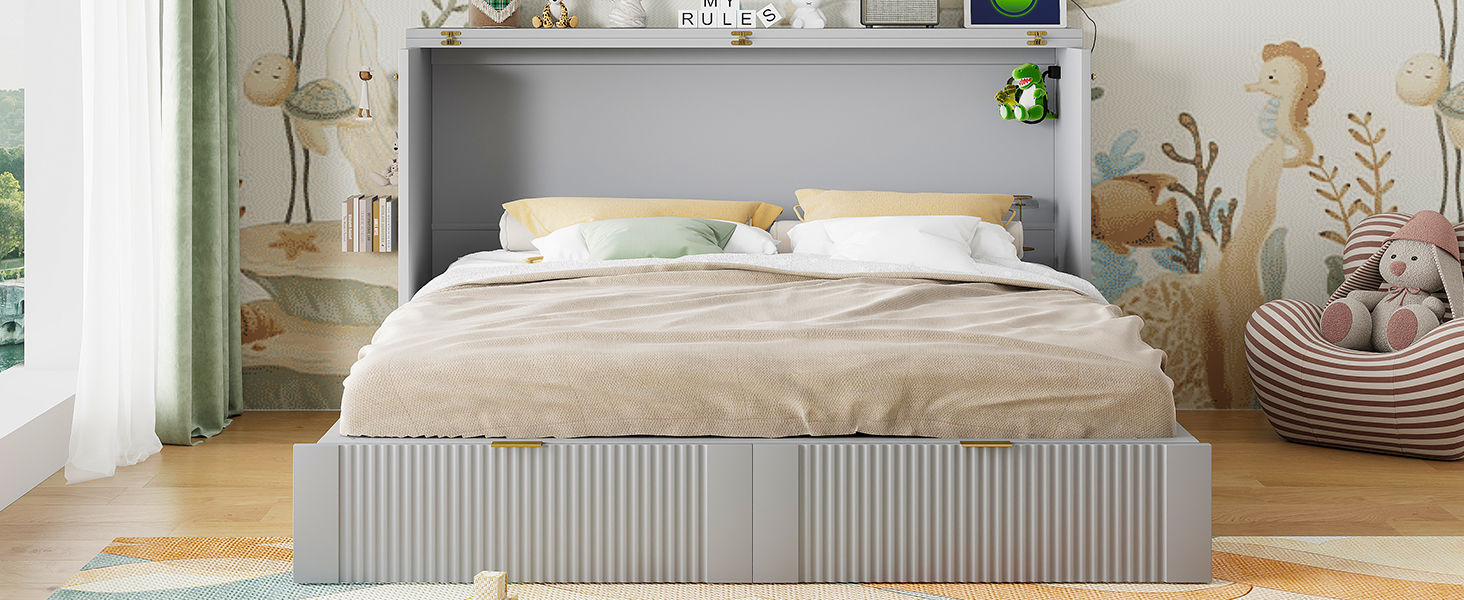 - [Multi-function] This Murphy bed can be turned into a cabinet with the roller skate to open up floor space in any room. A wall bed is the ideal space-saving furniture for a multi-use guest room, home office, or home gym.The sockets and USB ports on the right side of the bed is a convenient piece for you.There are also a big drawer for you when the bed is turn into a cabinet.