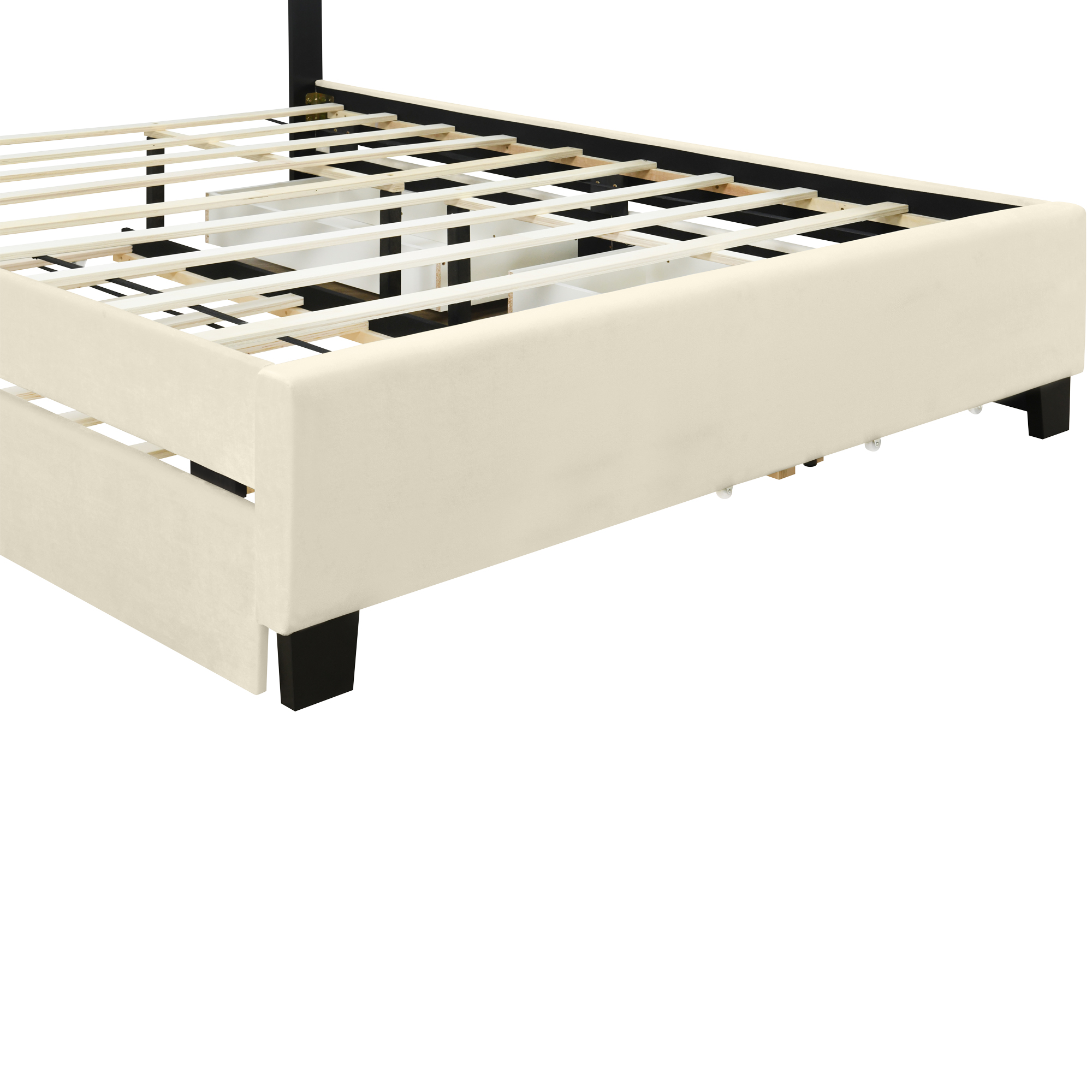 (Price Includes Shipping, No Tax Fee.)Enhance your bedroom decor with the opulent gold metal trim on the plush velvet upholstery, complementing any decor style effortlessly. Perfect for guest rooms or shared spaces, the trundle bed effortlessly expands for extra sleeping space, while the integrated drawers provide ample room for linens and essentials. Enjoy ample sleeping space with the spacious queen-size dimensions, ideal for a luxurious and restful night’s sleep. Transform your bedroom into a sanctuary of style and comfort with our Luxury Velvet Upholstered Bed, where luxury meets practicality in every detail. Designed to last, our bed boasts a sturdy frame capable of supporting up to 530lbs, ensuring durability and reliability. ensuring stability and durability for years to come.