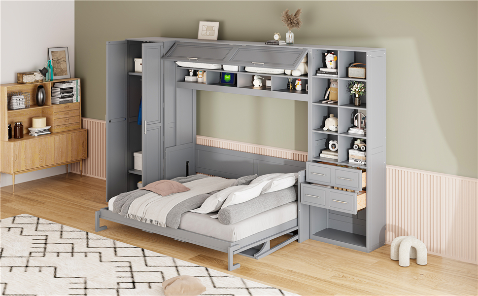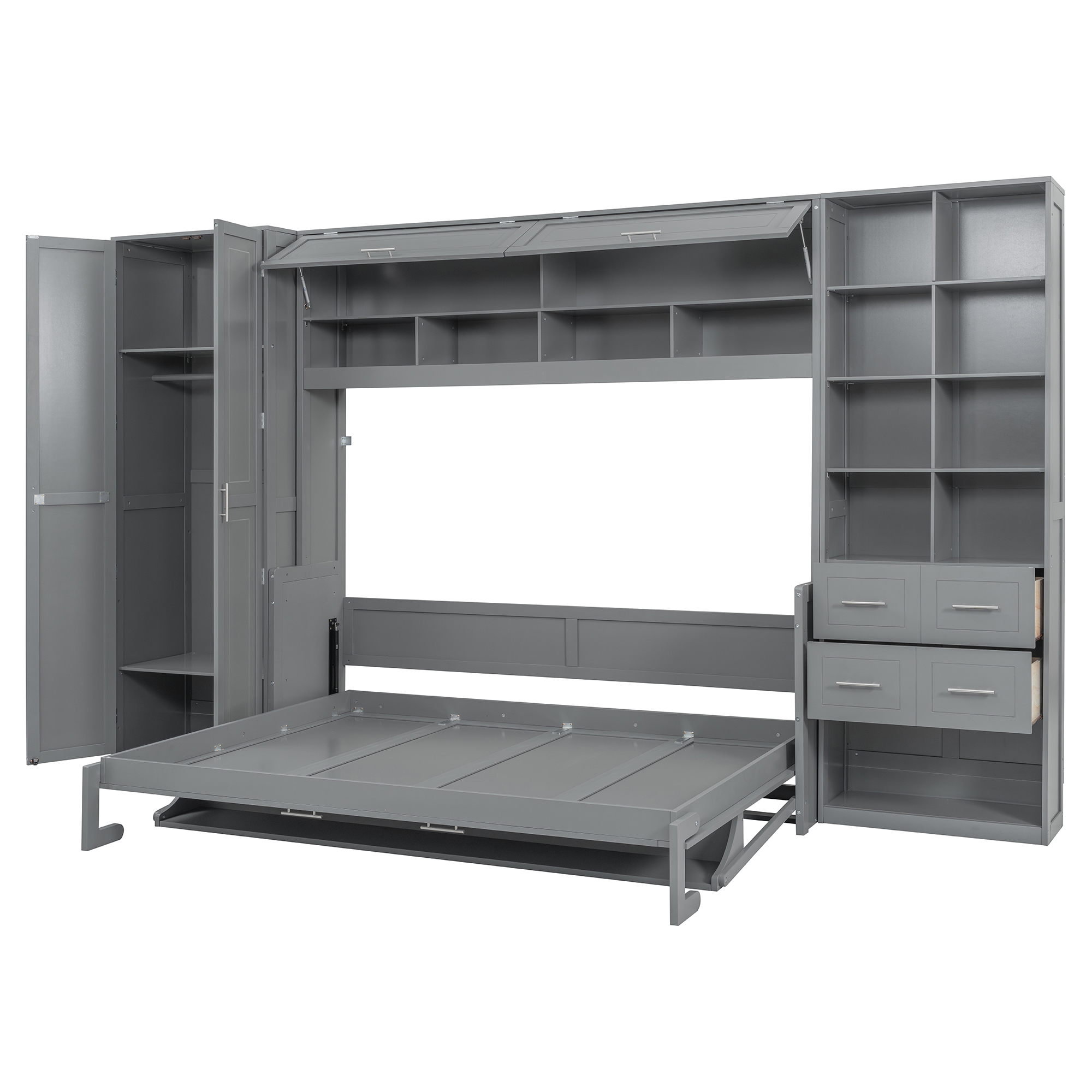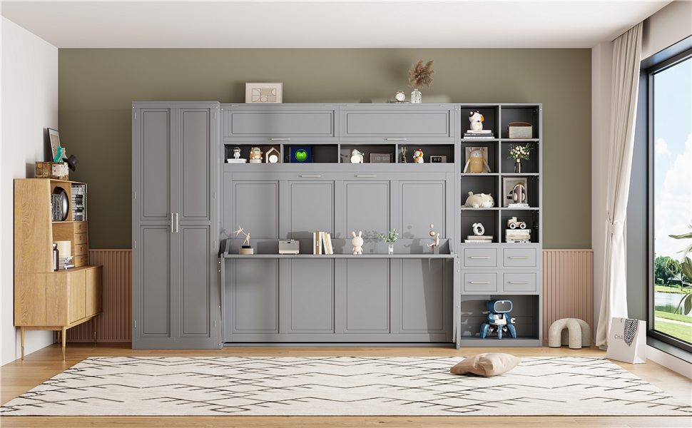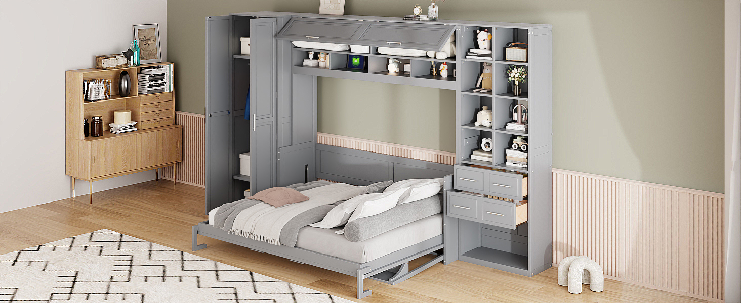 Queen Size Wall Bed with Closet, Drawers and Shelves