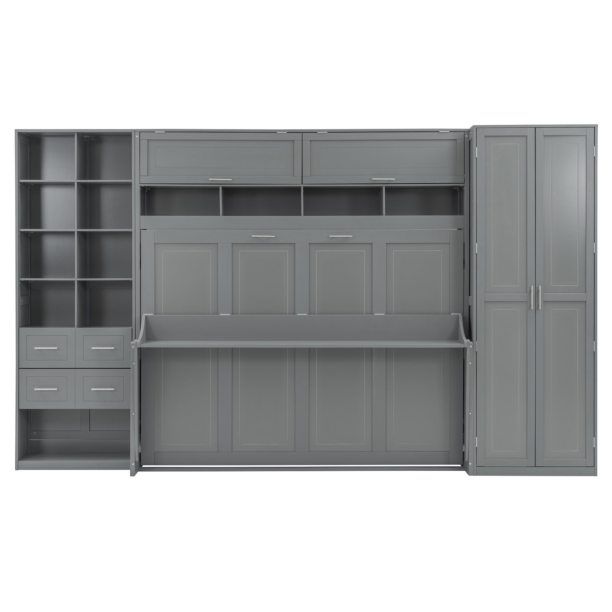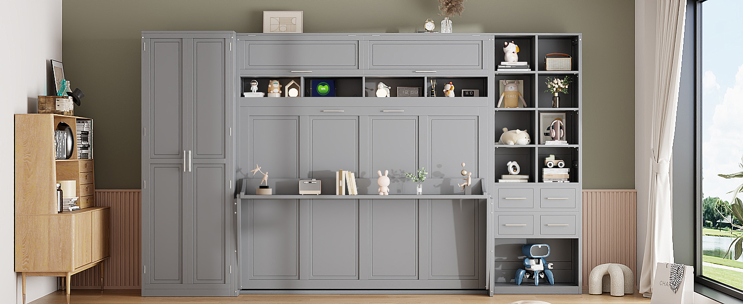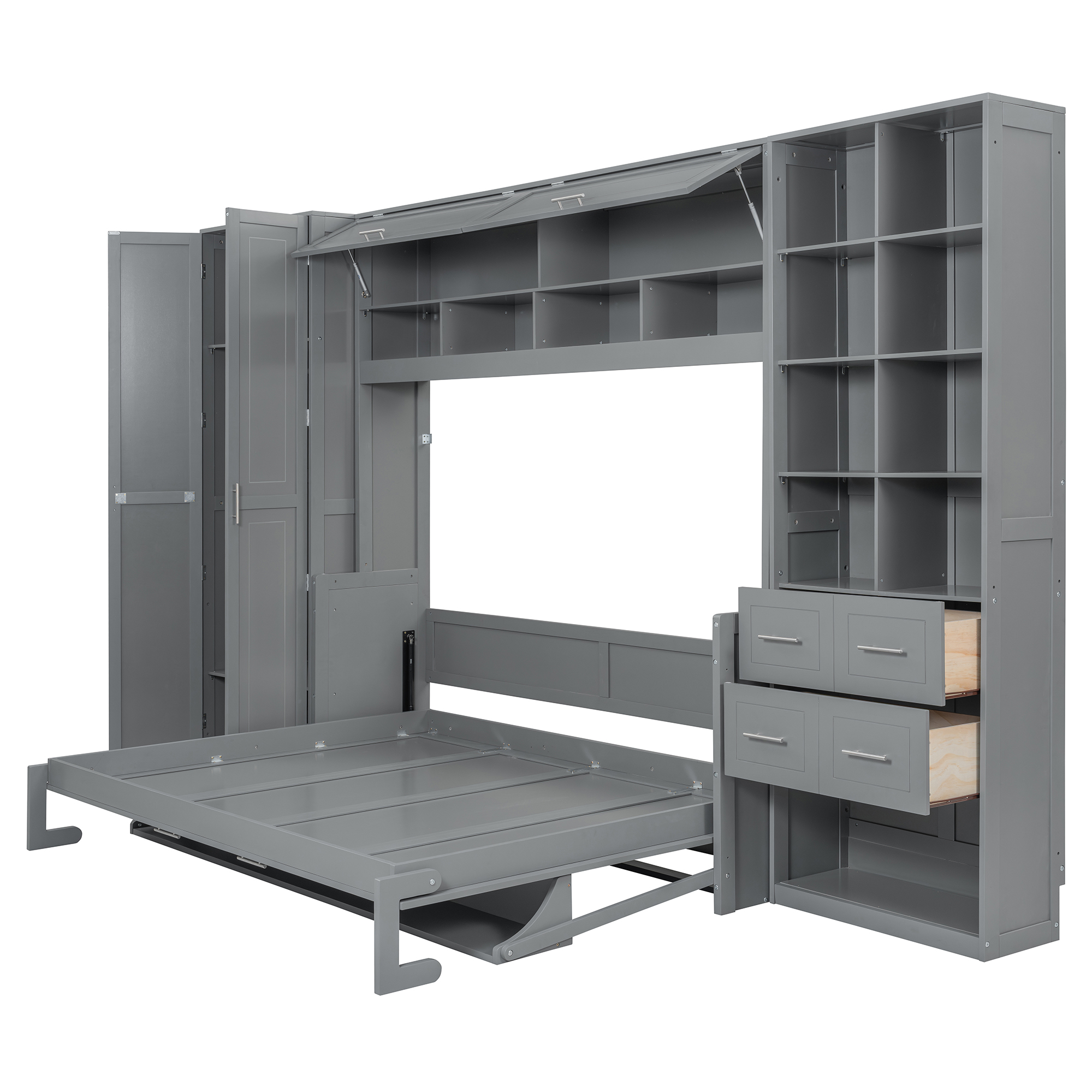 Queen Size Wall Bed with Closet, Drawers and Shelves
