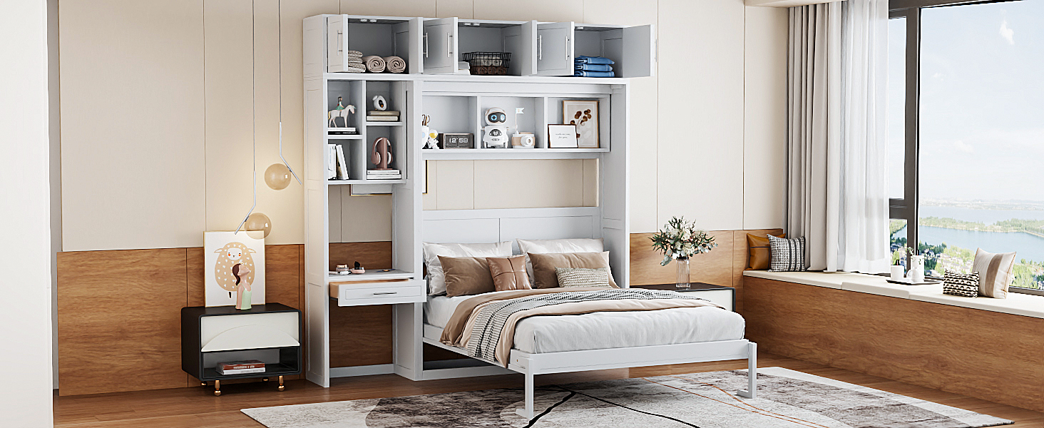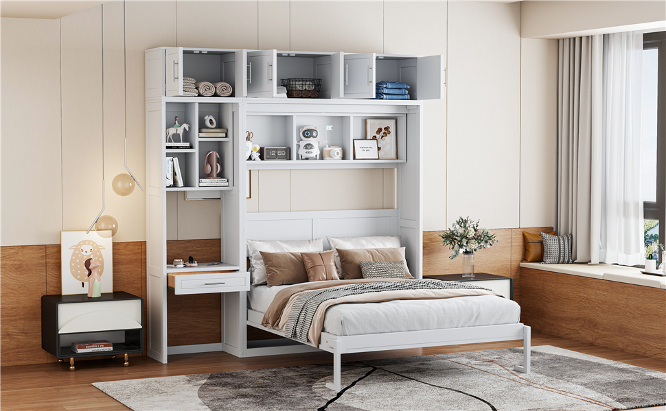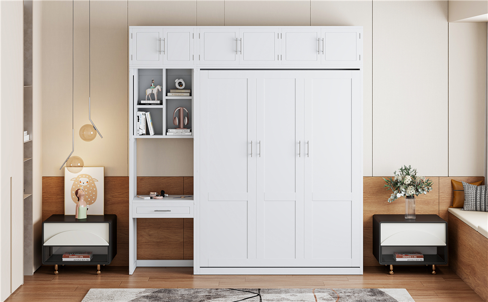 Transform your space with this queen-size Murphy bed, expertly designed to combine comfort, storage, and functionality. Featuring three spacious overhead cabinets, integrated side shelves, top display shelving, and a built-in desk, this all-in-one solution maximizes every inch of your home. Whether you’re living in a compact apartment, a studio, or setting up a multifunctional guest room, this bed adapts to your lifestyle. The seamless wall bed design folds away easily when not in use, creating an open and tidy environment. Crafted for both everyday sleep and smart organization, it offers the perfect balance of practicality and modern style.