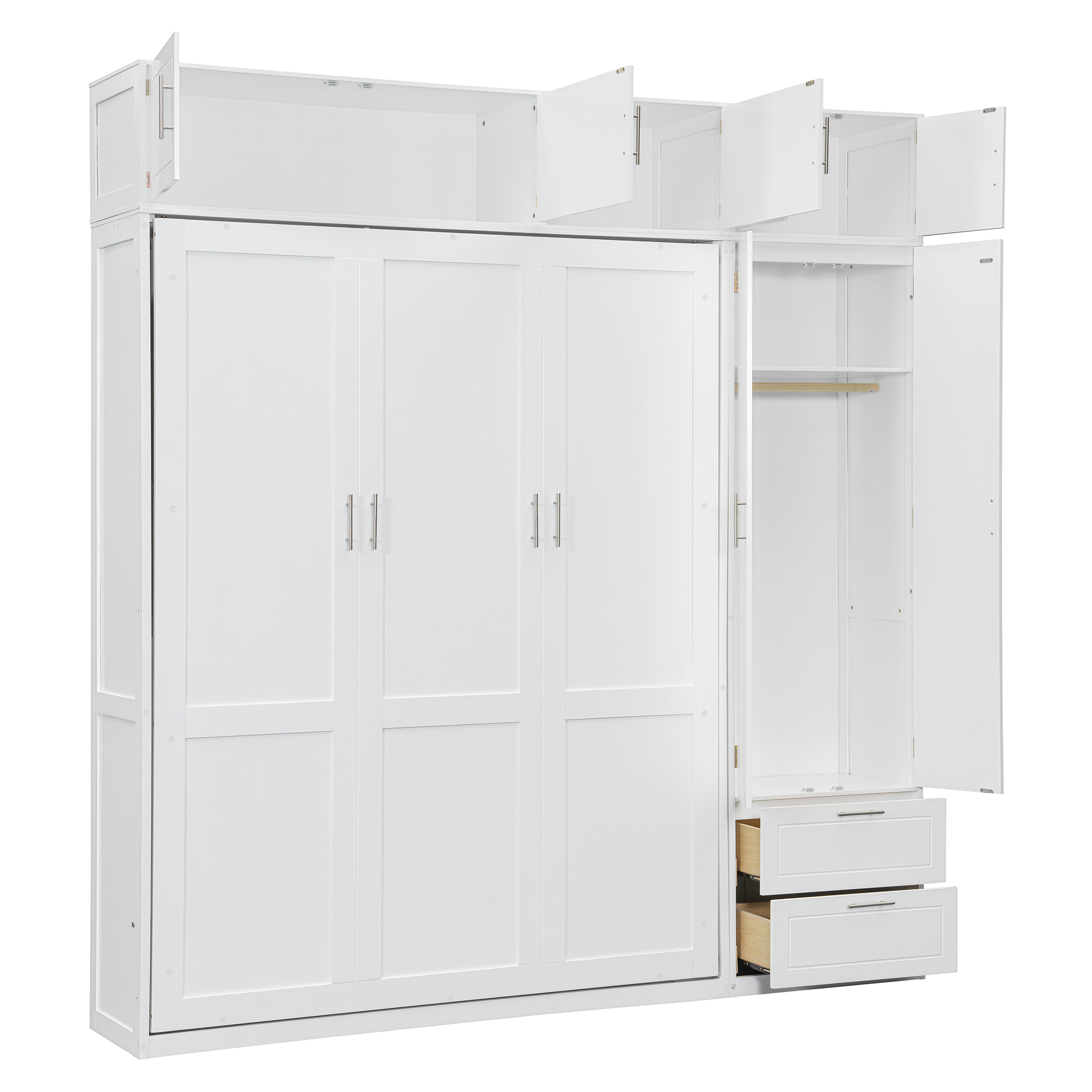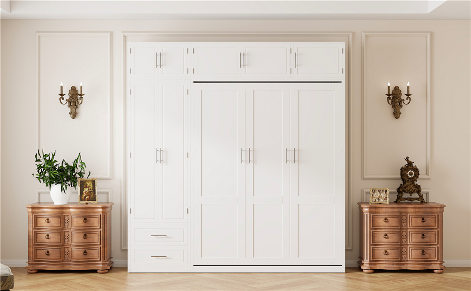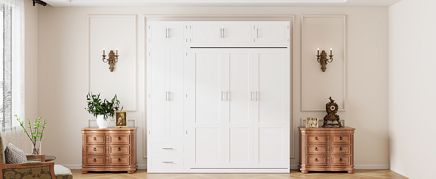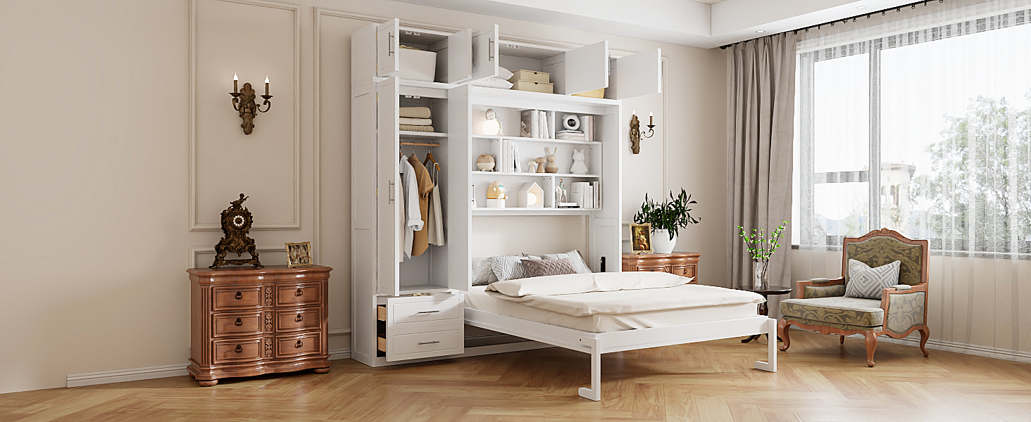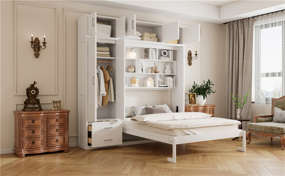Maximize your space with this queen-size Murphy bed, designed to offer a complete storage and sleeping solution. It features three spacious top storage cabinets, a triple-tier top shelf, a side wardrobe, and two large drawers, making it perfect for small apartments or multifunctional rooms. This innovative bed combines sleeping, storage, and organization in one compact design, offering a smart way to optimize your living space. Whether for everyday use or occasional guests, this Murphy bed allows you to make the most of limited space without sacrificing comfort or convenience. The sleek design ensures it fits seamlessly into any modern home, providing both functionality and style.