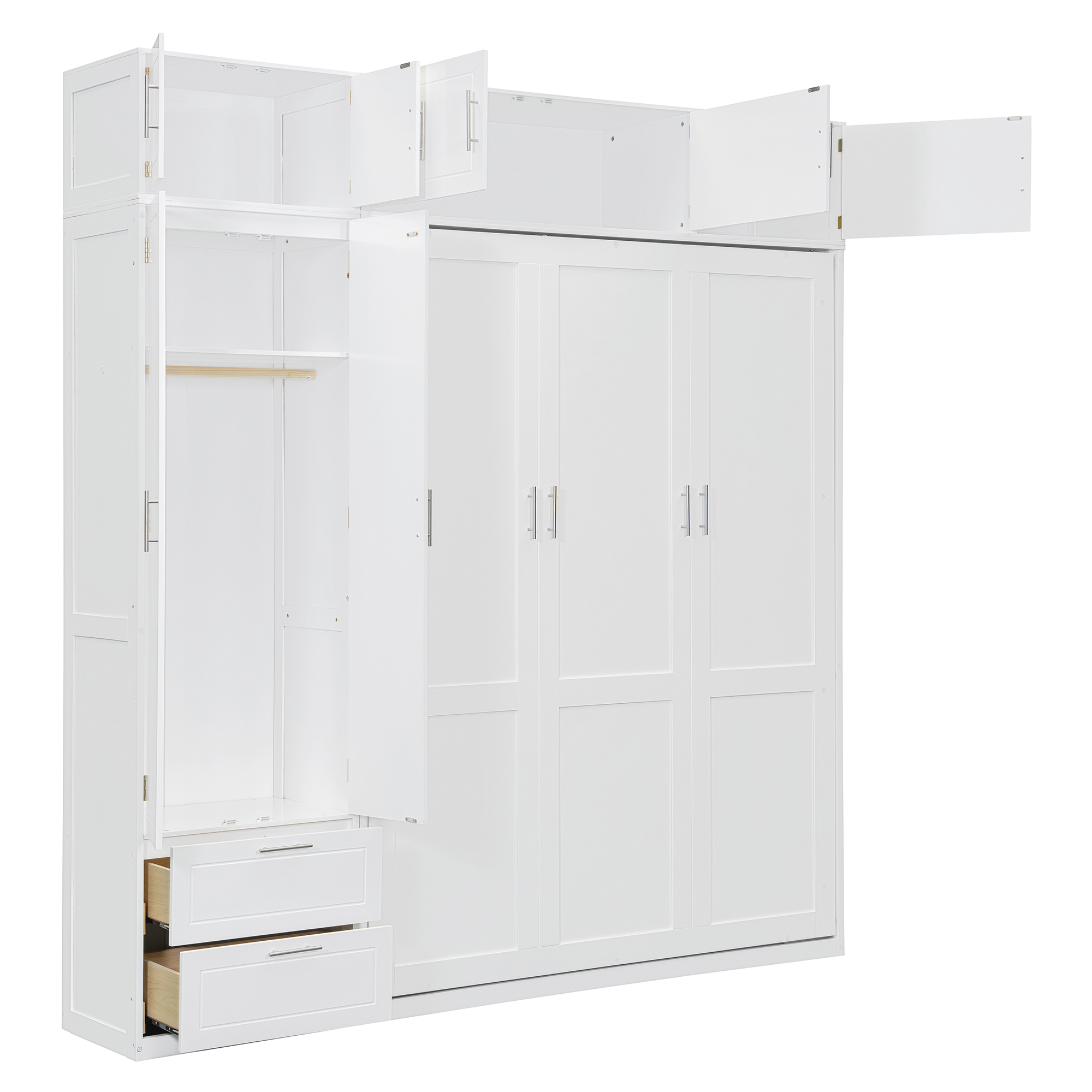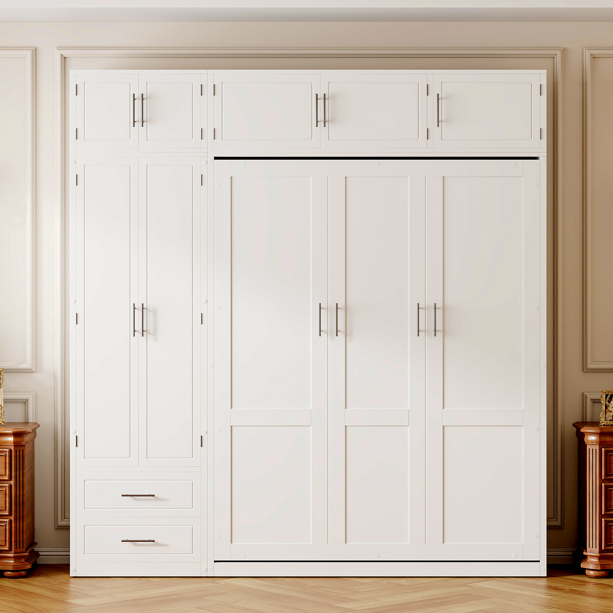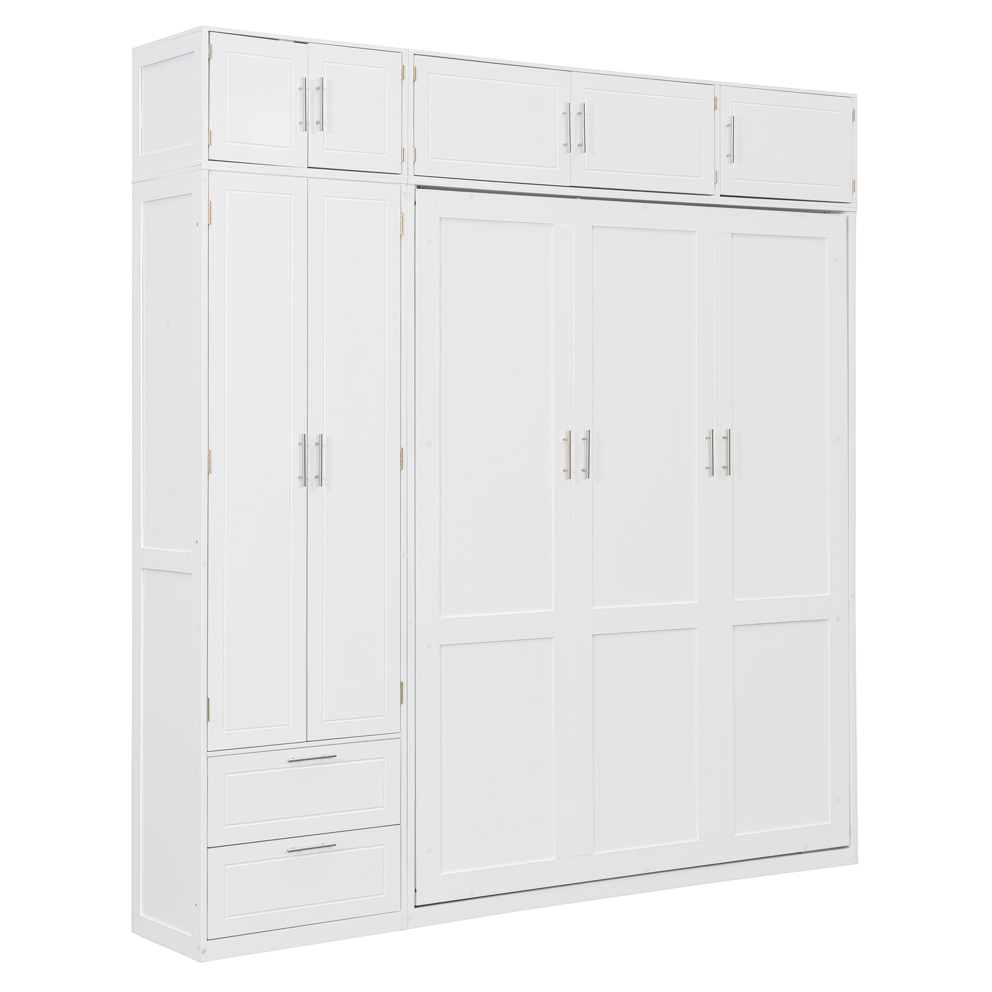 Maximize your space with this queen-size Murphy bed, designed to offer a complete storage and sleeping solution. It features three spacious top storage cabinets, a triple-tier top shelf, a side wardrobe, and two large drawers, making it perfect for small apartments or multifunctional rooms. This innovative bed combines sleeping, storage, and organization in one compact design, offering a smart way to optimize your living space. Whether for everyday use or occasional guests, this Murphy bed allows you to make the most of limited space without sacrificing comfort or convenience. The sleek design ensures it fits seamlessly into any modern home, providing both functionality and style.