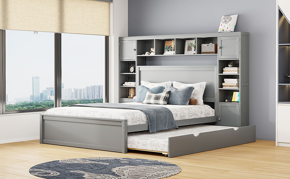 - [Flexible storage space] 2 drawers and trundle under the bed can be slided in and out very smoothly, which takes full advantage of the space under the bed. You can store your bedding or clothes and making your bedroom more tidy. There are 10 shelf cubes and 4 cabinets designed at the side of the headboard, you can put in whatever you want into them. You can make the headboard a wonderful decor place that ever has.