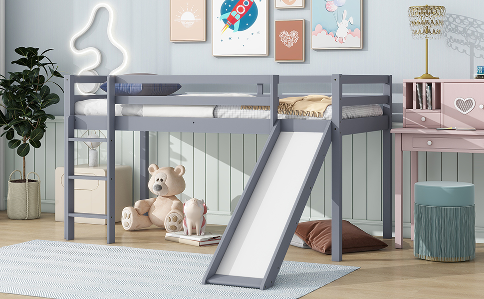 This low loft bed, complete with a slide, boasts a refined and sleek style, highlighting its elegance and simplicity. The adaptable framework beneath the loft bed allows for versatile use, seamlessly integrating a sleeping and play environment for children at the same time. This loft bed with slide has great capacity of creating many restful nights and entertainment time. making this loft bed the outstanding centerpiece to any bedroom.
