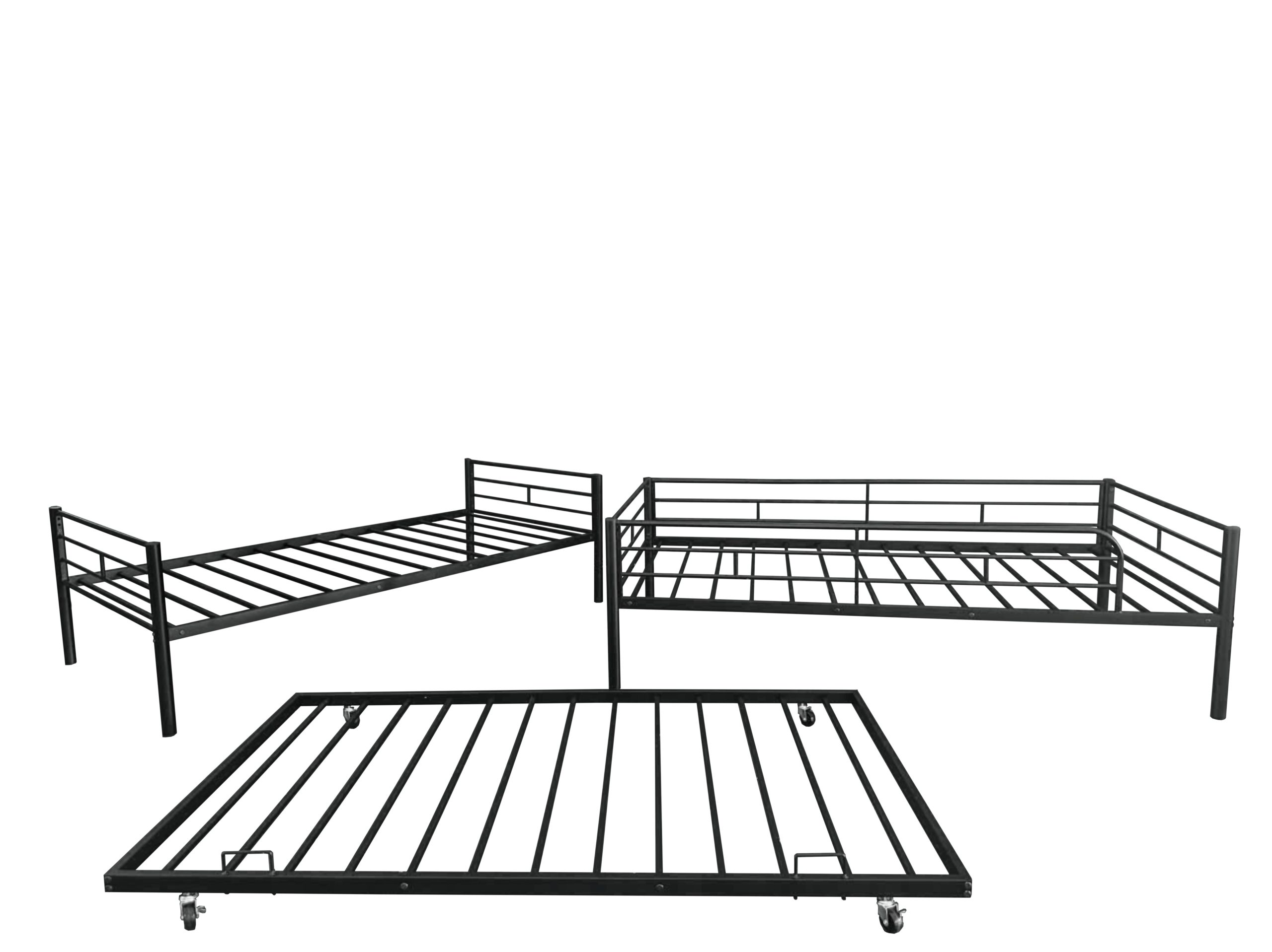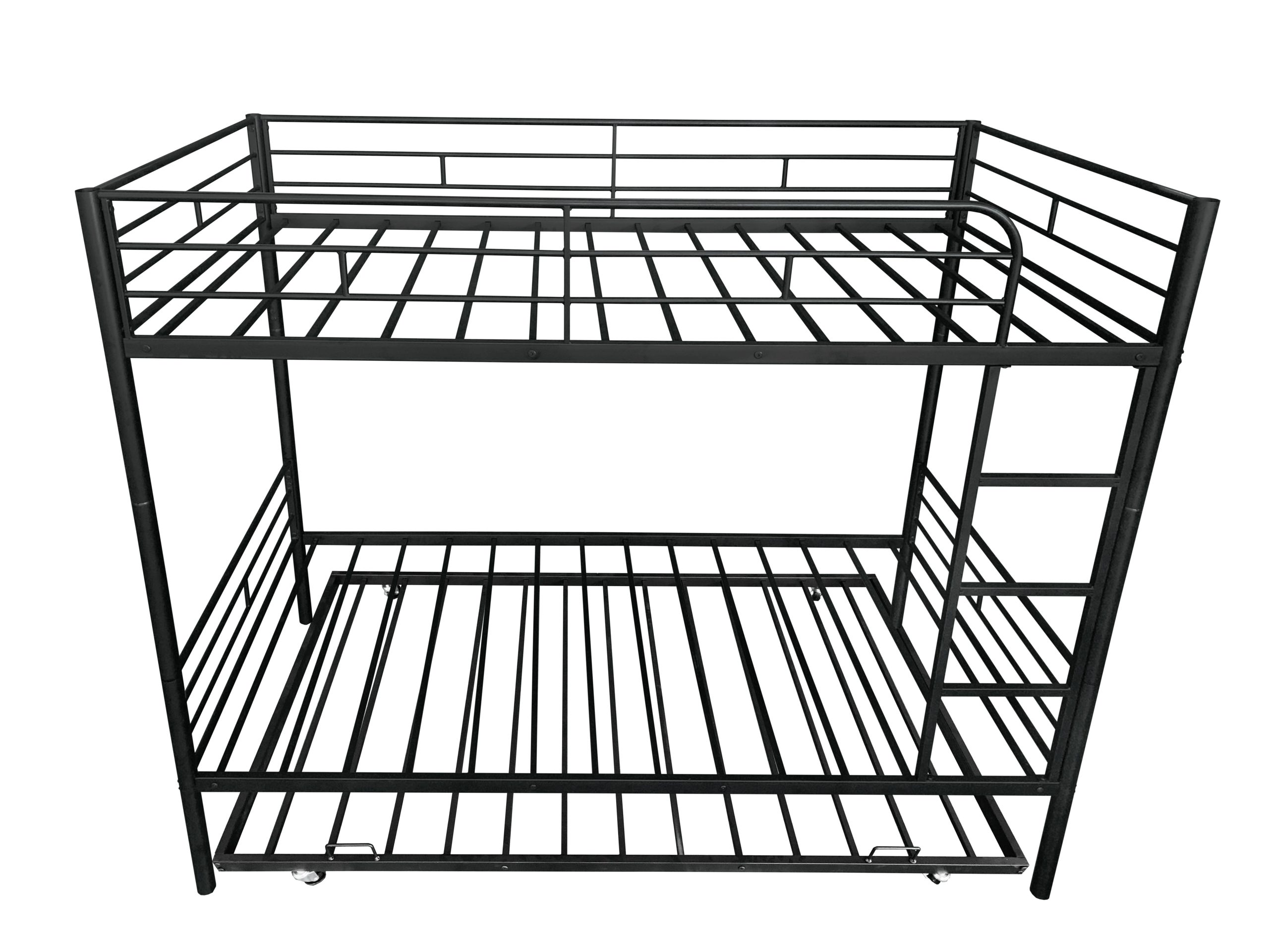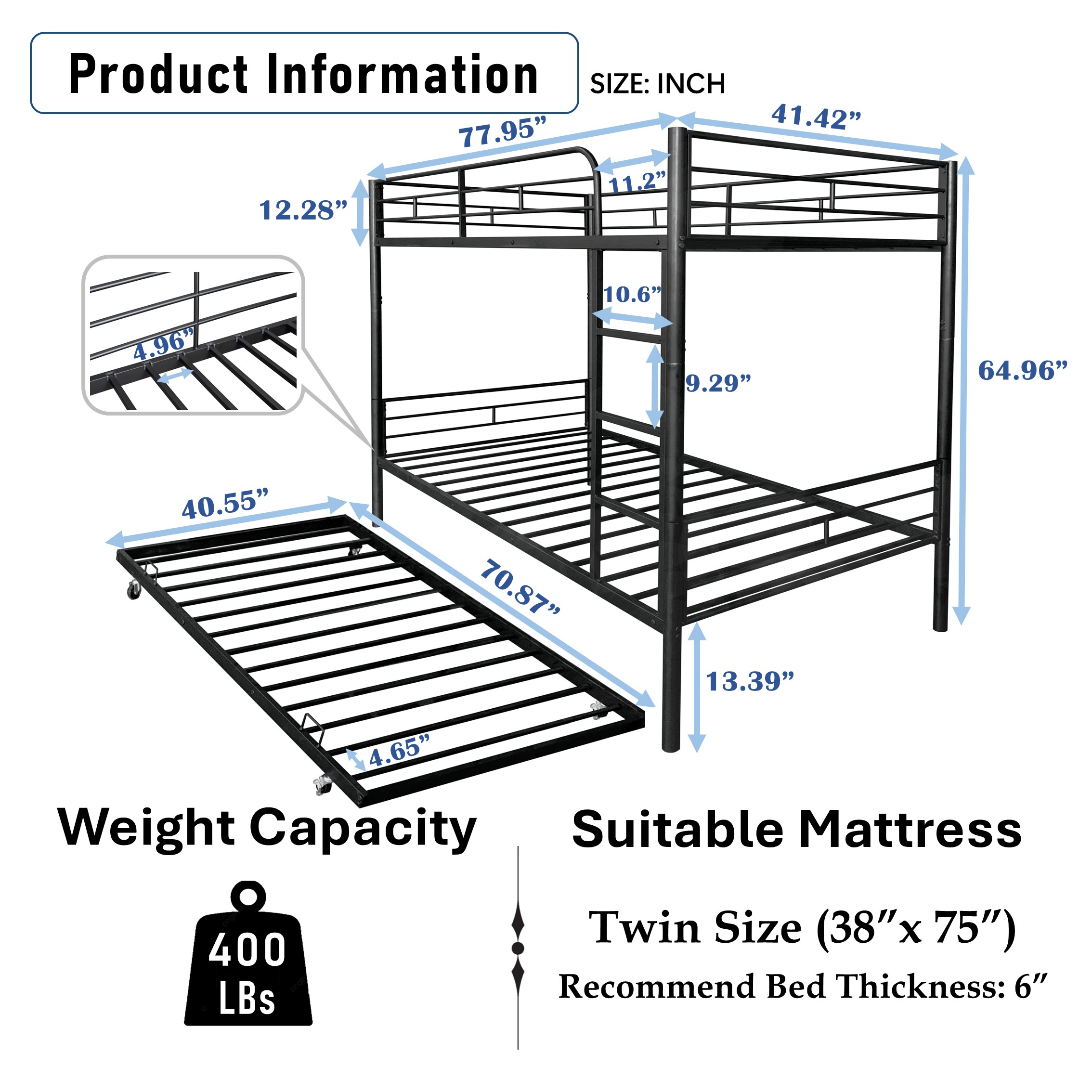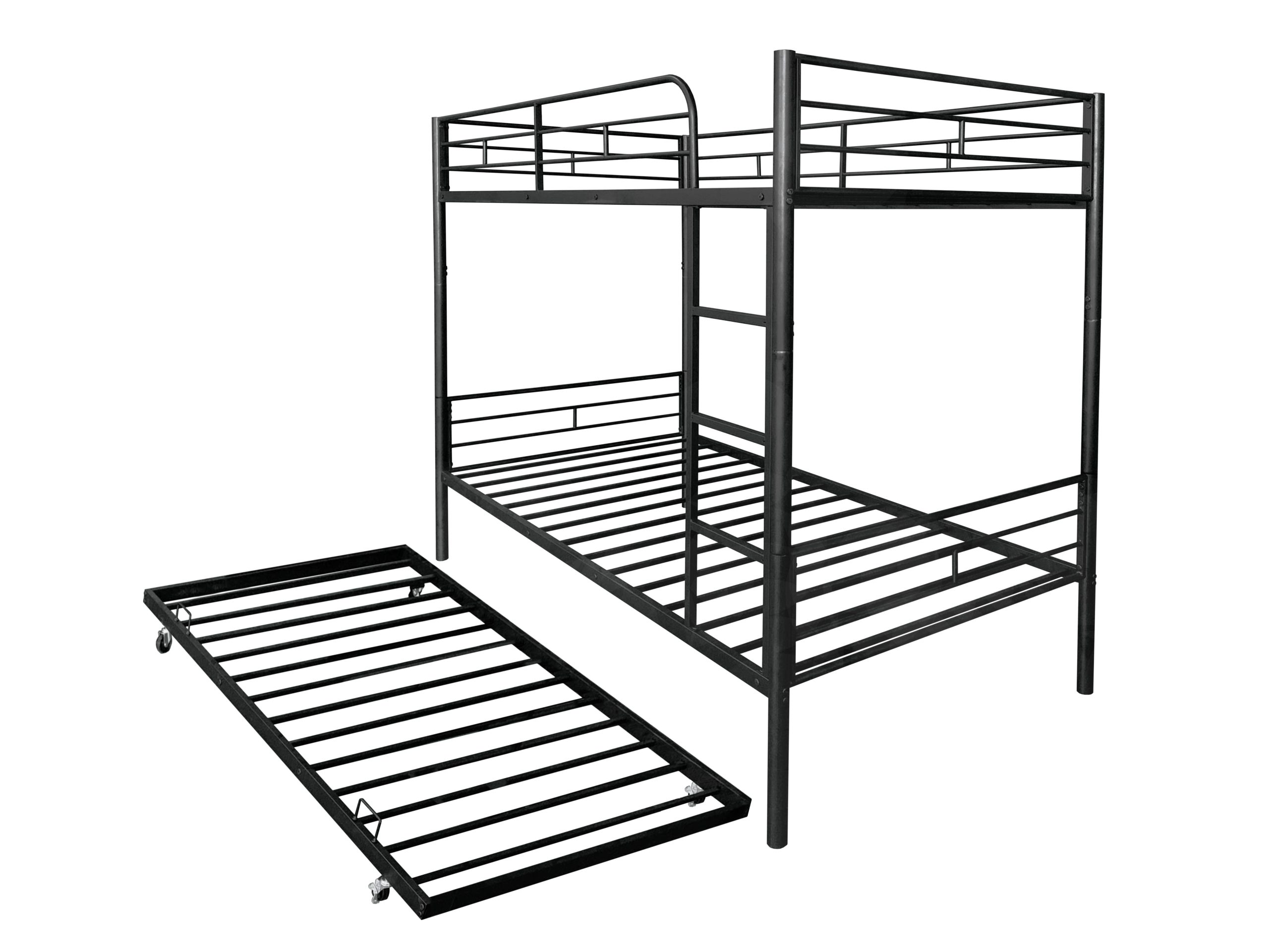 (Price Includes Shipping, No Tax Fee.)Made of sturdy steel with anti-rust coating, this twin over twin bunk bed is solid and durable to meet the heavy-duty load support. The bunk design doesn’t only save the sleeping space. The clearance underneath the bottom bed also provides the storage space for your belongings. With the detachable design, this bunk bed can be separated to 2 twin beds, depending on what you need. Hidden trundle underneath the bunk creates an extra space for guest or sleepover. This twin over twin bunk bed with trundle is a perfect space-saving solution for you to choose.