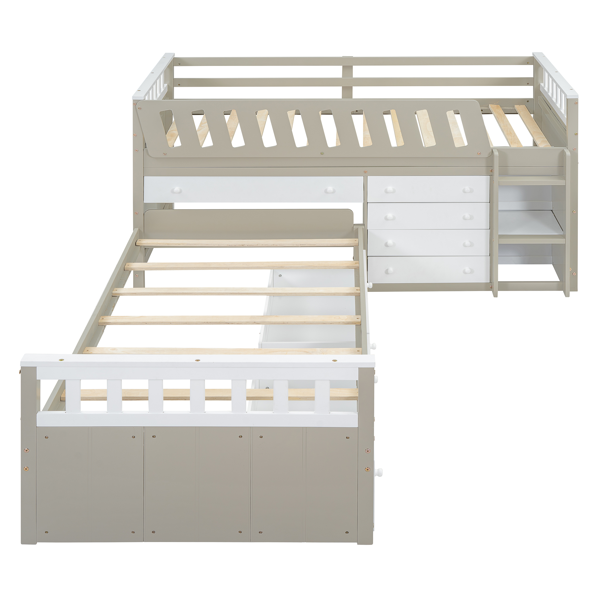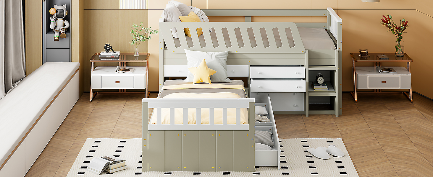 - [Functional and Stylish Loft and Platform Bed Combination]: Discover the perfect blend of functionality and style with our Loft and Platform Bed combination, featuring two twin-size beds. This innovative design includes a platform bed with two large side drawers for ample storage, alongside a loft bed equipped with five additional drawers, providing a total of seven drawers for all your storage needs. Crafted from durable pine wood, MDF, and plywood, this bed is built to last.