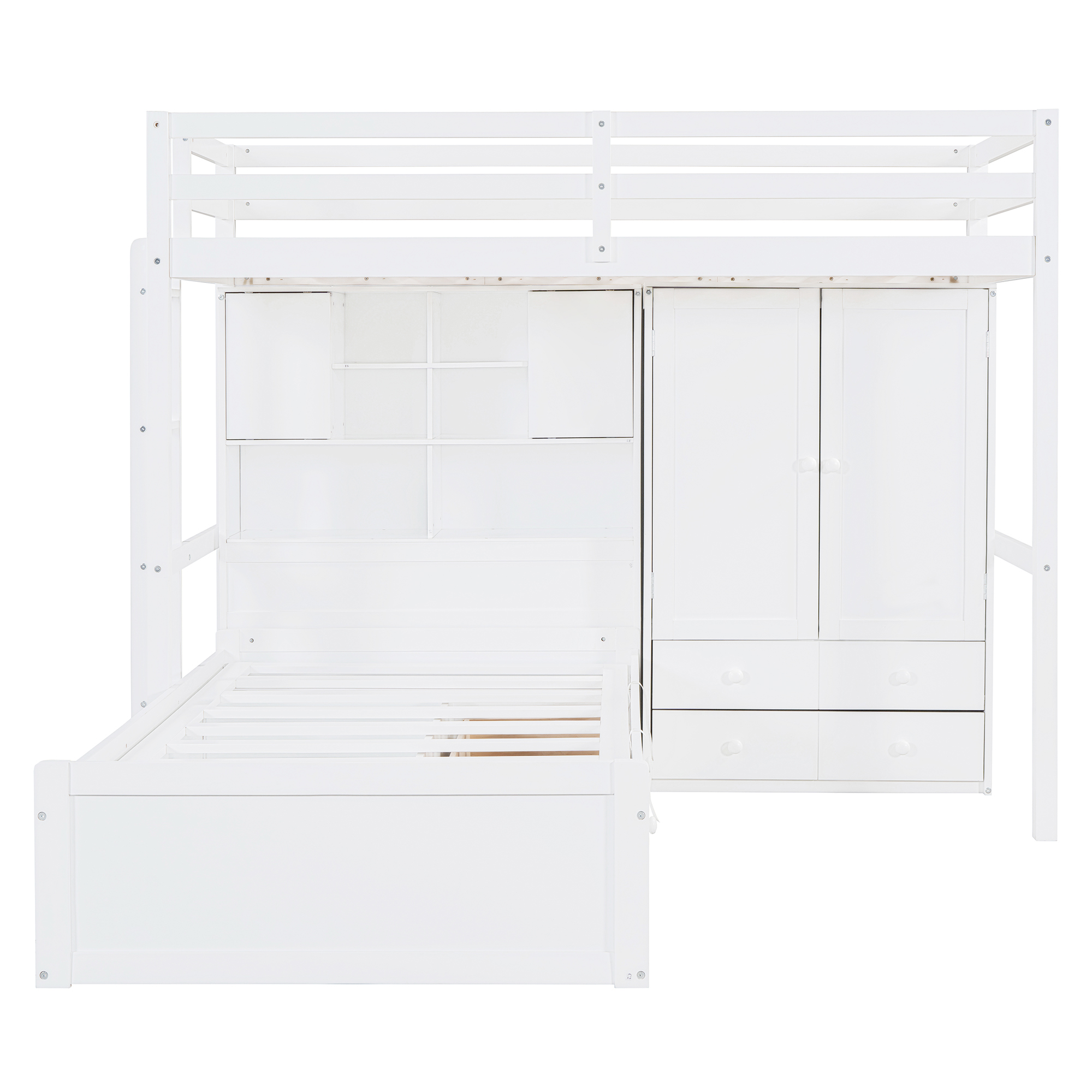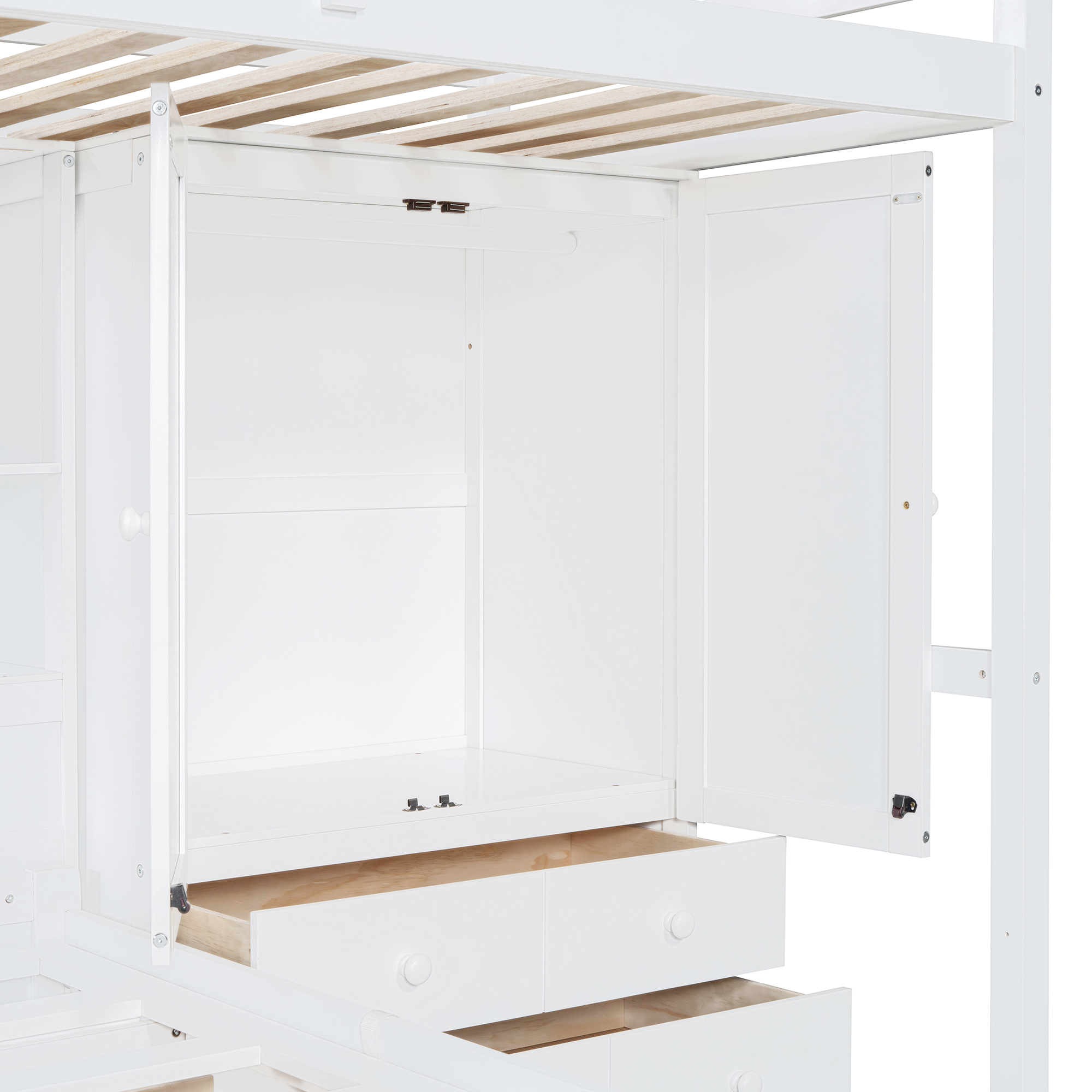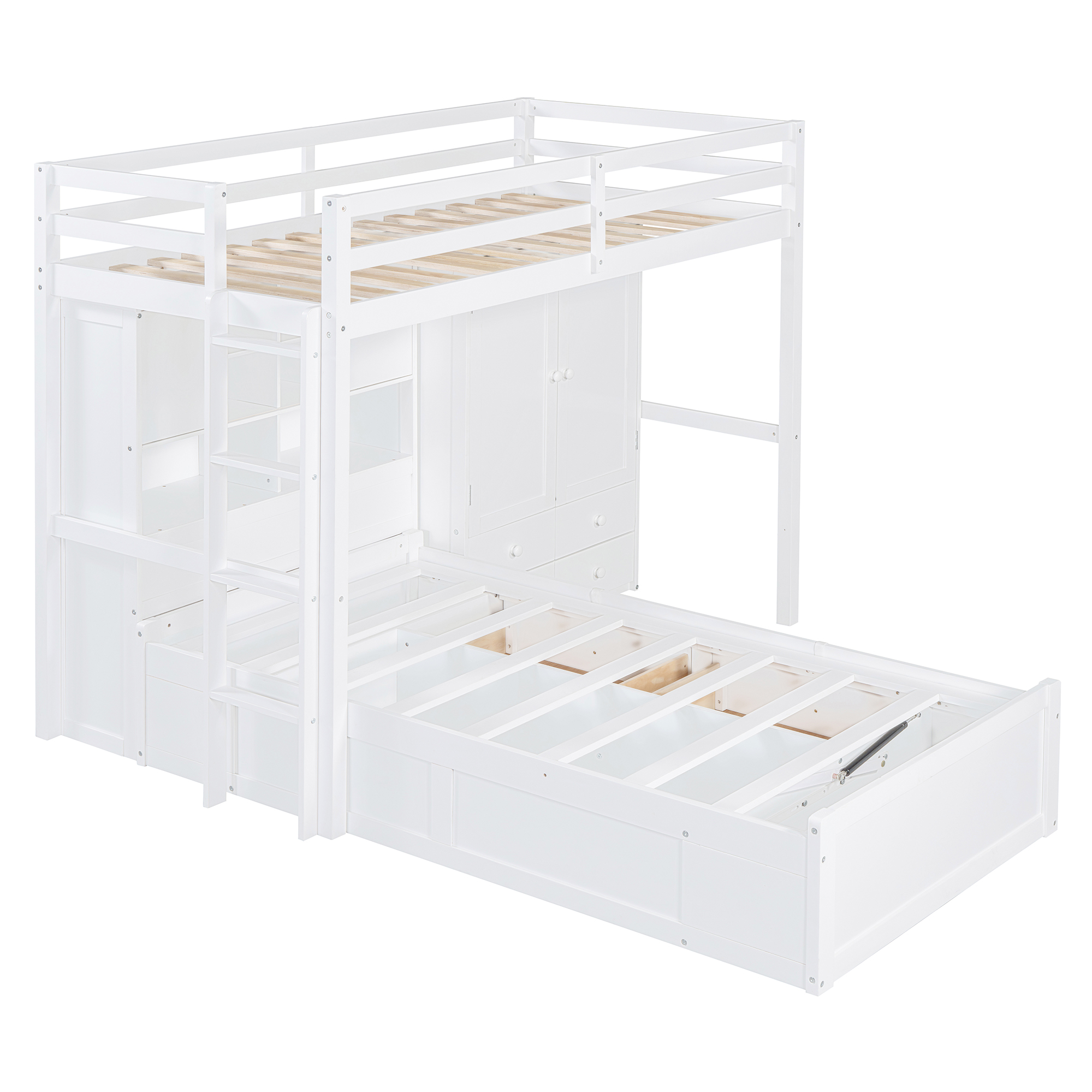 Twin Bunk Bed with Drawers, Wardrobe, Storage Shelves and Hydraulic Bed